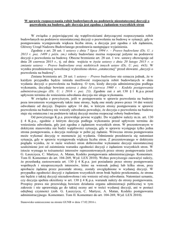 W sprawie rozpoczynania robót budowlanych na podstawie nieostatecznej decyzji o pozwoleniu na budowę, gdy decyzja jest zgodna z żądaniem wszystkich stron W związku z pojawiającymi się wątpliwościami dotyczącymi rozpoczynania robót budowlanych na podstawie nieostatecznej decyzji o pozwoleniu na budowę w sytuacji, gdy w postępowaniu występowała większa liczba stron, a decyzja jest zgodna z ich żądaniem, Główny Urząd Nadzoru Budowlanego przedstawia następujące wyjaśnienia. Zgodnie z art. 28 ust. 1 ustawy z dnia 7 lipca 1994 r. – Prawo budowlane (Dz. U. z 2013 r. poz. 1409 z późn. zm.) roboty budowlane można rozpocząć jedynie na podstawie decyzji o pozwoleniu na budowę. Obecne brzmienie art. 28 ust. 1 ww. ustawy obowiązuje od dnia 28 czerwca 2015 r., tj. od dnia wejścia w życie ustawy z dnia 20 lutego 2015 r. o zmianie ustawy – Prawo budowlane oraz niektórych innych ustaw (Dz. U. poz. 443). W wyniku przedmiotowej nowelizacji wykreślono słowo „ostatecznej” przed słowami „decyzji o pozwoleniu na budowę”. Zmiana brzmienia art. 28 ust. 1 ustawy – Prawo budowlane nie oznacza jednak, że w każdym przypadku będzie istniała możliwość rozpoczęcia robót budowlanych w dniu wydania decyzji o pozwoleniu na budowę. O tym, kiedy decyzja administracyjna podlega wykonaniu, decyduje bowiem ustawa z dnia 14 czerwca 1960 r. - Kodeks postępowania administracyjnego (Dz. U. z 2016 r. poz. 23). Zgodnie zaś z art. 130 § 1 K.p.a. przed upływem terminu do wniesienia odwołania decyzja nie ulega wykonaniu. W związku z powyższym, jeśli w postępowaniu w sprawie pozwolenia na budowę poza inwestorem występowały także inne strony, będą one miały prawo przez 14 dni wnieść odwołanie od decyzji. Dopiero upływ 14 dni, w którym strony postępowania w sprawie pozwolenia na budowę nie wniosły odwołania powoduje, że decyzja o pozwoleniu na budowę staje się ostateczna i na podstawie takiej decyzji można rozpocząć roboty budowlane. Od powyższego K.p.a. przewiduje pewne wyjątki. Do wyjątków należy m.in. art. 130 § 4 K.p.a., zgodnie z którym decyzja podlega wykonaniu przed upływem terminu do wniesienia odwołania, gdy jest zgodna z żądaniem wszystkich stron. W prezentowanym w doktrynie stanowisku nie budzi wątpliwości sytuacja, gdy w sprawie występuje tylko jedna strona postępowania, a decyzja realizuje w pełni jej żądanie. Wówczas strona postępowania może wykonać decyzję w momencie jej wydania. Odmiennie przedstawia się natomiast sytuacja, gdy w sprawie występowała większa liczba stron. Z prezentowanego w doktrynie poglądu wynika, że w razie wielości stron dobrowolne wykonanie decyzji nieostatecznej uzależnione jest od zaistnienia warunku zgodności decyzji z żądaniem wszystkich stron. W istocie wymaga to tożsamości interesów reprezentowanych przez strony postępowania (zob. G. Łaszczyca, C. Martysz, A. Matan, Kodeks postępowania administracyjnego. Komentarz. Tom II. Komentarz do art. 104-269, Wyd. LEX 2010). Wobec powyższego zauważyć należy, że przesłanką zastosowania art. 130 § 4 K.p.a. jest posiadanie przez strony postępowania wspólnych i niesprzecznych interesów, które na wniosek jednej lub kilku stron, przy aprobacie żądania przez pozostałe strony, zostały uwzględnione w wydanej decyzji. W przypadku zgodności decyzji z żądaniem wszystkich stron brak będzie przekonania, że strona nie będzie z takiej decyzji niezadowolona i nie wniesie od niej odwołania. Natomiast uznanie, czy decyzja spełnia określony w art. 130 § 4 K.p.a. warunek należy do strony postępowania. Przepisy prawa nie przewidują bowiem działania organu administracji publicznej w tym zakresie i nie uprawniają go do takiej oceny ani w treści wydanej decyzji, ani w postaci odrębnej czynności (zob. G. Łaszczyca, C. Martysz, A. Matan, Kodeks postępowania administracyjnego. Komentarz. Tom II. Komentarz do art. 104-269, Wyd. LEX 2010). Stanowisko umieszczone na stronie GUNB w dniu 17.02.2016 r.