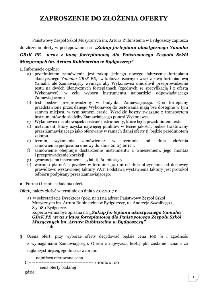 ZAPROSZENIE DO ZŁOŻENIA OFERTY Państwowy Zespół Szkół Muzycznych im. Artura Rubinsteina w Bydgoszczy zaprasza do złożenia oferty w postępowaniu na „Zakup fortepianu akustycznego Yamaha GB1K PE wraz z ławą fortepianową dla Państwowego Zespołu Szkół Muzycznych im. Artura Rubinsteina w Bydgoszczy” 1. Informacje ogólne: a) przedmiotem zamówienia jest zakup jednego nowego fabrycznie fortepianu akustycznego Yamaha GB1K PE, w kolorze czarnym wraz z ławą fortepianową Yamaha ale Zamawiający wymaga aby Wykonawca umożliwił przeprowadzenie testu na dwóch identycznych fortepianach (zgodnych ze specyfikacją i z ofertą Wykonawcy), w celu wyboru instrumentu najbardziej odpowiadającego Zamawiającemu b) test będzie przeprowadzony w budynku Zamawiającego. Oba fortepiany przedstawione przez danego Wykonawcę do testowania mają być dostępne w tym samym miejscu, w tym samym czasie. Wszelkie koszty związane z transportem instrumentów do siedziby Zamawiającego ponosi Wykonawca. c) Wykonawca ma obowiązek nastroić instrumenty, które będą przedmiotem testu d) instrument, który uzyska najwięcej punktów w teście jakości, będzie traktowany przez Zamawiającego jako oferowany w ramach danej oferty tj. będzie przedmiotem zakupu. e) termin wykonania zamówienia: w terminie od dnia złożenia zamówienia/podpisania umowy do dnia 20.03.2017 r. f) zamówienie obejmuje dostarczenie instrumentu z wniesieniem, jego montaż i przeprowadzenie korekcji g) gwarancja na instrument – 5 lat, tj. 60 miesięcy h) warunki płatności: przelew w terminie 30 dni od dnia otrzymania od dostawcy prawidłowo wystawionej faktury VAT. Podstawą wystawienia faktury jest protokół odbioru podpisany przez Zamawiającego. 2. Forma i termin składania ofert. Ofertę należy złożyć w terminie do dnia 22.02.2017 r. a) w sekretariacie Dyrektora (pok. nr 2) na adres: Państwowy Zespół Szkół Muzycznych im. Artura Rubinsteina w Bydgoszczy, ul. Andrzeja Szwalbego 1, 85-080 Bydgoszcz. Koperta winna być opisana na „Zakup fortepianu akustycznego Yamaha GB1K PE wraz z ławą fortepianową dla Państwowego Zespołu Szkół Muzycznych im. Artura Rubinsteina w Bydgoszczy” lub 3. Ocena ofert: przy wyborze oferty decydować będzie cena 100 % i zgodność z wymaganiami Zamawiającego. Oferta z najwyższą liczbą pkt zostanie uznana za najkorzystniejszą, zgodnie ze wzorem: najniższa oferowana cena C = --------------------------------------- x 100% x 100 cena oferty badanej gdzie: 1 C - wartość punktowa badanej oferty 4. W cenie należy uwzględnić wszelkie koszty niezbędne do realizacji zamówienia oraz ewentualne upusty. 5. W załączeniu : 1) opis przedmiotu zamówienia – warunki realizacji zamówienia – załącznik nr 1 do zaproszenia 2) projekt umowy – załącznik nr 2 do zaproszenia Bydgoszcz, dnia 15.02.2017r. Załącznik nr 1 do zaproszenia Warunki realizacji zadania Przedmiotem zamówienia jest: „Zakup fortepianu akustycznego Yamaha GB1K PE dla Państwowego Zespołu Szkół Muzycznych im. Artura Rubinsteina w Bydgoszczy” wg poniższej specyfikacji: Fortepian spełniający poniższe parametry techniczne: 88 klawiszy 3 pedały ( środkowy pedał : sostenuto) elementy ruchome akcji mechanizmu klawiaturowego wykonane z litego, sezonowanego drewna belki szkieletowe wykonane z twardego, sprężystego drewna, rozłożone promieniście i połączone wczepieniowo z ramą szkieletu płyta rezonansowa wykonana z litego świerku rezonansowego, deski łączone ze sobą krawędziowo ożebrowanie płyty rezonansowej wykonane z litego świerku rezonansowego, 10 żeber struny w rejestrze basowym owinięte drutem z czystej miedzi belki stroikowe wykonane z twardego buku łączone żywicą mostki – z drewna klonu z klonową nakładką, kołek stroikowy wykonany ze stali hartowanej, niklowany, gwint wielokrotny drobny popychacze klonowe młotki osadzone na trzonkach wykonanych z brzozy o baryłkowym przekroju w części dyszkantowej szyny korpusu mechanizmu grającego tłoczone z aluminium klawiatura wykonana z litego świerku rezonansowego mechanizm łagodnego opuszczania pokrywy klawiatury zabezpieczający przed przypadkowym opadnięciem na ręce pianisty pedały wykonane z odlewu mosiężnego 5 pozycji ustawień pulpitu 2 pozycje otwarcia przykrywy fortepianu mechanizm łagodnego opuszczania pokrywy klawiatury zabezpieczający przed przypadkowym opadnięciem na ręce pianisty pedały wykonane z mosiądzu 2 instrument wykończony lakierem poliestrowym w kolorze czarnym, polerowanym na wysoki połysk długość 151 cm szerokość 149 cm wysokość 99 cm Waga: od 261 kg W komplecie z fortepianem tradycyjna ława do fortepianu HIDRAU MODEL BM21 lub równoważna, spełniająca następujące wymogi techniczne: - podstawa wykonana z rur metalowych o przekroju kwadratowym, wykończonego lakierem na kolor czarny mat. - siedzisko wykończone winylowym materiałem, skóropodobnym o rozmiarach min. 32cm na min. 55 cm. - regulacja mechaniczna wysokości siedziska w zakresie min. 48-57 cm Warunki i dane podane w specyfikacji są minimalnymi parametrami, jakim ma odpowiadać oferowany instrument i ława Nazwy i kody określone we Wspólnym Słowniku Zamówień: 37.30.00.00-1 Instrumenty muzyczne i ich części 37.31.10.00-1 Instrumenty klawiszowe 37.32.10.00-4 Akcesoria do instrumentów muzycznych (ławy - siedziska do instrumentów klawiszowych). Pozdrawiam serdecznie i zapraszam do złożenia oferty Kierownik Administracyjno-Gospodarczy Państwowy Zespół Szkół Muzycznych im. Artura Rubinsteina w Bydgoszczy Marek Dankowski 3