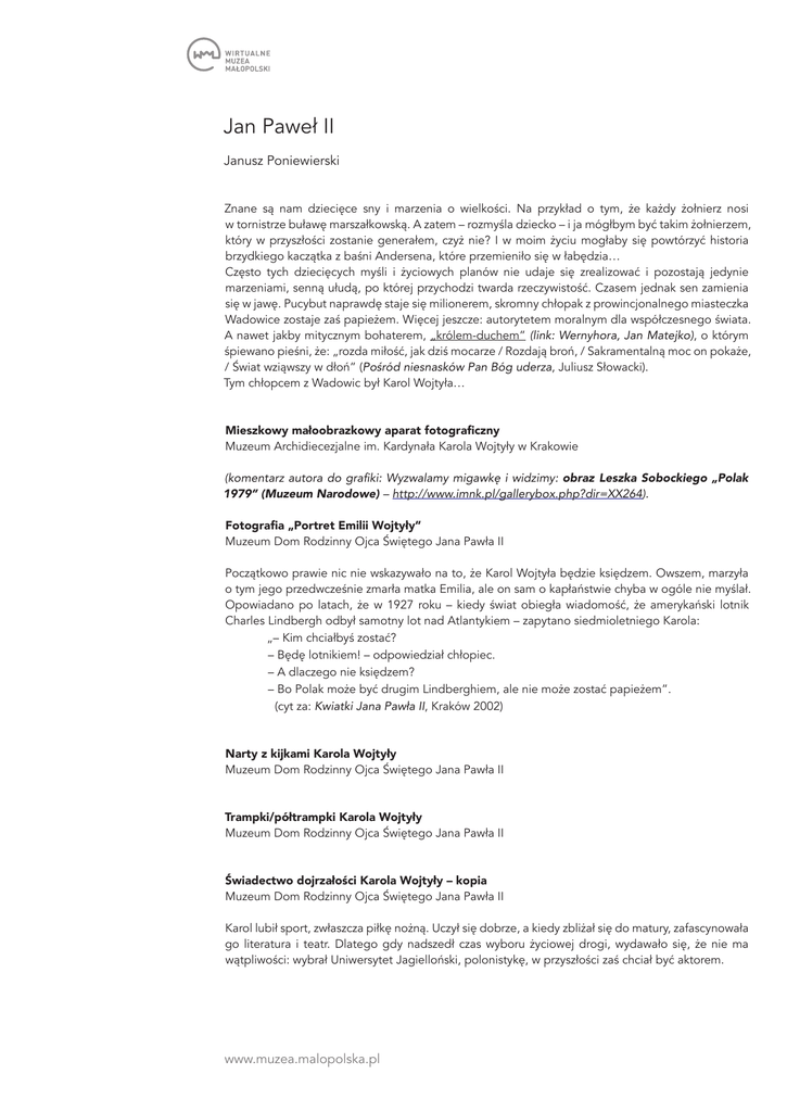 Jan Paweł II Janusz Poniewierski Znane są nam dziecięce sny i marzenia o wielkości. Na przykład o tym, że każdy żołnierz nosi w tornistrze buławę marszałkowską. A zatem – rozmyśla dziecko – i ja mógłbym być takim żołnierzem, który w przyszłości zostanie generałem, czyż nie? I w moim życiu mogłaby się powtórzyć historia brzydkiego kaczątka z baśni Andersena, które przemieniło się w łabędzia… Często tych dziecięcych myśli i życiowych planów nie udaje się zrealizować i pozostają jedynie marzeniami, senną ułudą, po której przychodzi twarda rzeczywistość. Czasem jednak sen zamienia się w jawę. Pucybut naprawdę staje się milionerem, skromny chłopak z prowincjonalnego miasteczka Wadowice zostaje zaś papieżem. Więcej jeszcze: autorytetem moralnym dla współczesnego świata. A nawet jakby mitycznym bohaterem, „królem-duchem” (link: Wernyhora, Jan Matejko), o którym śpiewano pieśni, że: „rozda miłość, jak dziś mocarze / Rozdają broń, / Sakramentalną moc on pokaże, / Świat wziąwszy w dłoń” (Pośród niesnasków Pan Bóg uderza, Juliusz Słowacki). Tym chłopcem z Wadowic był Karol Wojtyła… Mieszkowy małoobrazkowy aparat fotograficzny Muzeum Archidiecezjalne im. Kardynała Karola Wojtyły w Krakowie (komentarz autora do grafiki: Wyzwalamy migawkę i widzimy: obraz Leszka Sobockiego „Polak 1979” (Muzeum Narodowe) – http://www.imnk.pl/gallerybox.php?dir=XX264). Fotografia „Portret Emilii Wojtyły” Muzeum Dom Rodzinny Ojca Świętego Jana Pawła II Początkowo prawie nic nie wskazywało na to, że Karol Wojtyła będzie księdzem. Owszem, marzyła o tym jego przedwcześnie zmarła matka Emilia, ale on sam o kapłaństwie chyba w ogóle nie myślał. Opowiadano po latach, że w 1927 roku – kiedy świat obiegła wiadomość, że amerykański lotnik Charles Lindbergh odbył samotny lot nad Atlantykiem – zapytano siedmioletniego Karola: „– Kim chciałbyś zostać? – Będę lotnikiem! – odpowiedział chłopiec. – A dlaczego nie księdzem? – Bo Polak może być drugim Lindberghiem, ale nie może zostać papieżem”. (cyt za: Kwiatki Jana Pawła II, Kraków 2002) Narty z kijkami Karola Wojtyły Muzeum Dom Rodzinny Ojca Świętego Jana Pawła II Trampki/półtrampki Karola Wojtyły Muzeum Dom Rodzinny Ojca Świętego Jana Pawła II Świadectwo dojrzałości Karola Wojtyły – kopia Muzeum Dom Rodzinny Ojca Świętego Jana Pawła II Karol lubił sport, zwłaszcza piłkę nożną. Uczył się dobrze, a kiedy zbliżał się do matury, zafascynowała go literatura i teatr. Dlatego gdy nadszedł czas wyboru życiowej drogi, wydawało się, że nie ma wątpliwości: wybrał Uniwersytet Jagielloński, polonistykę, w przyszłości zaś chciał być aktorem. www.muzea.malopolska.pl Fotografia „Portret Karola Wojtyły seniora” Muzeum Dom Rodzinny Ojca Świętego Jana Pawła II Wiele przemawia za tezą, że Karol Wojtyła mógł zostać wybitnym artystą, człowiekiem teatru. Tak się jednak nie stało – Karol wybrał kapłaństwo. Złożyło się na to wiele czynników. Ten najważniejszy jest tajemnicą, ludzie wierzący widzą w nim dzieło samego Boga i nazywają powołaniem. Można jednak wskazać i inne okoliczności stojące za tym wyborem. W przypadku Wojtyły dużą rolę w jego dojrzewaniu do kapłaństwa odegrała śmierć ojca (kilka lat wcześniej zmarła matka Karola i jego jedyny brat) i spowodowane nią poczucie samotności. Ważne było chyba także doświadczenie wojny i głęboki kryzys wartości. Wielu młodych ludzi czuło wówczas, że odpowiedzią na ten kryzys winna być ofiara złożona z własnego życia. Poświęcenie samego siebie – dla Boga i dla innych ludzi. Wzorem drogi, jaką obrał wówczas Karol Wojtyła, był Adam Chmielowski – święty Brat Albert. Ten wybitny malarz porzucił sztukę, żeby zamieszkać razem z najuboższymi. Chciał im nie tylko pomagać, ale także dzielić z nimi swój los – jak brat. Sutanna księdza Karola Wojtyły Muzeum Dom Rodzinny Ojca Świętego Jana Pawła II Buty sportowe księdza Karola Wojtyły Muzeum Dom Rodzinny Ojca Świętego Jana Pawła II Kajak księdza Karola Wojtyły Muzeum Archidiecezjalne im. Kardynała Karola Wojtyły w Krakowie Wiosło Karola Wojtyły Muzeum Dom Rodzinny Ojca Świętego Jana Pawła II Karol Wojtyła okazał się dobrym księdzem. Tuż po święceniach arcybiskup Adam Stefan Sapieha wysłał go na studia do Rzymu, skąd jako świeżo upieczony doktor wrócił do Krakowa. Wkrótce też obronił rozprawę habilitacyjną i został profesorem etyki, wybitnym znawcą filozofii człowieka. Jednocześnie ks. prof. Wojtyła nie zaniedbywał działalności duszpasterskiej. Lubił zwłaszcza pracę z młodzieżą, głównie ze studentami. Swoim podopiecznym poświęcał każdą wolną chwilę – również swój urlop, kiedy to chodził z nimi po górach i pływał po jeziorach. W czasie jednej z takich wypraw turystycznych – niemal wprost z kajaka – został wezwany do Warszawy, gdzie poinformowano go, że z woli papieża został właśnie mianowany biskupem. Trudno się tej nominacji dziwić – Wojtyła był przecież jednym z najwybitniejszych i najzdolniejszych księży w archidiecezji krakowskiej… Płaszcz z pelerynką i biret biskupa Karola Wojtyły Muzeum Dom Rodzinny Ojca Świętego Jana Pawła II Bulla nominacyjna Pawła VI z 1963 roku Muzeum Archidiecezjalne im. Kardynała Karola Wojtyły w Krakowie Początkowo Wojtyła urzędował w Krakowie „tylko” jako biskup pomocniczy. Po śmierci zwierzchnika, abp. Eugeniusza Baziaka, papież Paweł VI mianował Karola Wojtyłę arcybiskupem Krakowa. www.muzea.malopolska.pl To było ważne stanowisko kościelne, jedno z najważniejszych w Polsce. Nowy arcybiskup wkrótce stał się znany i ceniony w całym kraju, a z czasem także i w Kościele powszechnym. Z jego zdaniem liczył się ówczesny papież, który już w 1967 roku włączył Wojty