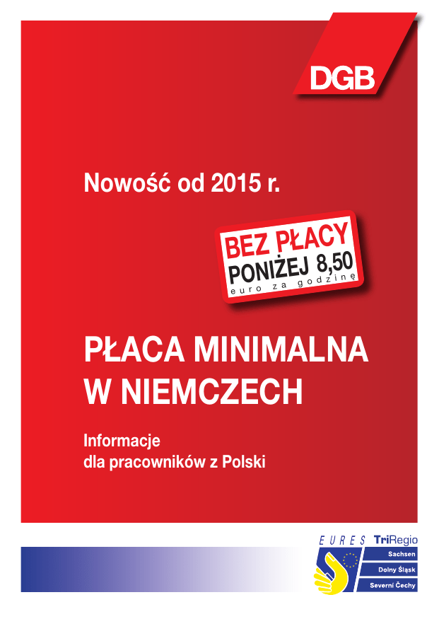 Nowość od 2015 r. BEZ PŁA8C,5Y0 PONIŻEJ e u r o z a i n ę g o d z PŁACA MINIMALNA W NIEMCZECH Informacje dla pracowników z Polski 1. Pochodzę z Polski i pracuję w Niemczech. Czy istnieje płaca minimalna dla mnie? Tak. Od dnia 1 stycznia 2015 r. w Niemczech obowiązuje ustawowa płaca minimalna w wysokości 8,50 euro za godzinę dla niemieckich i zagranicznych pracowników, którym nie przysługuje branżowa płaca minimalna. Oznacza to, że osoby świadczące pracę w Niemczech muszą otrzymać za swą pracę co najmniej 8,50 euro za godzinę – zarówno od swego niemieckiego, jak i od swego zagranicznego pracodawcy. Również staże co do zasady mają być wynagradzane ustawową płacą minimalną. Od tych reguł istnieją jednak wyjątki dla określonych grup pracowników i praktykantów. Poza tym w Niemczech zarówno dla niemieckich, jak i zagranicznych pracowników obowiązują płace minimalne w określonych branżach. Oznacza to, że wszystkim pracownikom pracującym w określonej branży w Niemczech przysługuje wynagrodzenie co najmniej w wysokości płacy minimalnej obowiązującej w tej branży. Niezależnie od tego, czy pracodawca jest z Niemiec czy z zagranicy. Obowiązują następujące branżowe płace minimalne: 1 Branża Kategoria pracowników / kategoria wynagrodzenia Landy wschodnie Landy zachodnie € / godz. Berlin 8,86 € 8,86 € 8,86 € 12,50 € 13,35 € 13,35 € 10,75 € 11,15 € 14,20 € 11,15 € 14,05 € 01.01.201531.12.2015 11,85 € 11,85 € 11,85 € Montaż instalacji elektrycznych 01.01.201531.12.2015 9,35 € 10,10 € 9,35 € Przemysł mięsny 01.12.201430.09.2015 01.10.201530.11.2016 8,00 € 8,00 € 8,00 € 8,60 € 8,60 € 8,60 € 01.08.201431.7.2015 01.08.201531.07.2016 7,50 € 8,00 € 7,50 € 8,50 € 8,50 € 8,50 € 8,21 € 10,63 € 9,55 € 12,65 € 9,55 € 12,65 € 8,65 € 9,40 € 9,40 € Gospodarka odpadami od / do 01.10.201430.06.2015 Doskonalenie zawodowe pracownik pedagogiczny od 01.01.2015 Branża budowlana 01.01.201531.12.2015 - robotnik - robotnik wykwalifikowany Dekarstwo Rzemiosło fryzjerskie Sprzątanie budynków 01.01.201531.10.2015 - sprzątanie wnętrz - czyszczenie elewacji i mycie okien Opieka nad osobami 01.01.2015starszymi i zniedołężniałymi 31.12.2015 Aktualne informacje na temat płac minimalnych pod adresem 2 Branża Kategoria pracowników / kategoria wynagrodzenia od / do Rzemiosło montażu rusztowań 01.09.201430.04.2015 01.05.201531.3.2016 Rolnictwo i leśnictwo, ogrodnictwo (przypuszczalnie) Praca tymczasowa Malarze i lakiernicy - pracownicy niewykwalifikowani 01.01.201531.12.2015 01.01.201631.12.2016 01.04.201431.03.2015 01.04.201531.05.2016 Landy wschodnie Landy zachodnie € / godz. Berlin 10,25 € 10,25 € 10,25 € 10,50 € 10,50 € 10,50 € 7,20 € 7,40 € 7,20 € 7,90 € 8,00 € 7,90 € 7,86 € 8,50 € 7,86 € 8,20 € 8,80 € 8,20 € 9,90 € 9,90 € 9,90 € 10,00 € 10,00 € 10,00 € 01.08.201430.04.2015 01.05.201530.04.2016 01.08.201430.04.2015 01.05.201530.04.2016 10,50 € 12,50 € 12,30 € 10,90 € 12,80 € 12,60 € Kamieniarstwo i rzeźby w kamieniu 01.05.201430.04.2015 10,66 € 11,25 € 11,25 € Ochrona osób i mienia od 01.01.2015 niejasne niejasne niejasne Usługi pralnicze dla klientów firmowych (hotele, szpitale itp.) 01.10.201430.06.2016 8,00 € 8,50 € 8,00 € - czeladnicy www.mindestlohn.de oraz www.sachsen.dgb.de 3 Branżowe płace minimalne na razie w każdym przypadku mają pierwszeństwo przed ustawową płacą minimalną – czyli nawet wtedy, gdy wynoszą one mniej, niż 8,50 euro. Najpóźniej od dnia 1 stycznia 2017 r. muszą one osiągnąć wysokość 8,50 euro za godzinę. W wielu przedsiębiorstwach obowiązują poza tym układy zbiorowe przewidujące wyższe wynagrodzenie. W tym przypadku zatrudnieni tam pracownicy mogą żądać wyższego wynagrodzenia z układu zbiorowego. 2. Czy mogę wymagać ustawowej płacy minimalnej w wys. 8,50 euro za godzinę, jeżeli mam w Niemczech tylko minijob lub jeżeli dorabiam sobie jako emeryt/ rencista lub student? Ustawowa płaca minimalna obowiązuje co do zasady dla wszystkich pracowników, a tym samym także dla wykonujących minijob, emerytów czy studentów. W przypadku minijob należy jednak pamiętać, że ta forma zatrudnienia ograniczona jest kwotą 450 euro miesięcznie – jeżeli wynagrodzenie miesięczne wynosi więcej, trzeba już odprowadzać składki na ubezpieczenie społeczne. Wprowadzenie płacy minimalnej w wysokości 8,50 euro za godzinę powoduje, że minijob możliwe jest już tylko w wymiarze 52 godzin miesięcznie. 4 3. Mój pracodawca jest w Polsce. Jestem oddelegowany przez niego do Niemiec. Czy obowiązuje mnie płaca minimalna? Tak. Płaca minimalna obowiązuje dla wszystkich pracowników zatrudnionych w Niemczech, niezależnie od tego, czy pracodawca ma swą siedzibę w Niemczech czy za granicą. 4. Czy mogę żądać ustawowej płacy minimalnej, jeżeli nie mam umowy o pracę, lecz umowę o dzieło lub umowę zlecenia? Decydująca nie jest nazwa umowy, lecz fakt, czy rzeczywiście wykonujesz pracę najemną. Jeżeli masz kilku zleceniodawców, zlecenia wykonujesz przy pomocy własnych narzędzi, a swą pracę co do zasady organizujesz i planujesz samodzielnie, a za jej wyniki odpowiadasz przed zleceniodawcami, wówczas pracujesz na własny rachunek i musisz sam negocjować swe wynagrodzenie. Nie obowiązuje cię płaca minimalna. Obowiązuje cię tylko wtedy, gdy twój stosunek pracy nazywa się umową o pracę lub gdy masz działalność gospodarczą, ale w praktyce to pracodawca organizuje twoją pracę i decyduje o jej przebiegu kiedy, gdzie i jak masz pracować. W tym przypadku możesz dochodzić swego wynagrodzenia jako pracownik przed sądem pracy. Jeżeli nie obowiązuje cię żadna branżowa płaca minimalna, możesz żądać co najmniej ustawowej płacy minimalnej w wysokości 8,50 euro za godzinę. 5 5. Jestem zatrudniony jako pomoc do