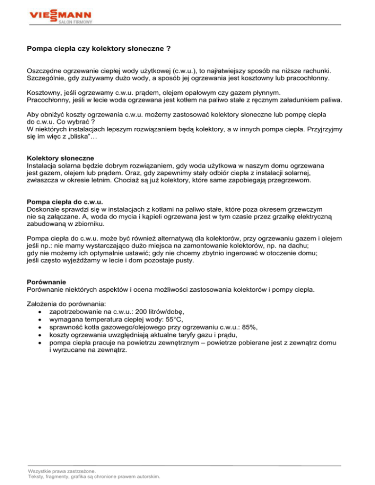 Pompa ciepła czy kolektory słoneczne ? Oszczędne ogrzewanie ciepłej wody użytkowej (c.w.u.), to najłatwiejszy sposób na niższe rachunki. Szczególnie, gdy zużywamy dużo wody, a sposób jej ogrzewania jest kosztowny lub pracochłonny. Kosztowny, jeśli ogrzewamy c.w.u. prądem, olejem opałowym czy gazem płynnym. Pracochłonny, jeśli w lecie woda ogrzewana jest kotłem na paliwo stałe z ręcznym załadunkiem paliwa. Aby obniżyć koszty ogrzewania c.w.u. możemy zastosować kolektory słoneczne lub pompę ciepła do c.w.u. Co wybrać ? W niektórych instalacjach lepszym rozwiązaniem będą kolektory, a w innych pompa ciepła. Przyjrzyjmy się im więc z „bliska”… Kolektory słoneczne Instalacja solarna będzie dobrym rozwiązaniem, gdy woda użytkowa w naszym domu ogrzewana jest gazem, olejem lub prądem. Oraz, gdy zapewnimy stały odbiór ciepła z instalacji solarnej, zwłaszcza w okresie letnim. Chociaż są już kolektory, które same zapobiegają przegrzewom. Pompa ciepła do c.w.u. Doskonale sprawdzi się w instalacjach z kotłami na paliwo stałe, które poza okresem grzewczym nie są załączane. A, woda do mycia i kąpieli ogrzewana jest w tym czasie przez grzałkę elektryczną zabudowaną w zbiorniku. Pompa ciepła do c.w.u. może być również alternatywą dla kolektorów, przy ogrzewaniu gazem i olejem jeśli np.: nie mamy wystarczająco dużo miejsca na zamontowanie kolektorów, np. na dachu; gdy nie możemy ich optymalnie ustawić; gdy nie chcemy zbytnio ingerować w otoczenie domu; jeśli często wyjeżdżamy w lecie i dom pozostaje pusty. Porównanie Porównanie niektórych aspektów i ocena możliwości zastosowania kolektorów i pompy ciepła. Założenia do porównania: zapotrzebowanie na c.w.u.: 200 litrów/dobę, wymagana temperatura ciepłej wody: 55°C, sprawność kotła gazowego/olejowego przy ogrzewaniu c.w.u.: 85%, koszty ogrzewania uwzględniają aktualne taryfy gazu i prądu, pompa ciepła pracuje na powietrzu zewnętrznym – powietrze pobierane jest z zewnątrz domu i wyrzucane na zewnątrz. Wszystkie prawa zastrzeżone. Teksty, fragmenty, grafika są chronione prawem autorskim. Urządzenia Całoroczne samodzielne ogrzewanie c.w.u. Okresowe wykorzystanie do ogrzewania c.w.u. Koszt montażu instalacji (robocizna) Czas montażu instalacji Pompa ciepła Pompa ciepła do c.w.u. Vitocal 060-A typ WWKS nie Kolektory słoneczne 2 płaskie kolektory słoneczne Vitosol 200-F SVK + zbiornik c.w.u. 250 litrów Vitocall 100-B CVBA nie tak niezalecane < 1 000 zł < 2 500 zł 1 dzień 2-3 dni Oszczędności na ogrzewaniu c.w.u. Gaz ziemny, taryfa W2 Gaz ziemny, taryfa W3 Olej opałowy Kocioł węglowy + podgrzewacz elektryczny Pompa ciepła 110 zł 90 zł 1 100 zł 840 zł Kolektory słoneczne 340 zł 320 zł 925 zł 620 zł Całoroczne samodzielne ogrzewanie c.w.u. Pompa ciepła jak i kolektory słoneczne nie są w stanie dostarczyć odpowiedniej ilości ciepła do ogrzewania c.w.u. przez cały rok. Praca kolektorów zależy od słońca, a tego brakuje szczególnie w zimie. Pompa ciepła, pobierająca powietrze z zewnątrz budynku, ma ograniczoną minimalną temperaturę powietrza, która np. dla Vitocal 060-A wynosi -5°C – przy niższych temperaturach powietrza pompa wyłącza się. Pompa może pobierać powietrze z pomieszczenia, w którym się znajduje. Ale, przy takiej pracy ochładza pomieszczenie. Teoretycznie pompa mogła by pracować przez cały rok, ale warto zwrócić uwagę na to, że w okresie grzewczym będą to dodatkowe straty ciepła, które będzie musiał uzupełnić nasz system ogrzewania domu. W ostatecznym rozrachunku, przy pracy całorocznej pompy ciepła na powietrzu z pomieszczenia, w którym się znajduje, może generować wyższe koszty ogrzewania c.w.u., a jej praca może nie być już tak atrakcyjna kosztowo. Pomp Vitocal 060-A WWKS wyposażona jest w wężownice grzewczą, do której można podłączyć kocioł. Regulator pompy ciepła może w ten sposób automatycznie załączyć kocioł, który ogrzeje c.w.u. przy niskich temperaturach powietrza. Wszystkie prawa zastrzeżone. Teksty, fragmenty, grafika są chronione prawem autorskim. Oszczędności z kotłem gazowym W zależności od ilości zużywanego gazu w ciągu roku, jesteśmy przypisani do odpowiedniej taryfy: taryfa W2, przy zużyciu 300-1200 m3 gazu rocznie, taryfa W3, dla zużycia gazu >1200 m2 w ciągu roku. Niskie oszczędności przy pompie ciepła i ogrzewaniu gazem ziemnym – wynikają przede wszystkim z opłat stałych, które każdego miesiąca ponosimy niezależnie od ilości zużywanego gazy, oraz od abonamentu za przyłącze gazowe. Opłaty stałe mogą wynosić od ok. 20 do 48 zł/miesiąc. Instalacja z kotłem olejowym i na gaz płynny Tutaj większe oszczędności przyniesie pompa ciepła do ogrzewania c.w.u., większe niż kolektory słoneczne. Przede wszystkim dlatego, że nie ma opłat stałych, a pompa ciepła może samodzielnie ogrzewać wodę do wymaganej temperatury - wiosną, jesienią i w lecie. Nawet w letnie dni, przy pochmurnej pogodzie, instalacja solarna może nie wystarczyć i konieczne będzie dogrzewanie wody kotłem. Kocioł węglowy i grzałka elektryczna Tutaj również, przy pochmurnej pogodzie, kolektory nie zagrzeją wody do odpowiedniej temperatury – trzeba ją dogrzać kotłem na paliwo stałe lub grzałką elektryczną: grzałka elektryczna – to znacznie wyższe koszty ogrzewania c.w.u., załączenie kotła – to małowygodne rozwiązanie, bo wymaga kontrolowania temperatur żeby nie zabrakło ciepłej wody w domu i wymaga poświecenia wolnego czasu. Pompa ciepła do c.w.u. jest wręcz idealnym rozwiązaniem w instalacji z kotłem na paliwo stałe – w ciepłych miesiącach nie trzeba uruchamiać kotła, a koszty ogrzewania wody będą znacznie niższe niż prądem. A w okresie grzewczym, przy okazji ogrzewania domu kocioł również tanio ogrzewał będzie wodę do mycia i kąpieli. W porównaniu z kolektorami 