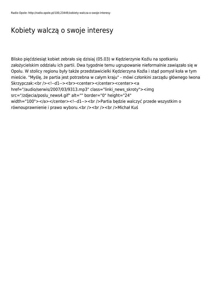Radio Opole: http://radio.opole.pl/100,23449,kobiety-walcza-o-swoje-interesy Kobiety walczą o swoje interesy Blisko pięćdziesiąt kobiet zebrało się dzisiaj (05.03) w Kędzierzynie Koźlu na spotkaniu założycielskim oddziału ich partii. Dwa tygodnie temu ugrupowanie nieformalnie zawiązało się w Opolu. W stolicy regionu były także przedstawicielki Kędzierzyna Koźla i stąd pomysł koła w tym mieście. "Myślę, że partia jest potrzebna w całym kraju" - mówi członkini zarządu głównego Iwona Skrzypczak:<br /><!--d1--><br><center></center><center><a href="/audio/serwis/2007/03/9313.mp3" class="linki_news_skroty"><img src="/zdjecia/poslu_news4.gif" alt="" border="0" height="24" width="100"></a></center><!--d1--><br />Partia będzie walczyć przede wszystkim o równouprawnienie i prawo wyboru.<br /><br /><br />Michał Kuś