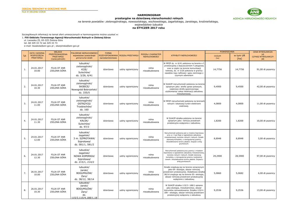 ODDZIAŁ TERENOWY W GORZOWIE WLKP. FILIA W ZIELONEJ GÓRZE HARMONOGRAM przetargów na dzierżawę nieruchomości rolnych na terenie powiatów: zielonogórskiego, nowosolskiego, wschowskiego, żagańskiego, żarskiego, krośnieńskiego, województwo lubuskie na STYCZEŃ 2017 roku Szczegółowych informacji na temat ofert umieszczonych w harmonogramie można uzyskać w: 1. Filii Oddziału Terenowego Agencji Nieruchomości Rolnych w Zielonej Górze ul. Lwowska 25, 65-225 Zielona Góra tel. 68 329 33 72 lub 329 33 73 e-mail: [email protected] ; [email protected] Lp. DATA I GODZINA ROZPOCZĘCIA PRZETARGU MIEJSCE PRZEPROWADZENIA PRZETARGU (nazwa jednostki) 1. 24.01.2017 10.00 FILIA OT ANR ZIELONA GÓRA lubuskie/ zielonogórski/ KIJE/ Sulechów/ dz. 3/26, 6/41 dzierżawa 2. 24.01.2017 10.30 FILIA OT ANR ZIELONA GÓRA lubuskie/ zielonogórski/ SKIBICE/ Nowogród Bobrzański/ dz. 335/5 3. 24.01.2017 11.00 FILIA OT ANR ZIELONA GÓRA 4. 24.01.2017 11.30 POŁOŻENIE NIERUCHOMOŚCI FORMA województwo/ powiat/obręb/ ROZDYSPONOWANIA RODZAJ PRZETARGU gmina/numer działki (sprzedaż/dzierżawa) POWIERZCHNIA RODZAJ I CHARAKTER NIERUCHOMOŚCI ATRYBUTY NIERUCHOMOŚCI ustny ograniczony rolna niezabudowana W MPZP dz. nr 6/41 położona na terenie o f. produkcyjnej z dopuszczeniem f.usługowej oraz w części na terenie komunikacji kołowej, dz. nr 3/26 położona w granicy zasobów ropy naftowej i gazu ziemnego z czynnym odwiertem dzierżawa ustny ograniczony rolna niezabudowana lubuskie/ zielonogórski/ OSTRZYCE/ Trzebiechów/ dz. 160 dzierżawa ustny ograniczony rolna niezabudowana FILIA OT ANR ZIELONA GÓRA lubuskie/ zielonogórski/ KALSK/ Sulechów/ dz. 97/3 dzierżawa ustny ograniczony 5. 24.01.2017 12.00 FILIA OT ANR ZIELONA GÓRA lubuskie/ żagański/ 3 m. SZPROTAWA/ Szprotawa/ dz. 581/1, 581/2 6. 24.01.2017 12.30 FILIA OT ANR ZIELONA GÓRA lubuskie/ żagański/ NOWA KOPERNIA/ Szprotawa/ dz. 215/1, 214/2 7. 26.01.2017 10.00 FILIA OT ANR ZIELONA GÓRA lubuskie/ żarski/ BOGUMIŁÓW/ Żary/ dz. 38/12, 38/14 FILIA OT ANR ZIELONA GÓRA lubuskie/ żarski/ BOGUMIŁÓW/ Żary/ dz. 115/3,115/4,188/1,18 8. 26.01.2017 10.30 CENA WYWOŁAWCZA [zł] CZYNSZ WYWOŁAWCZY [dt] OGÓŁEM [ha] w tym UR [ha] 14,7756 14,7756 91,00 dt pszenicy 9,4900 9,4500 42,00 dt pszenicy W MPZP nieruchomość położona na terenach rolnych i lokalizacji turbin elektrowni wiatrowej. 4,0800 4,0800 11,00 dt pszenicy rolna niezabudowana W SUiKZP działka położona na terenie opisanym jako: rolnicza przestrzeń produkcyjna wyłączona z zabudowy. 1,8200 1,8200 10,00 dt pszenicy ustny ograniczony rolna niezabudowana Nieruchomość położona jest w mieście Szprotawa przy ul. 3-go Maja w sąsiedztwie zabudowy mieszkaniowej, terenów rolnych i leśnych. Działki stanowią kompleks, o nieregularnej granicy. Ukształtowanie terenu płaskie. Dojazd z dróg gruntowych. 8,8948 8,8948 5,00 dt pszenicy ustny ograniczony rolna niezabudowana Nieruchomość położona przy granicy z miastem Szprotawa w sąsiedztwie zabudowy mieszkaniowej, terenów rolnych i leśnych. Działki stanowią kompleks, o nieregularnej granicy rozdzielony rowem. Ukształtowanie terenu płaskie. Dojazd z dróg gruntowych. 29,2900 28,5900 dzierżawa ustny ograniczony rolna niezabudowana Działki znajdują się na terenie oznaczonym jako E4- ekologia, obszar rolniczej przestrzeni produkcyjnej. Dodatkowo działka 38/14 znajduje się na terenie E5- ekologia, obszar rolniczej przestrzeni produkcyjnej wyłączone z zabudowy. 5,0860 5,0682 6,00 dt pszenicy dzierżawa ustny ograniczony rolna niezabudowana W SUiKZP działka 115/3 i 188/1 opisana jako:ekologia, mieszkalnictwo, obszar kierunków zainwestowania. Działka 115/4 i 189 - ekologia, obszar rolniczej przestrzeni produkcyjnej wyłączony z zabudowy 9,2536 9,2536 13,00 dt pszenicy dzierżawa dzierżawa W SUiKZP nieruchomość położona na terenie opisanym jako: strefa upraw polowych, częściowo strefa ograniczonego użytkowania/ zakaz lokalizacji zabudowy mieszkaniowej. 97,00 dt pszenicy 9. 26.01.2017 11.00 FILIA OT ANR ZIELONA GÓRA lubuskie/ żarski/ BOGUMIŁÓW/ Żary/ dz. 118/2, 118/4 dzierżawa ustny ograniczony rolna niezabudowana W SUiKZP działka 118/2 opisana jako ekologia i obszar rol. przestrz. produkcyjnej wyłączony z zabudowy. Działka 118/4-las do adaptacji. 4,4400 2,9200 11,00 dt pszenicy dzierżawa ustny ograniczony rolna niezabudowana W SUiKZP nieruchomość położona na terenie upraw rolno-ogrodniczych i rolnych. Działka 96/2 położona na terenie leśnym. 10,8000 10,4500 32,00 dt pszenicy 10. 26.01.2017 11.30 FILIA OT ANR ZIELONA GÓRA lubuskie/ żarski/ RASZYN/ Lubsko/ dz. 83,83/1,100/2,99/3, 11. 26.01.2017 12.00 FILIA OT ANR ZIELONA GÓRA lubuskie/ żarski/ RASZYN/ Lubsko/ dz. 214/4 dzierżawa ustny ograniczony rolna niezabudowana W SUiKZP działka położona na terenie opisanym jako:usługi sportowo-rekreacyjne z zapisem zabudowy letniskowej, usługi nieuciążliwe,zbiornik retencyjny. 30,1200 30,0900 46,00 dt pszenicy 12. 26.01.2017 12.30 FILIA OT ANR ZIELONA GÓRA lubuskie/ żarski/ WIERZCHNO/ Brody/ dz. 59 dzierżawa ustny ograniczony rolna niezabudowana W SUiKZP działka położona na terenie opisanym jako: częściowo teren ekosystemów łąkowo-leśnych, częściowo strefa rozwoju osadnictwa wiejskiego z dop. Rozwoju przestrzennego 13,1000 12,6700 13,00 dt pszenicy 141,1500 138,0622 RAZEM Informacje zawarte w niniejszym harmonogramie nie stanowią oferty w rozumieniu przepisów ustawy z dnia 19 października1991 r. o gospodarowaniu nieruchomościami rolnymi Skarbu Państwa (j.t. Dz. U. z 2016 r., poz. 1491). Informacje o przetargach stanowiące ofertę zawarte są w ogłoszeniach publikowanych w miejscach zwyczajowo przyjętych oraz na stronie internetowej www.anr.gov.pl Pisemne zgłoszenia dotyczące nieruchomości wystawianych do sprzedaży lub dzierżawy zgłaszać należy na adres jednostki terenowej: OT ANR w Gorzowie Wlkp., Filia w Zielonej Górze ul. Lwowska 25, 65-225 Zielona Góra a takż