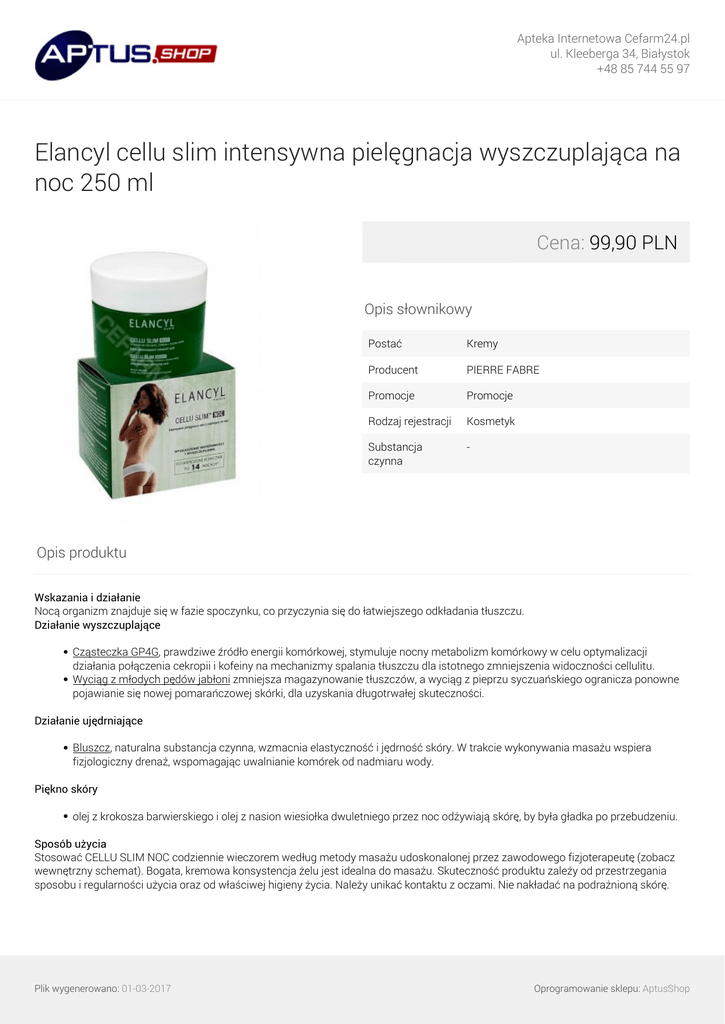 Apteka Internetowa Cefarm24.pl ul. Kleeberga 34, Białystok +48 85 744 55 97 Elancyl cellu slim intensywna pielęgnacja wyszczuplająca na noc 250 ml Cena: 99,90 PLN Opis słownikowy Postać Kremy Producent PIERRE FABRE Promocje Promocje Rodzaj rejestracji Kosmetyk Substancja czynna - Opis produktu Wskazania i działanie Nocą organizm znajduje się w fazie spoczynku, co przyczynia się do łatwiejszego odkładania tłuszczu. Działanie wyszczuplające Cząsteczka GP4G, prawdziwe źródło energii komórkowej, stymuluje nocny metabolizm komórkowy w celu optymalizacji działania połączenia cekropii i kofeiny na mechanizmy spalania tłuszczu dla istotnego zmniejszenia widoczności cellulitu. Wyciąg z młodych pędów jabłoni zmniejsza magazynowanie tłuszczów, a wyciąg z pieprzu syczuańskiego ogranicza ponowne pojawianie się nowej pomarańczowej skórki, dla uzyskania długotrwałej skuteczności. Działanie ujędrniające Bluszcz, naturalna substancja czynna, wzmacnia elastyczność i jędrność skóry. W trakcie wykonywania masażu wspiera fizjologiczny drenaż, wspomagając uwalnianie komórek od nadmiaru wody. Piękno skóry olej z krokosza barwierskiego i olej z nasion wiesiołka dwuletniego przez noc odżywiają skórę, by była gładka po przebudzeniu. Sposób użycia Stosować CELLU SLIM NOC codziennie wieczorem według metody masażu udoskonalonej przez zawodowego fizjoterapeutę (zobacz wewnętrzny schemat). Bogata, kremowa konsystencja żelu jest idealna do masażu. Skuteczność produktu zależy od przestrzegania sposobu i regularności użycia oraz od właściwej higieny życia. Należy unikać kontaktu z oczami. Nie nakładać na podrażnioną skórę. Plik wygenerowano: 01-03-2017 Powered by TCPDF (www.tcpdf.org) Oprogramowanie sklepu: AptusShop