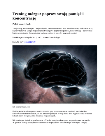 Trening mózgu: popraw swoją pamięć i koncentrację Poleć ten artykuł: Twój mózg, tak samo jak Twoje mięśnie, można trenować. I co równie ważne, ćwiczenia te są naprawdę łatwe. Dzięki regularnemu treningowi poprawisz pamięć, koncentrację i usprawnisz logiczne myślenie. Sprawdź, jak wytrenować swój umysł i ulepszyć pamięć. Publikacja: 4 sierpnia 2015, 10:25 Autor: Piotr Pflegel SLAJD 1 / 7 NASTĘPNY fot. shutterstock.com Każdy posiadacz komputera zna to uczucie, gdy system zaczyna zwalniać, zwalniać i w końcu wyświetla komunikat, że ma za mało pamięci. Wtedy masz dwa wyjścia: albo usuniesz kilka filmów lub gier, albo dokupisz większy dysk. Nic trudnego. Jednak w porównaniu z Twoim mózgiem komputer to prymitywne narzędzie. W gruncie rzeczy bliżej mu do młotka niż do procesora ulokowanego wewnątrz Twojej czaszki. Szarych komórek nie możesz dokupić, niespecjalnie też możesz zwolnić miejsce, usuwając nieprzydatne już informacje. No bo spróbuj świadomie zapomnieć o czymkolwiek. Gdy tylko pomyślisz o tym, o czym chcesz zapomnieć, spowodujesz tylko, że zapamiętasz to lepiej. Z drugiej strony niezwykle łatwo przychodzi Ci zapominanie o tym, co powinieneś zapamiętać. Czy to kolejny login do serwisu, czy imię dziewczyny, która spodobała Ci się na imprezie... Informacje ulatują z pamięci, jakby nie było tam już ani jednego bita wolnego miejsca. 1. Siłownia umysłu Najwyżej notowani zawodnicy sportów pamięci mają zakaz wstępu do najlepszych kasyn, bo udawało im się pokonać system, w którym rzekomo zawsze wygrywa kasyno. To dowód na potęgę pamięci. Mózg nie jest wprawdzie mięśniem, ale to nie oznacza, że nie można go trenować. Wytrenowany potrafi unieść znacznie więcej. Jak wygląda taki trening mózgu? Zróbmy eksperyment. Spróbuj zapamiętać dwie listy zakupów. Jedne będą w sklepie odzieżowym, a drugie w spożywczym. W odzieżowym musisz kupić: skarpetki, bluzę z kapturem, bokserki, czapkę, torbę i krawat. Nic nadzwyczajnego. W osiedlowym spożywczaku zaś dziewczyna kazała Ci kupić: bułki, mleko, pieczarki, mydło, kiełbasę, lody i papier toaletowy. Spróbuj tylko zapomnieć o czymś z listy! Stawka jest wysoka, lepiej więc skorzystać z jednej z mnemotechnik, czyli technik zapamiętywania, z tzw. metody łańcuchowej. Musisz ułożyć listę słów w ciąg powiązanych ze sobą zdarzeń. Akcja tych zdarzeń niech się odbywa w jakimś doskonale znanym Ci miejscu – skoro to jedzenie, niech to będzie kuchnia. Wyobraź więc sobie, że na blacie widzisz górę bułek. Obok stoi karton mleka. Niestety – krowa, która też jest w kuchni, odwracając się, przewraca mleko, które wylewa się na bułki, zamieniając je w bezkształtną papkę. Z tej papki wyrastają pieczarki. Chcesz je pozbierać, ale gdy ich dotykasz, okazuje się, że są zrobione z mydła i wyślizgują Ci się z rąk. Zirytowany chcesz umyć namydlone ręce, podchodzisz do zlewu i odkręcasz wodę, ale zamiast niej z kranu wylatuje kiełbasa. Odrywasz kawałek, gryziesz i zdumiony odkrywasz, że kiełbasa jest lodowato zimna i ma smak lodów waniliowych. To obrzydliwe, więc biegniesz do ubikacji, wypluwasz tę dziwną kiełbasę do muszli i wycierasz usta papierem toaletowym...