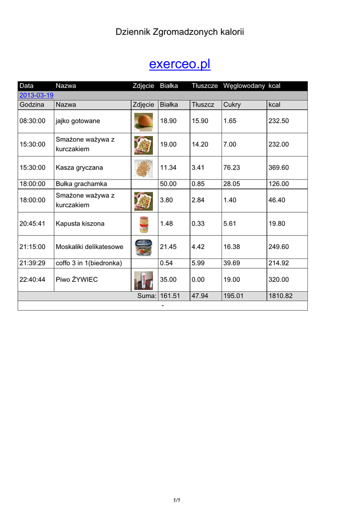 Dziennik Zgromadzonych kalorii exerceo.pl Data Nazwa 2013-03-19 Godzina Nazwa Zdjęcie Białka Tłuszcze Węglowodany kcal Zdjęcie Białka Tłuszcz Cukry kcal 08:30:00 jajko gotowane 18.90 15.90 1.65 232.50 15:30:00 Smażone ważywa z kurczakiem 19.00 14.20 7.00 232.00 15:30:00 Kasza gryczana 11.34 3.41 76.23 369.60 18:00:00 Bułka grachamka 50.00 0.85 28.05 126.00 18:00:00 Smażone ważywa z kurczakiem 3.80 2.84 1.40 46.40 20:45:41 Kapusta kiszona 1.48 0.33 5.61 19.80 21:15:00 Moskaliki delikatesowe 21.45 4.42 16.38 249.60 21:39:29 coffo 3 in 1(biedronka) 0.54 5.99 39.69 214.92 22:40:44 Piwo ŻYWIEC 35.00 0.00 19.00 320.00 47.94 195.01 1810.82 Suma: 161.51 - 1/1