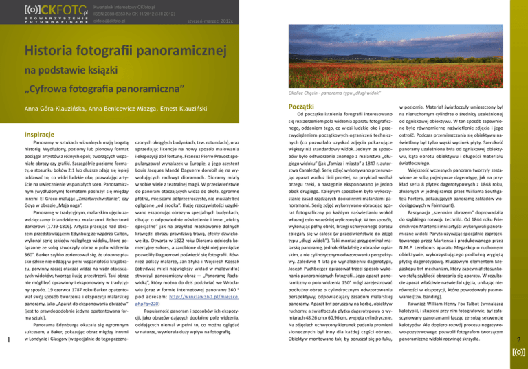 Kwartalnik Internetowy CKfoto.pl ISSN 2080-6353 Nr CK 11/2012 (I-III 2012) styczeń-marzec 2012r. [email protected] Historia fotografii panoramicznej na podstawie ksiązki „Cyfrowa fotografia panoramiczna” Okolice Chęcin - panorama typu „długi widok” Anna Góra-Klauzińska, Anna Benicewicz-Miazga, Ernest Klauziński Początki Inspiracje 1 Panoramy w sztukach wizualnych mają bogatą historię. Wydłużony, poziomy lub pionowy format pociągał artystów z różnych epok, tworzących wspaniałe obrazy czy grafiki. Szczególnie poziome formaty, o stosunku boków 2:1 lub dłuższe zdają się lepiej oddawać to, co widzi ludzkie oko, pozwalając artyście na uwiecznienie wspaniałych scen. Panoramicznym (wydłużonym) formatem posłużył się między innymi El Greco malując „Zmartwychwstanie”, czy Goya w obrazie „Maja naga”. Panoramę w tradycyjnym, malarskim ujęciu zawdzięczamy irlandzkiemu malarzowi Robertowi Barkerowi (1739-1806). Artysta pracując nad obrazem przedstawiającym Edynburg ze wzgórza Calton, wykonał serię szkiców rozległego widoku, które połączone ze sobą stworzyły obraz o polu widzenia 360°. Barker szybko zorientował się, że ułożone płasko szkice nie oddają w pełni wspaniałości krajobrazu, powinny raczej otaczać widza na wzór otaczających widoków, tworząc iluzję przestrzeni. Taki obraz nie mógł być oprawiony i eksponowany w tradycyjny sposób. 19 czerwca 1787 roku Barker opatentował swój sposób tworzenia i ekspozycji malarskiej panoramy, jako „Aparat do eksponowania obrazów” (jest to prawdopodobnie jedyna opatentowana forma sztuki). Panorama Edynburga okazała się ogromnym sukcesem, a Baker, pokazując obraz między innymi w Londynie i Glasgow (w specjalnie do tego przezna- czonych okrągłych budynkach, tzw. rotundach), oraz sprzedając licencje na nowy sposób malowania i ekspozycji zbił fortunę. Francuz Pierre Prevost spopularyzował wynalazek w Europie, a jego asystent Louis Jacques Mandé Daguerre dorobił się na wywołujących zachwyt dioramach. Dioramy miały w sobie wiele z teatralnej magii. W przeciwieństwie do panoram otaczających widza do okoła, ogromne płótna, miejscami półprzezroczyste, nie musiały być oglądane „od środka”. Iluzję rzeczywistości uzyskiwano eksponując obrazy w specjalnych budynkach, dbając o odpowiednie oświetlenie i inne „efekty specjalne” jak na przykład maskowanie dolnych krawędzi obrazu prawdziwą trawą, efekty dźwiękowe itp. Otwarta w 1822 roku Diorama odniosła komercyjny sukces, a zarobione dzięki niej pieniądze pozwoliły Daguerrowi poświecić się fotografii. Również polscy malarze, Jan Styka i Wojciech Kossak (obydwaj mieli największy wkład w malowidło) stworzyli panoramiczny obraz — „Panoramę Racławicką”, który można do dziś podziwiać we Wrocławiu (oraz w formie internetowej panoramy 360 o pod adresem: http://wroclaw360.pl/miejsce. php?q=220) Popularność panoram i sposobów ich ekspozycji, jako obrazów dających dookólne pole widzenia, oddających niemal w pełni to, co można oglądać w naturze, wywierała duży wpływ na fotografię. Od początku istnienia forografii interesowano się rozszerzeniem pola widzenia aparatu fotograficznego, oddaniem tego, co widzi ludzkie oko i przezwyciężeniem początkowych ograniczeń technicznych (co pozwalało uzyskać zdjęcia pokazujące większy niż standardowy widok. Jednym ze sposobów było odtworzenie znanego z malarstwa „długiego widoku” (jak „Tamiza i miasto” z 1847 r. autorstwa Canaletty). Serię zdjęć wykonywano przesuwając aparat wzdłuż linii prostej, na przykład wzdłuż brzegu rzeki, a następnie eksponowano je jedno obok drugiego. Kolejnym sposobem było wykorzystanie zasad rządzących dookólnymi malarskimi panoramami. Serię zdjęć wykonywano obracając aparat fotograficzny po każdym naświetlaniu wokół własnej osi o wcześniej wyliczony kąt. W ten sposób, wykonując pełny obrót, brzegi uchwyconego obrazu zbiegały się w całość (w przeciwieństwie do zdjęć typu „długi widok”). Taki montaż przypominał malarską panoramę, jednak składał się z obrazów o płaskim, a nie cylindrycznym odwzorowaniu perspektywy. Zaledwie 4 lata po wynalezieniu dagerotypii, Joseph Puchberger opracował trzeci sposób wykonania panoramicznych fotografii. Jego aparat panoramiczny o polu widzenia 150° mógł zarejestrować podłużny obraz o cylindrycznym odwzorowaniu perspektywy, odpowiadający zasadom malarskiej panoramy. Aparat był poruszany na korbę, obiektyw ruchomy, a światłoczuła płytka dagerotypowa o wymiarach 48,26 cm x 60,96 cm, wygięta cylindrycznie. Na zdjęciach uchwycony kierunek padania promieni słonecznych był inny dla każdej części obrazu. Obiektyw montowano tak, by poruszał się po łuku, w poziomie. Materiał światłoczuły umieszczony był na nieruchomym cylindrze o średnicy uzależnionej od ogniskowej obiektywu. W ten sposób zapewnione było równomierne naświetlenie zdjęcia i jego ostrość. Podczas przemieszczania się obiektywu naświetlany był tylko wąski wycinek płyty. Szerokość panoramy uzależniona była od ogniskowej obiektywu, kąta obrotu obiektywu i długości materiału światłoczułego. Większość wczesnych panoram tworzyły zestawione ze sobą pojedyncze dagerotypy, jak na przykład seria 8 płytek dagerotypowych z 1848 roku, złożonych w jednej ramce przez Williama Southgate’a Portera, pokazujących panoramę zakładów wodociągowych w Fairmount). Fascynacja „szerokim obrazem” doprowadziła do szybkiego rozwoju techniki. Od 1844 roku Friedrich von Martens i inni artyści wykonywali panoramiczne widoki Paryża używając specjalnie zaprojektowanego przez Martensa i produkowanego przez N.M.P. Lerebours aparatu Megaskop o ruchomym obiektywie, wykorzystującego podłużną wygiętą płytkę dagerotypową. Kluczowym elementem Megaskopu był mechanizm, który zapewniał stosunkowo 