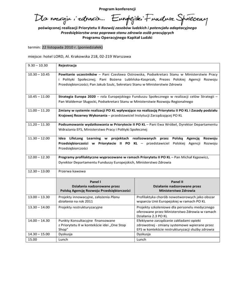 Program konferencji poświęconej realizacji Priorytetu II Rozwój zasobów ludzkich i potencjału adaptacyjnego Przedsiębiorstw oraz poprawa stanu zdrowia osób pracujących Programu Operacyjnego Kapitał Ludzki termin: 22 listopada 2010 r. (poniedziałek) miejsce: hotel LORD, Al. Krakowska 218, 02‐219 Warszawa 9.30 – 10.30 Rejestracja 10.30 – 10.45 Powitanie uczestników – Pani Czesława Ostrowska, Podsekretarz Stanu w Ministerstwie Pracy i Polityki Społecznej; Pani Bożena Lublińska‐Kasprzak, Prezes Polskiej Agencji Rozwoju Przedsiębiorczości; Pan Jakub Szulc, Sekretarz Stanu w Ministerstwie Zdrowia 10.45 – 11.00 Strategia Europa 2020 – rola Europejskiego Funduszu Społecznego w realizacji celów Strategii – Pan Waldemar Sługocki, Podsekretarz Stanu w Ministerstwie Rozwoju Regionalnego 11.00 – 11.20 Zmiany w systemie realizacji PO KL wpływające na realizację Priorytetu II PO KL i Zasady podziału Krajowej Rezerwy Wykonania – przedstawiciel Instytucji Zarządzającej PO KL 11.20 – 11.30 Podsumowanie wydatkowania w Priorytecie II PO KL – Pani Ewa Wróbel, Dyrektor Departamentu Wdrażania EFS, Ministerstwo Pracy i Polityki Społecznej 11.30 – 12.00 Idea LifeLong Learning w projektach realizowanych przez Polską Agencję Rozwoju Przedsiębiorczości w Priorytecie II PO KL – przedstawiciel Polskiej Agencji Rozwoju Przedsiębiorczości 12.00 – 12.30 Programy profilaktyczne wypracowane w ramach Priorytetu II PO KL – Pan Michał Kępowicz, Dyrektor Departamentu Funduszy Europejskich, Ministerstwo Zdrowia 12.30 – 13.00 Przerwa kawowa Panel I Działania nadzorowane przez Polską Agencję Rozwoju Przedsiębiorczości Panel II Działanie nadzorowane przez Ministerstwo Zdrowia 13.00 – 13.30 Projekty innowacyjne, założenia Planu działania na rok 2011 Profilaktyka chorób nowotworowych jako obszar wsparcia Unii Europejskiej w ramach PO KL 13.30 – 14.00 Projekty restrukturyzacyjne Projekty szkoleniowe dla personelu medycznego oferowane przez Ministerstwo Zdrowia w ramach Działania 2.3 PO KL Efektywne zarządzanie zakładami opieki zdrowotnej ‐ zmiany systemowe wpierane przez EFS w kontekście restrukturyzacji służby zdrowia Dyskusja Lunch 14.00 – 14.30 Punkty Konsultacyjne finansowane z Priorytetu II w kontekście idei „One Stop Shop” 14.30 – 15.00 Dyskusja 15.00 Lunch