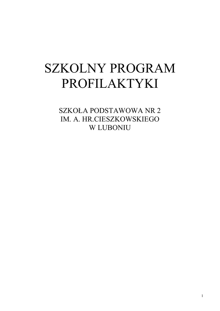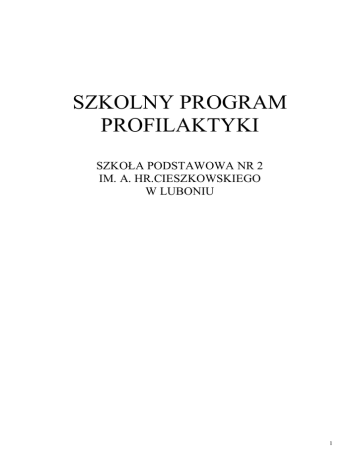 SZKOLNY PROGRAM PROFILAKTYKI SZKOŁA PODSTAWOWA NR 2 IM. A. HR.CIESZKOWSKIEGO W LUBONIU 1 WSTĘP Realizację zadań profilaktycznych w szkole zaplanowano na trzech poziomach: I poziom – profilaktyka pierwszorzędowa – działania mające na celu promocję zdrowia oraz zapobieganie pojawianiu się problemów związanych z dysfunkcjonalnym stylem życia. II poziom – profilaktyka drugorzędowa – działania mające na celu ujawnienie osób przejawiające pierwsze objawy zaburzeń oraz pomaganie im w zrozumieniu istoty problemów związanych z dysfunkcjonalnym stylem życia. III poziom – profilaktyka trzeciorzędowa – działania interwencyjne po zakończeniu pomocy terapeutyczno – rehabilitacyjnej. §1 Cele programu profilaktyki szkolnej: Wspieranie ucznia w radzeniu sobie z trudnościami zagrażającymi prawidłowemu rozwojowi poprzez: promocję zdrowia psychicznego, moralnego i fizycznego, nabywanie umiejętności aprobowanego społecznie sposobu spędzania wolnego czasu, rozwijanie umiejętności radzenia sobie w trudnych sytuacjach, wzmacnianie właściwego funkcjonowania w różnych obszarach życiowych( szkoła grupa rówieśnicza, rodzina) dostarczanie wiedzy o czynnikach i sytuacjach zagrażających zdrowiu i o konsekwencjach zachowań ryzykownych, identyfikacja osób będących w grupie podwyższonego ryzyka i wczesne rozpoznanie i likwidowanie deficytów rozwojowych. Osoby odpowiedzialne za realizacje programu: wszyscy nauczyciele Osoby odpowiedzialne za ewaluacje programu: pedagog szkolny i psycholog szkolny Osoby odpowiedzialne za sporządzenie okresowego raportu: pedagog szkolny i psycholog szkolny §2 Zadania i sposób ich realizacji: 1. Obszar zachowań zdrowotnych, profilaktyka niepowodzeń szkolnych zadania Rozpoznanie stanu zdrowia uczniów w tym psychicznego Sposób realizacji Wywiady z rodzicami adresat Wszystkie Klasy Podmioty współdziałające Wychowawca, pielęgniarka szkolna Termin realizacji Wrzesień/ październik 2 Diagnozowanie środowiska ucznia Diagnoza zespołów klasowych na terenie szkoły W miarę potrzeb Pedagog szkolny, psycholog szkolny Diagnoza zespołów klasowych Diagnoza klasy Klasy 4 i inne Stosowanie różnorodnych form nauczania umożliwiających uczniom wszechstronny rozwój Rozpoznawanie potrzeb edukacyjnych uczniów Stosowanie w procesie dydaktycznym metod aktywizujących uczniów oraz form pracy zespołowej Wychowawcy psycholog, pedagog Cały rok I semestr w miarę potrzeb Wszystkie klasy Wszyscy nauczyciele Cały rok szkolny Diagnoza dojrzałości szkolnej – współpraca wychowawców klas z PPP Analiza opinii PPP o poszczególnych uczniach. Klasy 0, 1 Wychowawcy klas 0, I Listopad /grudzień Porady, konsultacje, zajęcia psychoedukacyjne Wszystkie klasy Wychowawcy, PPP Wrzesień/ grudzień Psycholog, pedagog, PPP Cały rok Pomoc uczniom zdolnym w ukierunkowaniu aktywności Wspieranie nauczycieli i pozalekcyjnej i pozaszkolnej rodziców w działaniach Przygotowanie uczniów zdolnych do uczestnictwa w olimpiadach i wyrównujących szanse konkursach edukacyjne Konsultacje z wychowawcami i nauczycielami w zakresie postępowania Organizowanie różnych form z uczniem zdolnym opieki nad uczniem zdolnym Opis możliwych problemów ucznia zdolnego Poradnictwo dla rodziców, pomoc rodzicom w nawiązywaniu kontaktów z instytucjami działającymi na rzecz dzieci zdolnych Organizowanie różnych form Udział uczniów w ogólnoszkolnych pomocy dla wyrównywania projektach edukacyjnych szans Zachęcanie uczniów do udziału w konkursach szkolnych i pozaszkolnych. Zajęcia wyrównywania wiedzy, zajęcia korekcyjno-kompensacyjne, rewalidacyjne zajęcia psychoedukacyjne Wg potrzeb Wychowawcy, nauczyciele, psycholog, Cały rok współpraca z PPP Uczeń wg uzdolnień Wszyscy uczniowie n-le pracujący w projektach nauczyciele organizatorzy konkursów Wg harmonogra mu Cały rok Uczniowie nauczyciele wymagając wychowawcy świetlicy, Cały rok y wsparcia pedagog szkolny, terapeuci pedagog Indywidual nie psycholog Cały rok wg. potrzeb Indywidual nie Edukacja prozdrowotna wg Wszystkie Wychowawcy i nharmonogramu obchodów: klasy lprzedmiotów, Kwiecień miesiącem zdrowia – impreza pielęgniarka szkolna międzyszkolna Szkoły w Koordynator: p. Luboniu Jurga, Kwiecień 3 Kształtowanie i utrwalanie zachowań sprzyjających zdrowiu Przeprowadzenie pogadanek dla uczniów na temat konieczności zachowania zasad higieny w celu uniknięcia zakażeń i groźnych chorób. Jak ustrzec się grypy? Diagnoza zagrożeń zw. z wadami postawy i organizacja zajęć gimnastyki korekcyjnej Klasy 1-6 Wszystkie klasy wychowawcy koordynator d.s. zdrowia Cały rok Pielęgniarka/ nauczyciele Listopad/ grudzień Pielęgniarka/wychowa wcy Wrzesień grudzień Pielęgniarka przy współpracy z nauczycielem prowadzącym zajęcia Wrzesień Zajęcia cały rok Program „Moje dziecko idzie do szkoły”, program „Bądźmy zdrowi, więc działajmy”. Profilaktyka próchnicy. Wszyscy uczniowie Profilaktyka antynikotynowa „Sąd nad papierosem” Program „Między nami kobietkami – higiena okresu dojrzewania” Pielęgniarka, koordynator, wychowawcy klas Klasy 1-3 Klasy 0 Uczniowie i Pielęgniarka, rodzice wychowawcy klas Klasy 1-6 Klasy 5 Pielęgniarka, wychowawcy klas, dział E i P NFZ Wrzesień Cały rok Styczeńczerwiec Listopad Maj Kontynuacja programu społecznego „Szkoła bez przemocy” Realizacja zadań zgodnie z harmonogramem Propagowanie oferty szkoleń W trakcie spotkań grupowych i indywidualnych z rodzicami. dla rodziców i nauczycieli Na tablicy ogłoszeń. Dziewczęta klasy 6 Uczniowie Nauczyciel e Rodzice Rodzice N-le Dyrekcja Wychowawcy Nauczyciele Psycholog/ pedagog Rodzice wrzesień 2011 czerwiec 2012 Dyrektor szkoły Psycholog/ pedagog Cały rok 1. Obszar funkcjonowania osobistego i społecznego: Zadania Rozwijanie zainteresowań uczniów i propagowanie zdrowego stylu życia. Stworzenie uczniom warunków przynależności do pozytywnych grup rówieśnicz