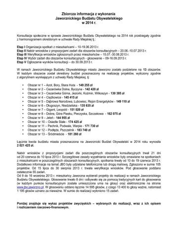 Zbiorcza informacja z wykonania Jaworznickiego Budżetu Obywatelskiego w 2014 r. Konsultacje społeczne w sprawie Jaworznickiego Budżetu Obywatelskiego na 2014 rok przebiegały zgodnie z harmonogramem określonym w uchwale Rady Miejskiej tj.: Etap I Organizacja spotkań z mieszkańcami – 10-19.06.2013 r. Etap II Nabór wniosków z propozycjami zadań dla obszarów konsultacyjnych – 20.06.-10.07.2013 r. Etap III Weryfikacja wniosków zgłoszonych przez mieszkańców – 15.07.-30.08.2013 r. Etap IV Wybór zadań dla obszarów konsultacyjnych - głosowanie – 09-16.09.2013 r. Etap V Ogłoszenie wyników konsultacji – do 30.09.2013 r. W ramach Jaworznickiego Budżetu Obywatelskiego miasto Jaworzno zostało podzielone na 13 obszarów. W każdym obszarze został określony budżet przeznaczony na realizację projektów, wyliczony zgodnie z algorytmem wynikającym z uchwały Rady Miejskiej, tj: • • • • • • • • • • • • • Obszar nr 1 – Azot, Bory, Stara Huta - 149 255 zł Obszar nr 2 – Cezarówka Dolna, Byczyna - 142 420 zł Obszar nr 3 – Cezarówka Górna, Jeziorki, Koźmin, Wilkoszyn - 130 385 zł Obszar nr 4 – Ciężkowice - 145 415 zł Obszar nr 5 – Dąbrowa Narodowa, Łubowiec, Rejon Energetyków - 149 110 zł Obszar nr 6 – Długoszyn, Niedzieliska - 135 635 zł Obszar nr 7 – Gigant, Leopold - 151 020 zł Obszar nr 8 – Dobra, Góra Piasku, Pieczyska, Szczakowa - 162 075 zł Obszar nr 9 – Jeleń - 144 955 zł Obszar nr 10 – Osiedle Stałe - 174 425 zł Obszar nr 11 – Pechnik, Podwale, Warpie - 171 730 zł Obszar nr 12 – Podłęże, Pszczelnik - 183 740 zł Obszar nr 13 – Śródmieście - 181 260 zł Łącznie kwota budżetu miasta przeznaczona na Jaworznicki Budżet Obywatelski w 2014 roku wynosiła 2 021 425 zł. Nabór wniosków z propozycjami zadań dla poszczególnych obszarów konsultacyjnych trwał 21 dni od 20 czerwca do 10 lipca 2013 r. Szczegółowe zasady wypełniania wniosków były omawiane na spotkaniach z mieszkańcami w poszczególnych obszarach konsultacyjnych, spotkania trwały od 10 do 19 czerwca 2013 r. Dodatkowo informacje na temat JBO były udzielane telefonicznie lub drogą mailową. Zgłoszono w sumie 105 projektów. Od 15 lipca do 30 sierpnia 2013 r. trwała weryfikacja wniosków. Pod głosowanie poddano ostatecznie 55 zadań. Od 9 do 16 września 2013 r. mieszkańcy Jaworzna wybierali projekty do realizacji w ramach Jaworznickiego Budżetu Obywatelskiego. Głosowanie trwało 8 dni i odbywało się za pomocą tradycyjnych kart do głosowania (w każdym punkcie konsultacyjnym została umieszczona urna na głosy) oraz elektronicznie na stronie www.jbo.jaworzno.pl. W głosowaniu oddano łącznie 14 595 głosów, z czego 13 400 to głosy ważne, natomiast 1 195 głosów uznano za nieważne. W sumie do realizacji wyłoniono 15 zadań. Poniżej znajduje się wykaz projektów zwycięskich – wybranych do realizacji, wraz z ich opisem i rozliczeniem rzeczowo-finansowym. OBSZAR NR 1 – AZOT, BORY, STARA HUTA – Kwota przeznaczona na obszar: 149 255,00 zł Zwycięskie projekty w obszarze to: 1) Zadanie nr 3 Gibas Małgorzata – „Dolina młodości – rodzinny plac zabaw z siłownią zewnętrzną” (rejon ul. Tetmajera – wzdłuż ul. Bielany) – 372 głosy. W ramach zadania zakupiono i zamontowano urządzenia placu zabaw i siłowni zewnętrznej: • zestaw zabawowy • tablicę regulaminową • ławkę metalową z oparciem • kosz na śmieci metalowy z daszkiem • bujak sprężynowiec Kwiat • huśtawkę podwójną • orbitrek • surfer podwójny • ogrodzenie z furtką Realizator zadania: Wydział Inwestycji Miejskich Poniesione koszty: 73 797,54 zł Zadanie zakończone. Administrator: Miejski Zarząd Nieruchomości Komunalnych 2) Zadanie nr 4 Kwiatkowski Józef – „Plac zabaw dla dzieci i siłownia zewnętrzna” (teren przy Gimnazjum nr 2) – 324 głosy. Zakres rzeczowy zadania obejmował zakup i montaż urządzeń placu zabaw i siłowni zewnętrznej: • huśtawka wahadłowa dwuosobowa • zestaw zabawowy • huśtawka wagowa • siłownia zewnętrzna – wyciąg górny • siłownia zewnętrzna – prasa nożna • siłownia zewnętrzna – twister • siłownia zewnętrzna – wioślarz • regulamin placu zabaw • kosz na śmieci • ogrodzenie z furtką Realizator zadania: Miejski Zespół Obsługi Placówek Oświatowo-Wychowawczych Poniesione koszty: 54 995,01 zł Zadanie zakończone. Administrator: Gimnazjum nr 2 W ramach oszczędności w obszarze zrealizowano zadanie: 3) Zadanie nr 2 Furman Anna – „Chwila oddechu na Bielańskiej” (zakup i montaż ławek wzdłuż ścieżki rowerowej przy ul. Bielańskiej). Zamontowanych zostało 19 ławek w dwóch wariantach: ławki pojedyncze – 5 szt., ławki podwójne wraz z koszem na odpady – 7 kompletów. Teren pod ławkami został utwardzony kostką betonową. Realizator zadania: Wydział Inwestycji Miejskich Poniesione koszty: 19 557,00 zł Zadanie zakończone. Administrator: Miejski Zarząd Dróg i Mostów W ramach oszczędności Wydział Inwestycji Miejskich doposażył ul. Bielańską w dodatkowe ławki. Poniesione koszty: 861,00 zł Zadanie zakończone. Oszczędności w obszarze po zrealizowaniu ww. zadań: 44,45 zł OBSZAR NR 2 – CEZARÓWKA DOLNA, BYCZYNA – Kwota przeznaczona na obszar: 142 420,00 zł Zwycięski projekt w obszarze to: 1) Zadanie nr 3 – Ochotnicza Straż Pożarna Jaworzno-Byczyna – "Remont i zagospodarowanie pomieszczeń w budynku remizy Ochotniczej Straży Pożarnej w Byczynie przy ul. Kaczeńców 1" – 961 głosów. Zakres zadania: wykonano przebudowę istniejących pomieszczeń wraz z remontem instalacji elektrycznej, wodno-kanalizacyjnej, instalacji c.o. oraz remont sanitariatów na I piętrze budynku. Realizator zadania: Miejski Zarząd Nieruchomości Komunalnych Poniesione koszty: 122 262,00 zł Zadanie zakończone. Administrator: Miejski Zarząd Nieruchomości Komunalnych W ramach oszczędności pozosta