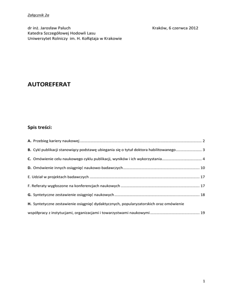 Załącznik 2a dr inż. Jarosław Paluch Katedra Szczegółowej Hodowli Lasu Uniwersytet Rolniczy im. H. Kołłątaja w Krakowie Kraków, 6 czerwca 2012 AUTOREFERAT Spis treści: A. Przebieg kariery naukowej ................................................................................................................. 2 B. Cykl publikacji stanowiący podstawę ubiegania się o tytuł doktora habilitowanego ........................ 3 C. Omówienie celu naukowego cyklu publikacji, wyników i ich wykorzystania..................................... 4 D. Omówienie innych osiągnięć naukowo-badawczych ....................................................................... 10 E. Udział w projektach badawczych ...................................................................................................... 17 F. Referaty wygłoszone na konferencjach naukowych ......................................................................... 17 G. Syntetyczne zestawienie osiągnięć naukowych ............................................................................... 18 H. Syntetyczne zestawienie osiągnięć dydaktycznych, popularyzatorskich oraz omówienie współpracy z instytucjami, organizacjami i towarzystwami naukowymi .............................................. 19 1 Załącznik 2a A. Przebieg kariery naukowej 1. Imię i Nazwisko: Jarosław Grzegorz Paluch 2. Dyplomy i stopnie naukowe: 1997 – dyplom magistra inżyniera leśnictwa (Wydział Leśny, Akademia Rolnicza im. H. Kołłątaja w Krakowie) 2003 – stopień doktora nauk leśnych nadany uchwałą Rady Wydziału Leśnego Uniwersytetu Rolniczego im. H. Kołłątaja w Krakowie z dnia 23 czerwca 2003 r. na podstawie rozprawy „Procesy kształtujące wzorzec rozmieszczenia drzew w eutroficznych jedlinach karpackich o charakterze przerębowym” 3. Dotychczasowe zatrudnienie w jednostkach naukowych: od 01.10.2003 r. – Uniwersytet Rolniczy im. H. Kołłątaja w Krakowie, Wydział Leśny 2 Załącznik 2a B. Cykl publikacji stanowiący podstawę ubiegania się o tytuł doktora habilitowanego „Wpływ wzorca dyspersji nasion i zróżnicowania mikrosiedliskowego na przestrzenną zmienność zagęszczenia odnowień jodły pospolitej (Abies alba Mill.) w drzewostanach karpackich” 1. Paluch J.1, Gruba P., 2010. Relationships between local stand density and local species composition and nutrient content in the topsoil of pure and mixed stands of silver fir (Abies alba Mill.). European Journal of Forest Research 129: 509−520. 2. Paluch J.1, Gruba P. 2011. Inter-crown versus under-crown area: contribution of local configuration of trees to variation in topsoil morphology, pH and moisture in Abies alba Mill. forests. European Journal of Forest Research 131: 857−870. 3. Paluch J.1, Gruba P., 2012. Effect of local species composition on topsoil properties in mixed stands with silver fir (Abies alba Mill.). Forestry. doi: 10.1093/forestry/cps040. 4. Paluch J., 2011. Ground seed density patterns under conditions of strongly overlapping seed shadows in Abies alba Mill. stands. European Journal of Forest Research 130: 1009−1022. 5. Paluch J.2, Stępniewska H., 2012. Effect of microsites on the survival, density, and ectomycorrhizal status of shade-tolerant Abies alba regeneration attacked by fungal pathogens. Canadian Journal of Forest Research 42: 720−732. 1 udział własny 95 % − pomysłodawca, główny wykonawca prac terenowych, autor obliczeń i główny autor tekstu publikacji 2 udział własny 80 % − pomysłodawca, wykonawca prac terenowych, autor obliczeń i główny autor tekstu publikacji 3 Załącznik 2a C. Omówienie celu naukowego cyklu publikacji, wyników i ich wykorzystania Naturalne odnowienie pod okapem drzewostanu ma szereg zalet. Należą do nich między innymi mniejsza kosztochłonność, możliwość całkowitego lub częściowego wyeliminowania zabiegów intensywnego przygotowania gleby prowadzących do zniekształcenia jej wierzchnich poziomów, możliwość stosowania małopowierzchniowych form odnowienia sprzyjających kształtowaniu drzewostanów o złożonej teksturze bez obawy istotnego zwiększenia kosztów, czy łatwiejsza adaptacja młodego pokolenia do lokalnych warunków. Naturalne odnowienie drzewostanów ma jednak również szereg wad. Jedną z najistotniejszych jest ograniczona możliwość kontrolowania tego procesu, który może być warunkowany przez wiele czynników o mniej lub bardziej stochastycznym charakterze, jak na przykład dostępność nasion, warunki pogodowe, właściwości podłoża, czy wpływ patogenów grzybowych. W konsekwencji, odnowienia naturalne cechują się często niepełnym stopniem pokrycia, nierównomiernym zagęszczeniem lub wymagają uzupełnienia przez odnowienie sztuczne. W przypadku jodły pospolitej (Abies alba Mill.) cechami potencjalnie ułatwiającymi powstawanie wartościowych odnowień naturalnych jest duża cieniowytrzymałość i plastyczność rozwojowa tego gatunku. Z drugiej strony, cechami utrudniającymi naturalne odnowienie jodły jest presja ze strony dużych roślinożerców i patogenów grzybowych, wolna akumulacja banku odnowienia oraz znaczna wybiórczość mikrosiedliskowa przejawiająca się nierównomiernym rozmieszczeniem nalotu i podrostu, a w części drzewostanów nawet jego zupełnym brakiem. W przedstawionym cyklu publikacji zainteresowania badawcze autora koncentrowały się na rozpoznaniu wpływu wzorca dyspersji nasion i zróżnicowania mikrosiedliskowego kształtowanego przez lokalne zagęszczenie drzew na przestrzenną zmienność zagęszczenia odnowień jodłowych. Inspiracją do podjęcia tego tematu były wyniki wcześniejszych badań prowadzonych w karpackich drzewostanach wszechgeneracyjnych3, które wskazywały, że rozmieszczenie drzew młodszych generacji wyraźnie odbiega od modelu losowego i cechuje się silną dodatnią korelacją przestrzenną względem drzew warstwy górnej. Wyniki te prowadziły do postawienia dw