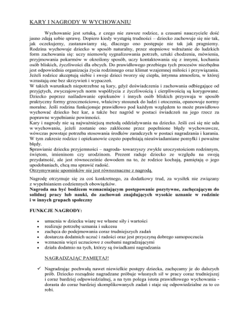 KARY I NAGRODY W WYCHOWANIU Wychowanie jest sztuką, z czego nie zawsze rodzice, a czasami nauczyciele dość jasno zdają sobie sprawę. Dopiero kiedy wystąpią trudności – dziecko zachowuje się nie tak, jak oczekujemy, zastanawiamy się, dlaczego ono postępuje nie tak jak pragniemy. Rodzina wychowuje dziecko w sposób naturalny, przez stopniowe wdrażanie do ludzkich form zachowania się: uczy niemowlę sygnalizowania potrzeb, sztuki chodzenia, mówienia, przyjmowania pokarmów w określony sposób, uczy kontaktowania się z innymi, kochania osób bliskich, życzliwości dla obcych. Do prawidłowego przebiegu tych procesów niezbędna jest odpowiednia organizacja życia rodzinnego oraz klimat wzajemnej miłości i przywiązania. Jeżeli rodzice akceptują siebie i swoje dzieci tworzy się ciepła, intymna atmosfera, w której wzrastają one bez skrzywień i wypaczeń. W takich warunkach niepotrzebne są kary, gdyż doświadczenia i zachowania odbiegające od przyjętych, zwyczajowych norm współżycia z życzliwością i cierpliwością są korygowane. Dziecko poprzez naśladowanie opiekunów i innych osób bliskich przyswaja w sposób praktyczny formy grzecznościowe, właściwy stosunek do ludzi i otoczenia, opanowuje normy moralne. Jeśli rodzina funkcjonuje prawidłowo pod każdym względem to może prawidłowo wychować dziecko bez kar, a także bez nagród w postaci świadczeń na jego rzecz za poprawne wypełnianie powinności. Kary i nagrody nie są najważniejszą metodą oddziaływania na dziecko. Jeśli coś się nie uda w wychowaniu, jeżeli zostanie ono zakłócone przez popełnione błędy wychowawcze, wówczas powstaje potrzeba stosowania środków zaradczych w postaci nagradzania i karania. W tym zakresie rodzice i opiekunowie często popełniają nieuświadamiane pomyłki i poważne błędy. Sprawianie dziecku przyjemności – nagroda- towarzyszy zwykle uroczystościom rodzinnym, świętom, imieninom czy urodzinom. Prezent raduje dziecko ze względu na swoją przydatność, ale jest równocześnie dowodem na to, że rodzice kochają, pamiętają o jego upodobaniach, chcą mu sprawić radość. Otrzymywanie upominków nie jest równoznaczne z nagrodą. Nagrodę otrzymuje się za coś konkretnego, za dodatkowy trud, za wysiłek nie związany z wypełnianiem codziennych obowiązków. Nagroda ma być bodźcem wzmacniającym postępowanie pozytywne, zachęcającym do solidnej pracy lub nauki, do zachowań znajdujących wysokie uznanie w rodzinie i w innych grupach społeczny FUNKCJE NAGRODY: umacnia w dziecku wiarę we własne siły i wartości realizuje potrzebę uznania i sukcesu zachęca do podejmowania coraz trudniejszych zadań dostarcza dodatnich uczuć i radości oraz jest przyczyną dobrego samopoczucia wzmacnia więzi uczuciowe z osobami nagradzającymi działa dodatnio na tych, którzy są świadkami nagradzania NAGRADZAJĄC PAMIĘTAJ! Nagradzając pochwałą nawet niewielkie postępy dziecka, zachęcamy je do dalszych prób. Dziecko rozsądnie nagradzane próbuje własnych sił w pracy coraz trudniejszej i coraz bardziej odpowiedzialnej, a na tym polega istota prawidłowego wychowania dorasta do coraz bardziej skomplikowanych zadań i staje się odpowiedzialne za to co robi. Nagradzać należy tylko dziecko, które na to rzeczywiście zasłużyło. Nie powinno nagradzać się dzieci za otrzymywanie dobrych ocen, bo wówczas większość dzieci uczy się nie po to, aby zaspakajać własną ciekawość, dla siebie, ale dla oceny, potem wiedzę zapomina – ocenę wystawiono i nagrodę dziecko otrzymało. Nagroda wzmacnia reakcje, za które została przyznana, dlatego należy dostrzegać i rozumieć wysiłek wkładany w wykonywanie podejmowanych czynności. Wzmacnianie nagrodą pozytywnej motywacji do działania wymaga ciągłego zastanawiania się nad tym, dlaczego dziecko zachowuje się tak, a nie inaczej. Brak nagród może być równie groźny jak ich nadmiar. Dzieci należy przygotować do tego, że nie każdy ich wysiłek zostanie dostrzeżony i nagrodzony. Warunkiem skutecznego nagradzania jest dobra znajomość dziecka. Poznać dziecko tzn. je zrozumieć, patrzeć na konfliktowe, sporne sprawy również jego oczami, znać jego pragnienia. Nagroda powinna sprawić dziecku odczuwalną przez niego radość. Należy stosować różne nagrody, by nie nastąpiło osłabienie siły ich oddziaływania, a więc zmniejszanie się ich wartości. Rodzaje stosowanych nagród: nagradzanie pochwałą i uznaniem – najczęściej stosowane, werbalna aprobata postępowania dziecka, podziw, że potrafiło wykonać zadanie w sposób wyjątkowo udany, uśmiech i radość czy przytulenie, jeśli dziecko lgnie do rodziców i sprawia mu to przyjemność. Uznanie i pochwała powinny być proporcjonalne do wyłożonego wysiłku i chęci, aby na nie zasłużyć. Wartość pochwały zależy od tego, kto jej udziela i w jakich okolicznościach (tym większa im większy w oczach dziecka autorytet osoby, która pochwaliła) nagradzanie przez sprawianie przyjemności dziecku – może to być wspólny spacer z rodzicami, wyjście do kina, wyrażanie zgody na spotkanie z kolegami, wyjazd na wycieczkę, wspólna gra, itp. darzenie zaufaniem – jest bardzo pożądane przez dzieci, ma wysokie walory wychowawcze. Odebranie zaufania jest poważną karą. Dziecko, które wie, że rodzice mu ufają, ma dobre samopoczucie, odczuwa swoją wartość, ma przedsmak upragnionej samodzielności i dorosłości; zaufanie polega również na zmniejszaniu kontroli nad wszystkim co dziecko robi, czym się zajmuje i z kim się bawi, itp. wspólne atrakcyjne spędzanie wolnego czasu, np. wycieczki; sposób jest bardzo dobry lecz kosztowny i wymaga dużo wolnego czasu nagrody rzeczowe – chętnie i z wdzięcznością przyjmowane przez dzieci, zwłaszcza przez te, których rodziców nie na wszystko stać; nagroda rzeczowa to prezent za konkretną działalność lub określone postępowanie, dar zasłu