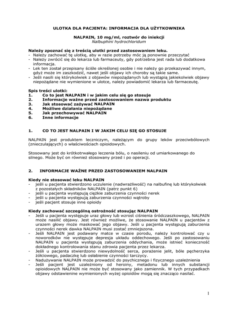 ULOTKA DLA PACJENTA: INFORMACJA DLA UŻYTKOWNIKA NALPAIN, 10 mg/ml, roztwór do iniekcji Nalbuphini hydrochloridum Należy zpoznać się z treścią ulotki przed zastosowaniem leku. - Należy zachować tę ulotkę, aby w razie potrzeby móc ją ponownie przeczytać - Należy zwrócić się do lekarza lub farmaceuty, gdy potrzebna jest rada lub dodatkowa informacja. - Lek ten został przepisany ściśle określonej osobie i nie należy go przekazywać innym, gdyż może im zaszkodzić, nawet jeśli objawy ich choroby są takie same. - Jeśli nasili się którykolwiek z objawów niepożądanych lub wystąpią jakiekolwiek objawy niepożądane nie wymienione w ulotce, należy powiadomić lekarza lub farmaceutę. Spis treści ulotki: 1. Co to jest NALPAIN i w jakim celu się go stosuje 2. Informacje ważne przed zastosowaniem nazwa produktu 3. Jak stosować zażywać NALPAIN 4. Możliwe działania niepożądane 5. Jak przechowywać NALPAIN 6. Inne informacje 1. CO TO JEST NALPAIN I W JAKIM CELU SIĘ GO STOSUJE NALPAIN jest produktem leczniczym, należącym do grupy leków przeciwbólowych (znieczulających) o właściwościach opioidowych. Stosowany jest do krótkotrwałego leczenia bólu, o nasileniu od umiarkowanego do silnego. Może być on również stosowany przed i po operacji. 2. INFORMACJE WAŻNE PRZED ZASTOSOWANIEM NALPAIN Kiedy nie stosować leku NALPAIN - jeśli u pacjenta stwierdzono uczulenie (nadwrażliwość) na nalbufinę lub którykolwiek z pozostałych składników NALPAIN (patrz punkt 6) - jeśli u pacjenta występują ciężkie zaburzenia czynności nerek - jeśli u pacjenta występują zaburzenia czynności wątroby - jeśli pacjent stosuje inne opioidy Kiedy zachować szczególną ostrożność stosując NALPAIN - Jeśli u pacjenta występuje uraz głowy lub wzrost ciśnienia śródczaszkowego, NALPAIN może nasilić objawy. Jest również możliwe, że stosowanie NALPAIN u pacjentów z urazem głowy może maskować jego objawy. Jeśli u pacjenta występują zaburzenia czynności nerek dawka NALPAIN musi zostać zmniejszona. - Jeśli NALPAIN jest podawany matce w czasie porodu, należy kontrolować czy u noworodków nie występuje depresja układu oddechowego. Jeśli po zastosowaniu NALPAIN u pacjenta występują zaburzenia oddychania, może istnieć konieczność dokładnego kontrolowania stanu zdrowia pacjenta przez lekarza. - Jeśli u pacjenta stwierdzono niewydolność serca, porażenie jelit, bóle pęcherzyka żółciowego, padaczkę lub osłabienie czynności tarczycy. - Nadużywanie NALPAIN może prowadzić do psychicznego i fizycznego uzależnienia - Jeśli pacjent jest uzależniony od heroiny, metadonu lub innych substancji opioidowych NALPAIN nie może być stosowany jako zamiennik. W tych przypadkach objawy odstawienine wymienionych wyżej opioidów mogą się znacząco nasilać. 1 Należy zapytać lekarza, czy którekolwiek z powyższych ostrzeżeń odnosi się do pacjenta lub odnosiło się do niego w przeszłości. Stosowanie NALPAIN z innymi lekami Inne leki mogą mieć wpływ na działanie NALPAIN. Należy powiedzieć lekarzowi o wszystkich przyjmowanych ostatnio lekach, również tych, które wydawane są bez recepty. - Sojarzenie leku ze specyficznymi narkotykami (opioidy) jest niewskazane. Działanie przeciwbólowe może zostać wówczas zmniejszone. Należy unikać alkoholu i produktów leczniczych zawierających alkohol. Stosowanie NALPAIN w skojarzeniu z innymi lekami zmniejszającymi uczucie lęku i niepokoju (anksjolitykami) lub jednoczesne stosowanie NALPAIN z opioidowymi analgetykami (przeciwbólowymi), fenotiazynami (leki stosowane w schizofrenii) lub innymi lekami uspokajającymi, nasennymi lub podobnymi, które mają wpływ na ośrodkowy układ nerwowy, mogą powodować nasilenie działań niepożądanych. Lekarz musi dostosować dawkę NALPAIN lub innego produktu leczniczego. Ciąża i karmienie piersią Przed zastosowaniem każdego leku należy poradzić się lekarza. Nie ma wystarczających danych dotyczących możliwego szkodliwego wpływu NALPAIN na ciążę u ludzi. Jeśli NALPAIN jest podawany matce w czasie porodu należy kontrolować czy u noworodków nie występuje depresja oddechowa i zaburzenia rytmu serca (patrz punkt 4, Możliwe działania niepożądane). NALPAIN przenika do mleka kobiecego. Należy przerwać karmienie piersią na 24 godziny w czasie leczenia NALPAIN. Prowadzenie pojazdów i obsługa maszyn NALPAIN zmniejsza szybkość reakcji. Dlatego też należy unikać prowadzenia samochodu i obsługiwania maszyn podczas leczenia NALPAIN. Inne mogące wystąpić działania niepożądane zostały wyszczególnione w punkcie 4. Ważne informacje o niektórych składnikach NALPAIN Ten produkt leczniczy zawiera mniej niż 1 mmol sodu (23 mg) na dawkę, tzn. jest zasadniczo wolny od sodu. 3. JAK STOSOWAĆ NALPAIN NALPAIN jest podawany wyłącznie przez lekarza lub pielęgniarkę. Dawkowanie Dorośli U dorosłych najczęściej stosowana dawka wynosi 10 - 20 mg dla osób o masie ciała 70 kg, przy podaniu dożylnym, domięśniowym lub podskórnym. Dawka ta w razie konieczności może być powtórzona po 3-6 godzinach. Dawkowanie musi być dostosowane do nasilenia bólu oraz ogólnego stanu pacjenta. Dzieci i młodzież Typowa dawka u dzieci wynosi 0,1 co 0,2 mg/kg masy ciała, przy podaniu dożylnym, domięśniowym lub podskórnym. Dawka ta może być w razie konieczności powtórzona po 3-6 godzinach. Maksymalna dawka jednorazowa zdefiniowana jest jako 0,2 mg nalbufiny na kilogram masy ciała. Czas trwania leczenia Czas trwania leczenia określa lekarz. 2 Jeżeli pacjent zauważy, że działanie NALPAIN jest zbyt silne lub zbyt słabe, powinien zwrócić się do lekarza lub pielęgniarki o poradę. Zastosowanie większej niż zalecana dawkiNALPAIN Zastosowanie większej dawki NALPAIN niż zalecana może powodować objawy depresji oddechowej, ospałości lub utratę przytomności. Ponieważ jednak lek ten będzie podawany w czasie