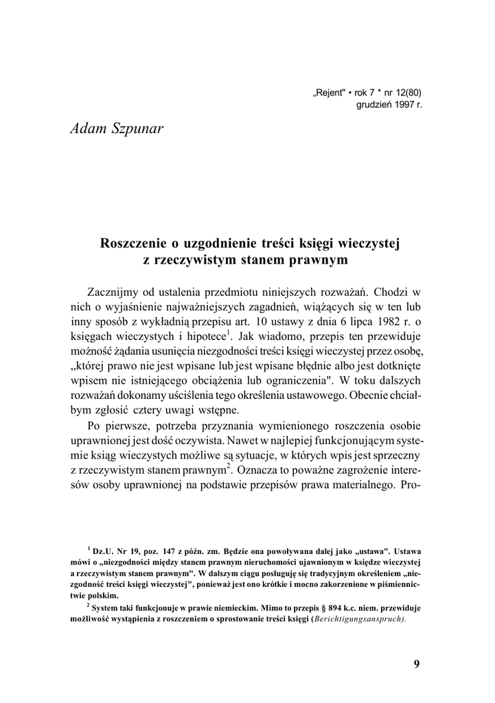 „Rejent" • rok 7 * nr 12(80) grudzień 1997 r. Adam Szpunar Roszczenie o uzgodnienie treści księgi wieczystej z rzeczywistym stanem prawnym Zacznijmy od ustalenia przedmiotu niniejszych rozważań. Chodzi w nich o wyjaśnienie najważniejszych zagadnień, wiążących się w ten lub inny sposób z wykładnią przepisu art. 10 ustawy z dnia 6 lipca 1982 r. o księgach wieczystych i hipotece1. Jak wiadomo, przepis ten przewiduje możność żądania usunięcia niezgodności treści księgi wieczystej przez osobę, „której prawo nie jest wpisane lub jest wpisane błędnie albo jest dotknięte wpisem nie istniejącego obciążenia lub ograniczenia". W toku dalszych rozważań dokonamy uściślenia tego określenia ustawowego. Obecnie chciałbym zgłosić cztery uwagi wstępne. Po pierwsze, potrzeba przyznania wymienionego roszczenia osobie uprawnionej jest dość oczywista. Nawet w najlepiej funkcjonującym systemie ksiąg wieczystych możliwe są sytuacje, w których wpis jest sprzeczny z rzeczywistym stanem prawnym2. Oznacza to poważne zagrożenie interesów osoby uprawnionej na podstawie przepisów prawa materialnego. Pro- 1 Dz.U. Nr 19, poz. 147 z późn. zm. Będzie ona powoływana dalej jako „ustawa". Ustawa mówi o „niezgodności między stanem prawnym nieruchomości ujawnionym w księdze wieczystej a rzeczywistym stanem prawnym". W dalszym ciągu posługuję się tradycyjnym określeniem „niezgodność treści księgi wieczystej", ponieważ jest ono krótkie i mocno zakorzenione w piśmiennictwie polskim. 2 System taki funkcjonuje w prawie niemieckim. Mimo to przepis § 894 k.c. niem. przewiduje możliwość wystąpienia z roszczeniem o sprostowanie treści księgi (Berichtigungsanspruch). 9 Adam Szpunar stym przykładem może być wpisanie jako właściciela nabywcy nieruchomości (osoby B), podczas gdy w rzeczywistości właścicielem pozostaje nadal osoba A, bo zbycie zostało dokonane przez jej nieumocowanego pełnomocnika. Innym przykładem będzie wykreślenie bez podstawy prawnej hipoteki. Jak powszechnie wiadomo, polski system ksiąg wieczystych jest z natury rzeczy niedoskonały. Wciąż występują niezgodności między treścią księgi wieczystej a rzeczywistym stanem prawnym. Można wymienić wiele przyczyn tego zjawiska. Wystarczy przypomnieć, że wpis prawa własności ma tylko znaczenie deklaratywne. Wpis nie jest konieczną przesłanką przeniesienia prawa własności nieruchomości. Można zatem powiedzieć, że obrót nieruchomościami odbywa się bardzo często pozaksięgowo. Trzeba także pamiętać, że umowa o przeniesienie własności nieruchomości ma zawsze charakter kauzalny (por. art. 156 k.c.). Jeżeli podstawa prawna tej umowy była nieważna, własność nieruchomości nie przejdzie na nabywcę, chociaż został on wpisany do księgi wieczystej. Niewątpliwie zachodzi wówczas niezgodność między treścią księgi wieczystej a rzeczywistym stanem prawnym. Roszczenie z art. 10 ustawy ma na celu usunięcie tej rozbieżności. Może ona bowiem prowadzić do utraty prawa rzeczywiście przysługującego uprawnionemu (prawdziwemu właścicielowi), jeżeli wpisany do księgi wieczystej dokona skutecznego rozporządzenia na rzecz osoby trzeciej. Po drugie, wyłania się pytanie, kiedy właściwie treść księgi wieczystej jest niezgodna z rzeczywistym stanem prawnym. Odpowiedź na tak postawione pytanie jest na tle prawa polskiego bardziej skomplikowana, niż się to wydaje na pierwszy rzut oka. Liczne zmiany w stanie prawnym (przeniesienie własności, ustanowienie służebności gruntowej lub użytkowania) nie muszą być ujawnione w księdze wieczystej. Jeżeli nie nastąpił wpis takiego prawa, nie można powiedzieć, że treść księgi wieczystej jest niezgodna z rzeczywistym stanem prawnym. W rachubę mogą wówczas wchodzić roszczenia różnego typu (rzeczowe lub obligacyjne), ale roszczenie z art. 10 ustawy nie jest w tym wypadku aktualne. Główny zrąb niniejszych uwag jest poświęcony roszczeniu z art. 10 ustawy. Należy także uwzględnić powiązania z innymi przepisami ustawy. W szczególności znaczenie wpisu ostrzeżenia będzie omówione w końcowej części rozważań. 10 Roszczenie o uzgodnienie treści księgi wieczystej.. Po trzecie, orzecznictwo na temat wykładni art. 10 ustawy jest bardzo bogate3. Przy bliższej analizie okazuje się jednak, że jest ono niejednolite. Także w wypowiedziach doktryny występują liczne kontrowersje. Główną tego przyczyną jest okoliczność, że nie można należycie zrozumieć art. 10 ustawy w oderwaniu od całokształtu obowiązujących przepisów prawnych. Chodzi tutaj nie tylko o powiązania z innymi przepisami ustawy, chociaż i ta sprawa wywołuje wiele wątpliwości. Ale w orbitę rozważań muszą być wciągnięte także przepisy prawa cywilnego (w szerokim tego słowa znaczeniu). Najprostszym przykładem tego związku są wciąż występujące wątpliwości co do oceny stanów faktycznych, w których jako właściciel figuruje w księdze wieczystej tylko jeden małżonek, chociaż nieruchomość ta stanowi przedmiot majątku wspólnego. Na temat usunięcia tej niezgodności wciąż występują kontrowersje w orzecznictwie i doktrynie. Poza tym sam charakter prawny dochodzonego na podstawie art. 10 ustawy roszczenia jest różnie ujmowany. Po czwarte, chodzi o określenie stosunku do dawnego prawa. Ustawa nie powstała w próżni i w poważnym zakresie stanowi kontynuację poprzednio zunifikowanego prawa. Łatwo zauważyć, że przepis art. 23 pr. rzecz, z 1946 r. został przejęty ze zmianami jedynie o charakterze redakcyjnym. Pozwala to na ostrożne wykorzystanie dorobku nauki i judykatury dotyczącego dawnego prawa o księgach wieczystych. W związku z tym chciałbym przytoczyć ważną wypowiedź na interesujący nas temat4. Postępowanie (określone obecnie w art. 10 ustawy) prowadzi nie tylko do obalenia domniemania wynikającego z wpisu do księgi wieczystej (obec