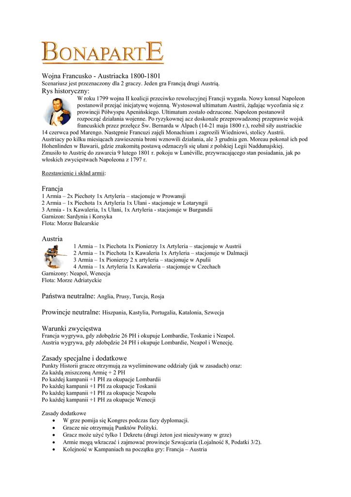 Wojna Francusko - Austriacka 1800-1801 Scenariusz jest przeznaczony dla 2 graczy. Jeden gra Francją drugi Austrią. Rys historyczny: W roku 1799 wojna II koalicji przeciwko rewolucyjnej Francji wygasła. Nowy konsul Napoleon postanowił przejąć inicjatywę wojenną. Wystosował ultimatum Austrii, żądając wycofania się z prowincji Półwyspu Apenińskiego. Ultimatum zostało odrzucone. Napoleon postanowił rozpocząć działania wojenne. Po ryzykownej acz doskonale przeprowadzonej przeprawie wojsk francuskich przez przełęcz Św. Bernarda w Alpach (14-21 maja 1800 r.), rozbił siły austriackie 14 czerwca pod Marengo. Następnie Francuzi zajęli Monachium i zagrozili Wiedniowi, stolicy Austrii. Austriacy po kilku miesiącach zawieszenia broni wznowili działania, ale 3 grudnia gen. Moreau pokonał ich pod Hohenlinden w Bawarii, gdzie znakomitą postawą odznaczyli się ułani z polskiej Legii Naddunajskiej. Zmusiło to Austrię do zawarcia 9 lutego 1801 r. pokoju w Lunéville, przywracającego stan posiadania, jak po włoskich zwycięstwach Napoleona z 1797 r. Rozstawienie i skład armii: Francja 1 Armia – 2x Piechoty 1x Artyleria – stacjonuje w Prowansji 2 Armia – 1x Piechota 1x Artyleria 1x Ułani - stacjonuje w Lotaryngii 3 Armia - 1x Kawaleria, 1x Ułani, 1x Artyleria - stacjonuje w Burgundii Garnizon: Sardynia i Korsyka Flota: Morze Balearskie Austria 1 Armia – 1x Piechota 1x Pionierzy 1x Artyleria – stacjonuje w Austrii 2 Armia – 1x Piechota 1x Kawaleria 1x Artyleria – stacjonuje w Dalmacji 3 Armia – 1x Pionierzy 2 x artyleria – stacjonuje w Apulii 4 Armia – 1x Artyleria 1x Kawaleria – stacjonuje w Czechach Garnizony: Neapol, Wenecja Flota: Morze Adriatyckie Państwa neutralne: Anglia, Prusy, Turcja, Rosja Prowincje neutralne: Hiszpania, Kastylia, Portugalia, Katalonia, Szwecja Warunki zwycięstwa Francja wygrywa, gdy zdobędzie 26 PH i okupuje Lombardie, Toskanie i Neapol. Austria wygrywa, gdy zdobędzie 24 PH i okupuje Lombardie, Neapol i Wenecję. Zasady specjalne i dodatkowe Punkty Historii gracze otrzymują za wyeliminowane oddziały (jak w zasadach) oraz: Za każdą zniszczoną Armię + 2 PH Po każdej kampanii +1 PH za okupacje Lombardii Po każdej kampanii +1 PH za okupacje Toskanii Po każdej kampanii +1 PH za okupacje Neapolu Po każdej kampanii +1 PH za okupacje Wenecji Zasady dodatkowe • W grze pomija się Kongres podczas fazy dyplomacji. • Gracze nie otrzymują Punktów Polityki. • Gracz może użyć tylko 1 Dekretu (drugi żeton jest nieużywany w grze) • Armie mogą wkraczać i zajmować prowincje Szwajcaria (Lojalność 8, Podatki 3/2). • Kolejność w Kampaniach na początku gry: Francja – Austria