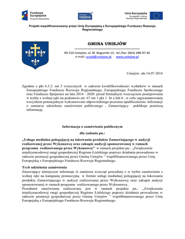 Projekt współfinansowany przez Unię Europejską z Europejskiego Funduszu Rozwoju Regionalnego GMINA UNIEJÓW ------------------------------------------------99-210 Uniejów, ul. Bł. Bogumiła 13, tel./fax: (063) 288-97-44 e-mail: [email protected], www.uniejow.pl Uniejów ,dn.14.07.2016 Zgodnie z pkt 6.5.2. ust 3 wytycznych w zakresie kwalifikowalności wydatków w ramach Europejskiego Funduszu Rozwoju Regionalnego, Europejskiego Funduszu Społecznego oraz Funduszu Spójności na lata 2014 - 2020. przed formalnym wszczęciem postepowania w trybie z wolnej ręki na podstawie art. 67 ust 1 pkt 1 lit a lub b , w celu zagwarantowania wszystkim potencjalnym wykonawcom odpowiedniego poziomu upublicznienia informacji o zamiarze udzielenia zamówienia publicznego , Zamawiający publikuje poniższą informację . Informacja o zamówieniu publicznym dla zadania pn.: „Usługa medialna polegającej na lokowaniu produktu Zamawiającego w audycji realizowanej przez Wykonawcę oraz zakupie audycji sponsorowanej w ramach programu realizowanego przez Wykonawcę” w ramach projektu pn.: „Zwiększenie międzynarodowej rangi gospodarczej Regionu Łódzkiego poprzez działania prowadzone w zakresie promocji gospodarczej przez Gminę Uniejów ” współfinansowanego przez Unię Europejską z Europejskiego Funduszu Rozwoju Regionalnego. Tryb udzielenia zamówienia Zmawiający niniejszym informuje iż zamierza wszcząć procedurę z w trybie zamówienia z wolnej ręki na kampanię promocyjną w formie usługi medialnej polegającej na lokowaniu produktu Zamawiającego w audycji realizowanej przez Wykonawcę oraz zakupie audycji sponsorowanej w ramach programu realizowanego przez Wykonawcę . Przedmiot zamówienia realizowany jest w ramach projektu pn.: „Zwiększenie międzynarodowej rangi gospodarczej Regionu Łódzkiego poprzez działania prowadzone w zakresie promocji gospodarczej przez Gminę Uniejów ” współfinansowanego przez Unię Europejską z Europejskiego Funduszu Rozwoju Regionalnego. Projekt współfinansowany przez Unię Europejską z Europejskiego Funduszu Rozwoju Regionalnego I. Nazwa oraz adres Zamawiającego: Zamawiający: Gmina Uniejów ulica: Błogosławionego Bogumiła 13 kod miejscowości: 99 – 210 Uniejów telefon: 63 288 97 44 Faks: 63 28 89 743; 63 28 88 192 wew. 43 Strona internetowa zamawiającego: www.uniejow.pl Adres e-mail: [email protected] Godziny urzędowania: Poniedziałek: 9.00 – 17.00 Wtorek – piątek: 8.00 – 16.00 2.Opis przedmiotu zamówienia: Przedmiotem zamówienia jest wykonanie usługi medialnej polegającej na lokowaniu produktu Zamawiającego w audycji realizowanej przez Wykonawcę oraz zakupie audycji sponsorowanej w ramach programu realizowanego przez Wykonawcę w ramach projektu pn.: „Zwiększenie międzynarodowej rangi gospodarczej Regionu Łódzkiego poprzez działania prowadzone w zakresie promocji gospodarczej przez Gminę Uniejów ” współfinansowanego przez Unię Europejską z Europejskiego Funduszu Rozwoju Regionalnego. W ramach niniejszego postępowania lokowanie produktu rozumieć należy jako zgodne z USTAWĄ z dnia 29 grudnia 1992 r. o radiofonii i telewizji (t.j. Dz. U. z 2016 r. Poz. 639), tj.: lokowaniem produktu jest przekaz handlowy polegający na przedstawieniu lub nawiązywaniu do towaru, usługi lub ich znaku towarowego w taki sposób, że stanowią one element samej audycji w zamian za opłatę lub podobne wynagrodzenie, a także w postaci nieodpłatnego udostępnienia towaru lub usługi; lokowaniem tematu jest przekaz handlowy polegający na nawiązywaniu do towaru, usługi lub ich znaku towarowego w scenariuszu lub liście dialogowej audycji w zamian za opłatę lub podobne wynagrodzenie; przekazem handlowym jest każdy przekaz, w tym obrazy z dźwiękiem lub bez dźwięku albo tylko dźwięki, mający służyć bezpośrednio lub pośrednio promocji towarów, usług lub renomy podmiotu prowadzącego działalność gospodarczą lub zawodową, towarzyszący audycji lub włączony do niej, w zamian za opłatę lub podobne wynagrodzenie, albo w celach autopromocji, w szczególności reklama, sponsorowanie, telesprzedaż i lokowanie produktu; sponsorowaniem jest każdy wkład w finansowanie usługi medialnej lub audycji, przez podmiot, który nie dostarcza usług medialnych i nie produkuje audycji, w celu promocji jego nazwy, firmy, renomy, działalności, towaru lub usługi, znaku towarowego lub innego oznaczenia indywidualizującego; Ze względu na charakter zadania jakie zamierza Zamawiający zrealizować tj. promocję gospodarczą regionu wymagane jest aby Wykonawca dysponował możliwością realizacji studia plenerowego w zakresie swojej oferty programowej o zasięgu ogólnokrajowym. Zamawiający oczekuje realizacji zadania poprzez lokowanie produktu w audycji realizowanej przez Wykonawcę jako co najmniej dwudniowe plenerowe studio na terenie Projekt współfinansowany przez Unię Europejską z Europejskiego Funduszu Rozwoju Regionalnego uzdrowiska Uniejów. Wykonawca musi posiadać techniczne możliwości przeprowadzenia takiej audycji w formie wyjazdowej. Kampania promocyjna służyć ma poprawie wizerunku województwa łódzkiego oraz promocji wizerunkowej „Marki Łódzkie” Kod CPV 79.34.00.00-9.Usługi reklamowe i marketingowe Planowany termin wykonania przedmiotu zamówienia 6-7 sierpnia 2016 3. Kryteria oceny ofert wstępnych Przy wyborze ofert Zamawiający będzie się kierował następującymi kryteriami: 1. cena – 60% 2. jakość briefu medialnego 40% 1a Przyznane pkt w kryterium ceny = 100pkt [cena minimalna/cena oferty badanej ] x 60 % Podana przez oferenta cena wykonania zamówienia stanowić będzie max. 60 punktów w 60 punktowej skali ocen. 2a Sposób oceny oferty w zakresie kryterium ilość : Zamawiający przyzna maksymalne ilości punktów ofercie, która zaoferuje najwyższe wartości w odpowiedzi na w/w kryterium. Bilbord sponsorski w ilości minimum 4 szt. w trakcie kampanii – 0 pkt. Bi
