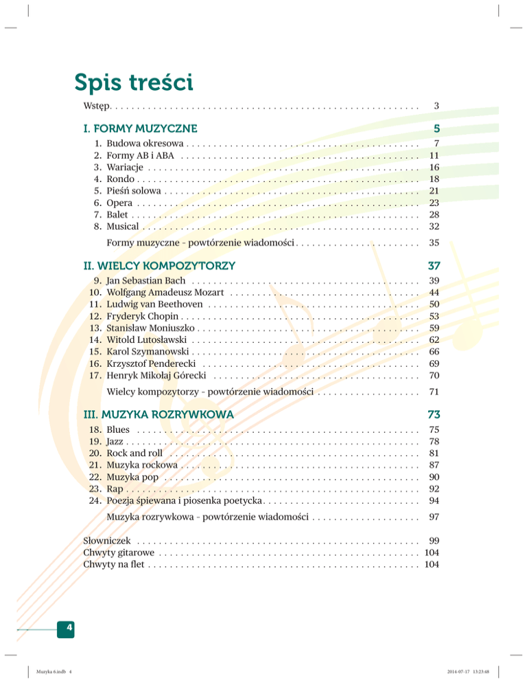 Spis treści Wstęp . . . . . . . . . . . . . . . . . . . . . . . . . . . . . . . . . . . . . . . . . . . . . . . . . . . . . . . . . I. FORMY MUZYCZNE 1. 2. 3. 4. 5. 6. 7. 8. Budowa okresowa Formy AB i ABA . Wariacje . . . . . . . Rondo . . . . . . . . . Pieśń solowa . . . . Opera . . . . . . . . . Balet . . . . . . . . . . Musical . . . . . . . . 5 . . . . . . . . . . . . . . . . . . . . . . . . . . . . . . . . . . . . . . . . . . . . . . . . . . . . . . . . . . . . . . . . . . . . . . . . . . . . . . . . . . . . . . . . . . . . . . . . . . . . . . . . . . . . . . . . . . . . . . . . . . . . . . . . . . . . . . . . . . . . . . . . . . . . . . . . . . . . . . . . . . . . . . . . . . . . . . . . . . . . . . . . . . . . . . . . . . . . . . . . . . . . . . . . . . . . . . . . . . . . . . . . . . . . . . . . . . . . . . . . . . . . . . . . . . . . . . . . . . . . . . . . . . . . . . . . . . . . . . . . . . . . . . . . . . . . . . . . . . . . . . . . . . . . . . . . . . . . . . . . . . . . . . . . . . . . . . . . . . . . . . . . Formy muzyczne – powtórzenie wiadomości . . . . . . . . . . . . . . . . . . . . . . . II. WIELCY KOMPOZYTORZY 9. 10. 11. 12. 13. 14. 15. 16. 17. Jan Sebastian Bach . . . . . . . Wolfgang Amadeusz Mozart Ludwig van Beethoven . . . . Fryderyk Chopin . . . . . . . . . Stanisław Moniuszko . . . . . . Witold Lutosławski . . . . . . . Karol Szymanowski . . . . . . . Krzysztof Penderecki . . . . . Henryk Mikołaj Górecki . . . . . . . . . . . . . . . . . . . . . . . . . . . . . . . . . . . . . . . . . . . . . . . . . . . . . . . . . . . . . . . . . . . . . . . . . . . . . . . . . . . . . . . . . . . . . . . . . . . . . . . . . . . . . . . . . . . . . . . . . . . . . . . . . . . . . . . . . . . . . . . . . . . . . . . . . . . . . . . . . . . . . . . . . . . . . . . . . . . . . . . . . . . . . . . . . . . . . . . . . . . . . . . . . . . . . . . . . . . . . . . . . . . . . . . . . . . . . . . . . . . . . . . . . . . . . . . . . . . . . . . . . . . . . . . . . . . . . . . . . . . . . . . . . . . . . . . . . . . . . . . . . . . . . . . . . . . . . . . . . . . . . . . . . . . . . . . . . III. MUZYKA ROZRYWKOWA Blues . . . . . . . . . . . . . . . . . . . . . . . . Jazz . . . . . . . . . . . . . . . . . . . . . . . . . . Rock and roll . . . . . . . . . . . . . . . . . . Muzyka rockowa . . . . . . . . . . . . . . . . Muzyka pop . . . . . . . . . . . . . . . . . . . Rap . . . . . . . . . . . . . . . . . . . . . . . . . . Poezja śpiewana i piosenka poetycka . 35 39 44 50 53 59 62 66 69 70 71 73 . . . . . . . . . . . . . . . . . . . . . . . . . . . . . . . . . . . . . . . . . . . . . . . . . . . . . . . . . . . . . . . . . . . . . . . . . . . . . . . . . . . . . . . . . . . . . . . . . . . . . . . . . . . . . . . . . . . . . . . . . . . . . . . . . . . . . . . . . . . . . . . . . . . . . . . . . . . . . . . . . . . . . . . . . . . . . . . . . . . . . . . . . . . . . . . . . . . . Muzyka rozrywkowa – powtórzenie wiadomości Słowniczek . . . . Chwyty gitarowe Chwyty na flet . . 7 11 16 18 21 23 28 32 37 Wielcy kompozytorzy – powtórzenie wiadomości 18. 19. 20. 21. 22. 23. 24. 3 75 78 81 87 90 92 94 . . . . . . . . . . . . . . . . . . . . 97 . . . . . . . . . . . . . . . . . . . . . . . . . . . . . . . . . . . . . . . . . . . . . . . . 99 104 104 . . . . . . . . . . . . . . . . . . . . . . . . . . . . . . . . . . . . . . . . . . . . . . . . . . . . . . . . . . . . . . . . . . . . . . . . . . . . . . . . . . . . . . . . . . . . . . . . 4 Muzyka 6.indb 4 2014-07-17 13:23:48