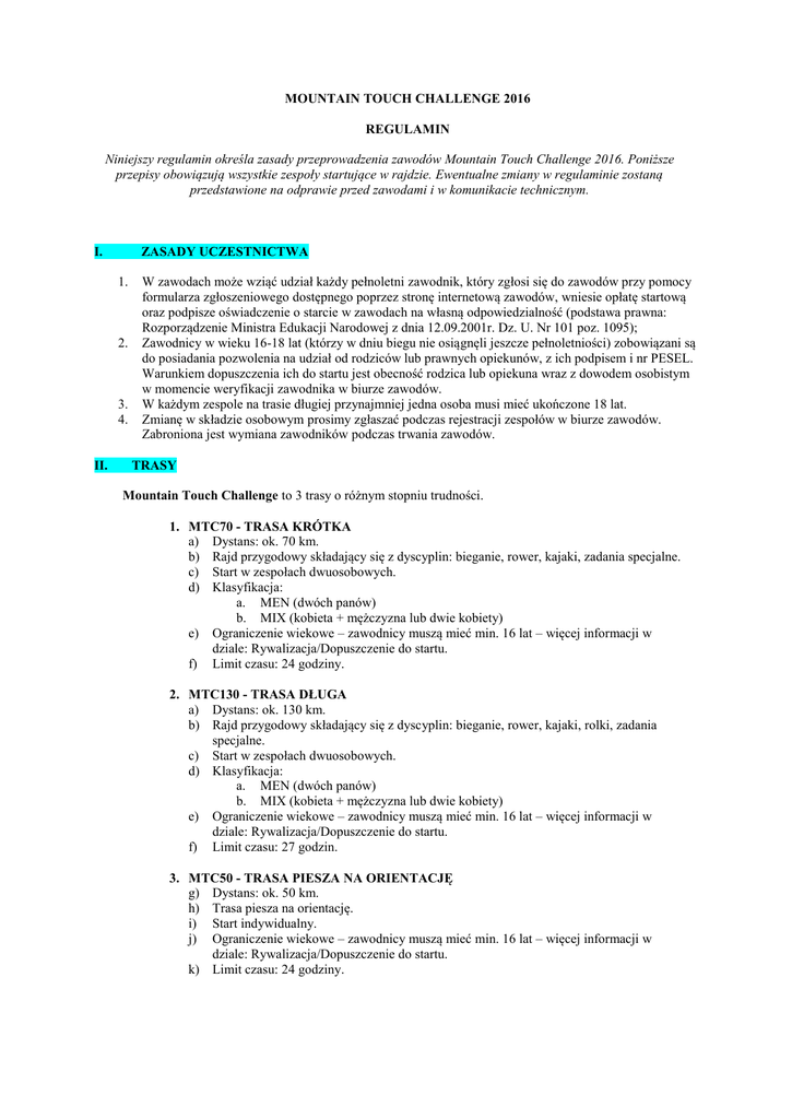 MOUNTAIN TOUCH CHALLENGE 2016 REGULAMIN Niniejszy regulamin określa zasady przeprowadzenia zawodów Mountain Touch Challenge 2016. Poniższe przepisy obowiązują wszystkie zespoły startujące w rajdzie. Ewentualne zmiany w regulaminie zostaną przedstawione na odprawie przed zawodami i w komunikacie technicznym. I. ZASADY UCZESTNICTWA 1. 2. 3. 4. II. W zawodach może wziąć udział każdy pełnoletni zawodnik, który zgłosi się do zawodów przy pomocy formularza zgłoszeniowego dostępnego poprzez stronę internetową zawodów, wniesie opłatę startową oraz podpisze oświadczenie o starcie w zawodach na własną odpowiedzialność (podstawa prawna: Rozporządzenie Ministra Edukacji Narodowej z dnia 12.09.2001r. Dz. U. Nr 101 poz. 1095); Zawodnicy w wieku 16-18 lat (którzy w dniu biegu nie osiągnęli jeszcze pełnoletniości) zobowiązani są do posiadania pozwolenia na udział od rodziców lub prawnych opiekunów, z ich podpisem i nr PESEL. Warunkiem dopuszczenia ich do startu jest obecność rodzica lub opiekuna wraz z dowodem osobistym w momencie weryfikacji zawodnika w biurze zawodów. W każdym zespole na trasie długiej przynajmniej jedna osoba musi mieć ukończone 18 lat. Zmianę w składzie osobowym prosimy zgłaszać podczas rejestracji zespołów w biurze zawodów. Zabroniona jest wymiana zawodników podczas trwania zawodów. TRASY Mountain Touch Challenge to 3 trasy o różnym stopniu trudności. 1. MTC70 - TRASA KRÓTKA a) Dystans: ok. 70 km. b) Rajd przygodowy składający się z dyscyplin: bieganie, rower, kajaki, zadania specjalne. c) Start w zespołach dwuosobowych. d) Klasyfikacja: a. MEN (dwóch panów) b. MIX (kobieta + mężczyzna lub dwie kobiety) e) Ograniczenie wiekowe – zawodnicy muszą mieć min. 16 lat – więcej informacji w dziale: Rywalizacja/Dopuszczenie do startu. f) Limit czasu: 24 godziny. 2. MTC130 - TRASA DŁUGA a) Dystans: ok. 130 km. b) Rajd przygodowy składający się z dyscyplin: bieganie, rower, kajaki, rolki, zadania specjalne. c) Start w zespołach dwuosobowych. d) Klasyfikacja: a. MEN (dwóch panów) b. MIX (kobieta + mężczyzna lub dwie kobiety) e) Ograniczenie wiekowe – zawodnicy muszą mieć min. 16 lat – więcej informacji w dziale: Rywalizacja/Dopuszczenie do startu. f) Limit czasu: 27 godzin. 3. MTC50 - TRASA PIESZA NA ORIENTACJĘ g) Dystans: ok. 50 km. h) Trasa piesza na orientację. i) Start indywidualny. j) Ograniczenie wiekowe – zawodnicy muszą mieć min. 16 lat – więcej informacji w dziale: Rywalizacja/Dopuszczenie do startu. k) Limit czasu: 24 godziny. III. ZASADY RYWALIZACJI 1. Czas płynie od momentu startu do momentu przekroczenia mety – nie zatrzymuje się czasu podczas zadań specjalnych, odpoczynków, etc. Jedyna możliwość zatrzymania czasu występuje w chwili gdy zespół/uczestnik musi czekać, np. na dostarczenie sprzętu, zwolnienie kajaków, etc i wynika to z winy organizatora. 2. Wszystkie zespoły/uczestnicy na poszczególnych trasach startują jednocześnie i zmierzają do mety non stop. Uczestnicy według własnego uznania określają tempo poruszania się oraz czas i miejsca odpoczynku. Trasa rajdu wyznaczona będzie w terenie w postaci punktów kontrolnych. Te same punkty zostaną oznaczone na mapie dostarczonej przez organizatora. 3. Droga pomiędzy punktami jest dowolna, jednak niektóre fragmenty trasy mogą stanowić odcinki specjalne, których pokonanie (według oznaczenia na mapie lub w terenie) jest obowiązkowe. 4. Na wszystkich punktach kontrolnych zespoły muszą pojawić się w komplecie (dotyczy rajdów przygodowych). 5. Na wszystkich punktach kontrolnych oraz na wszystkich etapach zespoły/uczestnicy muszą pojawić się z wyposażeniem obowiązkowym. 6. Zakazane jest poruszanie się po terenach prywatnych z wyjątkiem miejsc wskazanych przez Organizatora. 7. Podczas całego rajdu zabronione jest korzystanie z innych środków lokomocji niż te określone lub udostępnione przez Organizatora. IV. DYSCYPLINY W TRAKCIE RAJDU PRZYGODOWEGO 1. Etapy piesze - etapy te zespoły pokonują pieszo, biegiem, marszobiegiem, marszem według własnego uznania. 2. Etapy rowerowe: a) Etapy te zawodnicy pokonują na własnych rowerach. b) Trasa prowadzi po zróżnicowanej nawierzchni, również po bezdrożach, gdzie jazda na rowerze może okazać się trudna lub wręcz niemożliwa. c) Podczas jazdy obowiązuje noszenie kasku oraz przestrzeganie przepisów ruchu drogowego. d) Podczas jazdy w nocy obowiązuje nakaz jazdy z włączonymi światłami przednimi oraz tylnymi. 3. Etapy kajakowe: a) Etapy te zawodnicy pokonują na kajakach dostarczonych przez Organizatora. b) Zawodnicy otrzymują od Organizatora również kapoki i wiosła. c) Podczas pobytu na wodzie zawodnicy są zobowiązani nosić kapoki. d) Istnieje możliwość korzystania z własnych wioseł i kapoków, które należy dostarczyć Organizatorowi przed zawodami. 4. Etapy rolkowe: a) Etapy te zawodnicy pokonują na własnych rolkach lub pieszo, jeśli zdecydowali się wystartować bez rolek. b) Podczas poruszania się po drogach obowiązuje nakaz jazdy z włączonym tylnym czerwonym światłem mrugającym. c) Podczas jazdy obowiązuje noszenie kasku. V. ZADANIA I ODCINKI SPECJALNE W TRAKCIE RAJDU PRZYGODOWEGO 1. Informacje ogólne. a) Czas pokonywania zadań i odcinków specjalnych jest wliczany do łącznego czasu pokonywania całej trasy. Ewentualny czas oczekiwania na wolne stanowisko nie będzie odliczany. b) Wszystkie zadania i odcinki specjalne zawodnicy wykonują na własną odpowiedzialność. c) Wszystkie zadania i odcinki specjalne zawodnicy wykonują z wyposażeniem obowiązkowym, chyba że Organizator zaznaczy inaczej. 2. Zadania specjalne. a) Zadania specjalne są to dodatkowe konkurencje na trasie, które zespół musi wykonać i wymagają od zawodników dodatkowych umiejętności. b) Podczas wykonywania zadania członkowie zespołu mogą sobie pomagać. c) O kolejności dopuszczenia zespołów do wykonywania zadania