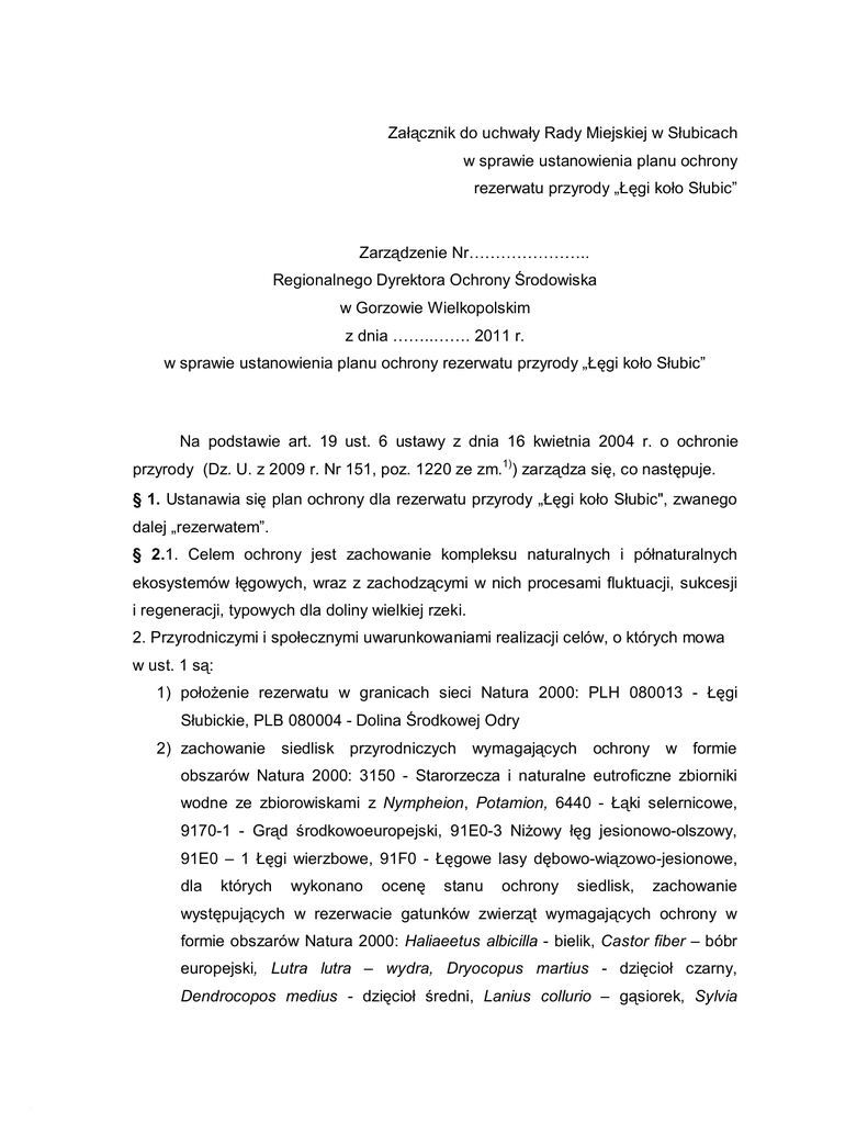 Załącznik do uchwały Rady Miejskiej w Słubicach w sprawie ustanowienia planu ochrony rezerwatu przyrody „Łęgi koło Słubic” Zarządzenie Nr………………….. Regionalnego Dyrektora Ochrony Środowiska w Gorzowie Wielkopolskim z dnia ……..……. 2011 r. w sprawie ustanowienia planu ochrony rezerwatu przyrody „Łęgi koło Słubic” Na podstawie art. 19 ust. 6 ustawy z dnia 16 kwietnia 2004 r. o ochronie przyrody (Dz. U. z 2009 r. Nr 151, poz. 1220 ze zm.1)) zarządza się, co następuje. § 1. Ustanawia się plan ochrony dla rezerwatu przyrody „Łęgi koło Słubic", zwanego dalej „rezerwatem”. § 2.1. Celem ochrony jest zachowanie kompleksu naturalnych i półnaturalnych ekosystemów łęgowych, wraz z zachodzącymi w nich procesami fluktuacji, sukcesji i regeneracji, typowych dla doliny wielkiej rzeki. 2. Przyrodniczymi i społecznymi uwarunkowaniami realizacji celów, o których mowa w ust. 1 są: 1) położenie rezerwatu w granicach sieci Natura 2000: PLH 080013 - Łęgi Słubickie, PLB 080004 - Dolina Środkowej Odry 2) zachowanie siedlisk przyrodniczych wymagających ochrony w formie obszarów Natura 2000: 3150 - Starorzecza i naturalne eutroficzne zbiorniki wodne ze zbiorowiskami z Nympheion, Potamion, 6440 - Łąki selernicowe, 9170-1 - Grąd środkowoeuropejski, 91E0-3 Niżowy łęg jesionowo-olszowy, 91E0 – 1 Łęgi wierzbowe, 91F0 - Łęgowe lasy dębowo-wiązowo-jesionowe, dla których wykonano ocenę stanu ochrony siedlisk, zachowanie występujących w rezerwacie gatunków zwierząt wymagających ochrony w formie obszarów Natura 2000: Haliaeetus albicilla - bielik, Castor fiber – bóbr europejski, Lutra lutra – wydra, Dryocopus martius - dzięcioł czarny, Dendrocopos medius - dzięcioł średni, Lanius collurio – gąsiorek, Sylvia nisoria – jarzębatka, Milvus milvus - kania ruda, Pernis apivorus – trzmielojad, Bombina bombina – kumak nizinny, dla których wykonano ocenę stanu ochrony gatunków. § 3. Identyfikację oraz określenie sposobów eliminacji lub ograniczenia istniejących i potencjalnych zagrożeń wewnętrznych i zewnętrznych zawiera załącznik nr 1 do zarządzenia. § 4. Obszar rezerwatu podlega ochronie czynnej. § 5. Określenie działań ochronnych na obszarze ochrony czynnej z podaniem rodzaju, zakresu i lokalizacji tych działań zawiera załącznik nr 2 do zarządzenia. § 6. Wskazanie obszarów i miejsc udostępniania dla celów naukowych oraz określenie sposobów ich udostępniania, określa załącznik nr 3 do zarządzenia. § 7. Na terenie rezerwatu nie wyznacza się miejsc, w których może być prowadzona działalność wytwórcza i handlowa. § 8. Na terenie rezerwatu może być prowadzona działalność rolnicza. § 9. Wprowadza się następujące ustalenia do studiów uwarunkowań i kierunków zagospodarowania przestrzennego gminy Słubice, miejscowych planów zagospodarowania przestrzennego, planów zagospodarowania przestrzennego województwa dotyczące eliminacji lub ograniczenia zagrożeń zewnętrznych: lokalizację przedsięwzięć mogących wpływać na stosunki wodne w rezerwacie przyrody należy rozpatrywać uwzględniając uwarunkowania przyrodnicze rezerwatu i cele jego ochrony. § 10. Zarządzenie wchodzi w życie po upływie 14 dni od jego ogłoszenia w Dzienniku Urzędowym Województwa Lubuskiego. ___________________________________________________________________ ______________ 1) Zmiany niniejszej ustawy ogłoszone zostały w Dz.U. z 2009 r. Nr 157, poz. 1241, Nr 215, poz. 1664, Dz.U. z 2010 r. Nr 76, poz. 489, Nr 119, poz. 804, Dz.U. z 2011 r. Nr 34, poz. 170 i Nr 94, poz. 549, Nr 208, poz. 1241 i Nr 224, poz. 1337. Załącznik nr 1 do Zarządzenia Nr………… Regionalnego Dyrektora Ochrony Środowiska w Gorzowie Wlkp. z dnia …………… 2011 r. Identyfikacja oraz określenie sposobów eliminacji lub ograniczenia istniejących i potencjalnych zagrożeń wewnętrznych i zewnętrznych. Lp. 1 2 3 1 2 3 4 Identyfikacja i ocena zagrożenia Sposób eliminacji lub minimalizacji zagrożeń Zagrożenia zewnętrzne Ekspansja gatunków obcego pochodzenia: robinia, dąb Hamowanie sukcesji poprzez stopniowe usuwanie. czerwony, klon jesionolistny. Zmiana reżimu hydrologicznego Odry poprzez Obszar rezerwatu ująć, jako tereny zalewowe i nie przedsięwzięcia hydrologiczne chronić ich przed powodziami. Każda zmiana w zmierzające do znacznego infrastrukturze przeciwpowodziowej, plany regulacji spłaszczenia fal Odry, konsultowane muszą być z Regionalnym powodziowych, regulacje Odry, Dyrektorem Ochrony Środowiska w Gorzowie Wlkp. poszerzanie szerokości koryta spływu kry Zarastanie łąk nalotami drzew i Raz na trzy lata wycinać pojawiający się nalot, krzewów dopuścić ekstensywny wypas. Zagrożenia wewnętrzne Grądowienie lasów łęgowych za wałem Bez zabiegów przeciwpowodziowym Procesy sukcesji wtórnej na łąkach i pastwiskach Kontynuować tradycyjne sposoby użytkowania (zarastanie) Ekspansja klonu jesionolistnego, ronbinii Usuwać akacjowej i obcych innych gatunków dendroflory Pojawienie się obcego gatunku drapieżnego ssaka w okolicach Prowadzenie odstrzału tego gatunku rezerwatu jakim jest szop pracz (Procyon lotor) Rezerwat „Łęgi koło Słubic” położony jest na obszarze Natura 2000 PLH 080013 „Łęgi Słubickie oraz PLB 080004 „Dolina Środkowej Odry”. Lp 1. Identyfikacja istniejących i potencjalnych zagrożeń siedlisk, gatunków roślin i zwierząt Grądowienie lasów łęgowych wałem przeciwpowodziowym Procesy sukcesji wtórnej na łąkach i Cele działań ochronnych za Zachowanie sukcesji. Hamowanie sukcesji roślin Działania ochronne, obszar wdrożenia, podmiot odpowiedzialny za wykonanie Bez zabiegów. Kontynuować tradycyjne sposoby użytkowania. 2. pastwiskach (zarastanie) drzewiastych i krzewów.. Ekstensywna gospodarka na użytkach zielonych. Usuwanie drzew i krzewów. Załącznik nr 2 do Zarządzenia Nr…………….. Regionalnego Dyr