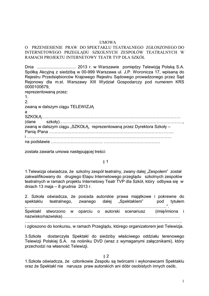 UMOWA O PRZENIESIENIE PRAW DO SPEKTAKLU TEATRALNEGO ZGŁOSZONEGO DO INTERNETOWEGO PRZEGLĄDU SZKOLNYCH ZESPOŁÓW TEATRALNYCH W RAMACH PROJEKTU INTERNETOWY TEATR TVP DLA SZKÓŁ Dnia ................................. 2013 r. w Warszawie pomiędzy Telewizją Polską S.A. Spółką Akcyjną z siedzibą w 00-999 Warszawa ul. J.P. Woronicza 17, wpisaną do Rejestru Przedsiębiorców Krajowego Rejestru Sądowego prowadzonego przez Sąd Rejonowy dla m.st. Warszawy XIII Wydział Gospodarczy pod numerem KRS 0000100679, reprezentowaną przez: 1. 2. zwaną w dalszym ciągu TELEWIZJĄ a SZKOŁĄ……………………………………………………………………………………… (dane szkoły)……………………………………………………………………………., zwaną w dalszym ciągu „SZKOŁĄ, reprezentowaną przez Dyrektora Szkoły – Panią /Pana …………………………………………………………………………….. i …………………………………………………………………………………………. na podstawie ………………………………. …………………………………. została zawarta umowa następującej treści: §1 1.Telewizja oświadcza, że szkolny zespół teatralny, zwany dalej „Zespołem” został zakwalifikowany do drugiego Etapu Internetowego przeglądu szkolnych zespołów teatralnych w ramach projektu Internetowy Teatr TVP dla Szkół, który odbywa się w dniach 13 maja – 8 grudnia 2013 r. 2. Szkoła oświadcza, że posiada autorskie prawa majątkowe i pokrewne do spektaklu teatralnego, zwanego dalej „Spektaklem” pod tytułem „……………………………………………………………………………………….”. Spektakl stworzono w oparciu o autorski scenariusz (imię/imiona i nazwisko/nazwiska)………………………………………………………………………… …………………………………………………………………………………………………. i zgłoszono do konkursu, w ramach Przeglądu, którego organizatorem jest Telewizja. 3.Szkoła dostarczyła Spektakl do siedziby właściwego oddziału terenowego Telewizji Polskiej S.A. na nośniku DVD (wraz z wymaganymi załącznikami), który przechodzi na własność Telewizji. §2 1.Szkoła oświadcza, że członkowie Zespołu są twórcami i wykonawcami Spektaklu oraz że Spektakl nie narusza praw autorskich ani dóbr osobistych innych osób, 1 2, Wykaz imienny twórców i wykonawców Spektaklu oraz opiekuna artystycznego Spektaklu stanowi załącznik nr 1 do umowy. §3 1. Szkoła przenosi na Telewizję a Telewizja nabywa w pełnym zakresie wszelkie autorskie prawa majątkowe i pokrewne do zarejestrowanego Spektaklu oraz wyraża zgodę na wykonywanie przez Telewizję autorskich praw zależnych - do korzystania i rozporządzania Spektaklem bez ograniczeń terytorialnych i czasowych, w całości i we fragmentach. 2.Przeniesienie praw i udzielenie zezwoleń , o których mowa w ust.1 obejmuje : następujące pola eksploatacji: 1/ w zakresie utrwalania i zwielokrotniania - wytwarzanie egzemplarzy jakąkolwiek techniką analogową lub cyfrową; w dowolnym systemie lub formacie; na nośnikach video, światłoczułych, magnetycznych, optycznych, dyskach, kościach pamięci, nośnikach komputerowych lub innych nośnikach zapisów i pamięci; 2/ w zakresie rozpowszechniania : a/ wszelkie nadawanie i reemitowanie, w tym za pomocą wizji lub fonii przewodowej lub bezprzewodowej, przez stacje naziemne, za pośrednictwem satelity, w sieciach kablowych, telekomunikacyjnych lub multimedialnych lub innych systemach przekazów ( w tym simulcasting , webcasting); w sposób niekodowany lub kodowany, w obiegu otwartym lub zamkniętym; w jakiejkolwiek technice ( w tym analogowej lub cyfrowej), systemie lub formacie, z lub bez możliwości zapisu, w tym w serwisach tekstowych, multimedialnych, internetowych; b/ wszelkie publiczne udostępnianie (w tym w ramach utworów audiowizualnych) w taki sposób, aby każdy mógł mieć do niego dostęp w miejscu i czasie przez siebie wybranym, w tym poprzez stacje naziemne, za pośrednictwem satelity, sieci kablowe, telekomunikacyjne lub multimedialne, bazy danych, serwery lub inne urządzenia i systemy, w tym także osób trzecich, w obiegu otwartym lub zamkniętym, w jakiejkolwiek technice, systemie lub formacie, z lub bez możliwości zapisu, w tym też w serwisach wymienionych w lit.a); c/ wszelkie publiczne odtwarzanie, wyświetlanie, wykonanie, d/ wprowadzenie do obrotu. 3.Szkoła przenosi a Telewizja nabywa prawo zezwalania na wykonywanie zależnych praw autorskich do Spektaklu, a w szczególności co do dokonania skrótów, opracowań oraz korzystania z nich na polach wymienionych w ust. 2 z zastrzeżeniem poszanowania autorskich praw osobistych twórców i wykonawców. 4.Telewizja ma prawo do wykorzystywania Spektaklu do szeroko rozumianej działalności reklamowej lub promocyjnej projektu teatrów internetowych dla dzieci, 2 Telewizji, jej jednostek, sponsorów, jej partnerów, wszelkiego propagowania sztuki i kultury teatralnej, w tym realizacji zwiastunów. 5. Szkoła oświadcza, że prawa o których mowa w ust 1 – 4 nabyła prawidłowo od osób rejestrujących Spektakl, autora (autorów) scenariusza, reżysera, artystów wykonawców. W przypadku osób niepełnoletnich prawa przenoszą te osoby, lecz umowa zawarta jest przez rodziców (opiekunów prawnych) działających w imieniu i na rzecz dziecka. Szkoła oświadcza, iż w Spektaklu wykorzystano muzykę autorstwa ……………, w wykonaniu ………………… . 6. Prawa nabyte na podstawie niniejszej umowy Telewizja może przenieść na inne podmioty lub upoważnić je do ich wykonywania. §4 Ewentualne spory związane z wykonaniem niniejszej umowy rozstrzygane będą przez sądy powszechne właściwe dla siedziby Telewizji. §5 Wszystkie zmiany umowy wymagają formy pisemnej 