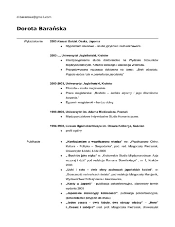 [email protected] Dorota Barańska Wykształcenie 2005 Kansai Gaidai, Osaka, Japonia Stypendium naukowe – studia językowe i kulturoznawcze. 2003-..., Uniwersytet Jagielloński, Kraków Interdyscyplinarne studia doktoranckie na Wydziale Stosunków Międzynarodowych, Katedra Bliskiego i Dalekiego Wschodu. Przygotowywana rozprawa doktorska na temat: „Brak absolutu. Pojęcie dobra i zła w popkulturze japońskiej” 2000-2003, Uniwersytet Jagielloński, Kraków Filozofia – studia magisterskie. Praca magisterska: „Bushido – kodeks etyczny i jego filozoficzne korzenie.” Egzamin magisterski – bardzo dobry. 1998-2000, Uniwersytet im. Adama Mickiewicza, Poznań Międzywydziałowe Indywidualne Studia Humanistyczne. 1994-1998, Liceum Ogólnokształcące im. Oskara Kolberga, Kościan Publikacje profil ogólny „Konfucjanizm a współczesna władza” we: „Współczesne Chiny. Kultura - Polityka – Gospodarka”, pod. red. Małgorzaty Pietrasiak, Uniwersytet Łódzki, Łódź 2006 „ Bushido jako etyka” w: „Krakowskie Studia Międzynarodowe. Azja wczoraj i dziś” pod redakcja Romana Sławińskiego” , nr 1, Kraków 2006 „Uchi i soto – dwie sfery zachowań japońskich kobiet”, w: „Grzeczność na krańcach świata”, pod redakcja Małgorzaty Marcjanik, Wydawnictwa Profesjonalne i Akademickie, „Kasty w Japonii” - publikacja pokonferencyjna, planowany termin wydania 2009 „Japońskie stereotypy kobiecości”, publikacja pokonferencyjna, (potwierdzenie przyjęcia do druku) „Jeden cesarz – dwie fabuły, dwa obrazy władcy” – „Hero” i „Cesarz i zabójca” (red. prof. Małgorzata Pietrasiak, Uniwersytet Łódzki), artykuł wysłany do korekty i druku.) „Aragami i 2LDK- „Projekt pojedynek” - dwa filmy, dwie różne idee pojedynku, dwie historie, realność i fantastyka. - artykuł przygotowany do publikacji.) Doświadczenie dydaktyczne 2004-2005, Uniwersytet Jagielloński, Kraków Sztuka Chin i Japonii – ćwiczenia Historia krajów buddyjskich – ćwiczenia Popkultura japońska – własne konwersatorium 2006, Uniwersytet Jagielloński, Kraków Doświadczenie Popkultura japońska – własne konwersatorium Członek założyciel i prezes zarządu stowarzyszenia CTA – Closer To i działalność pozauczelniana Asia (www.closertoasia.org); prowadzenie strony internetowej CTA Administrator forum internetowego Katedry Bliskiego i Dalekiego Wschodu (2003-...) – www.orientuj.fora.pl. (nick: bayushi). Współorganizowane wydarzenia: • Nowy Rok Chiński w Kopalni Soli „Wieliczka” (lata 2005-2008) ze szkołą „Lung” (http://lung.pl/) • Festiwal Kultury Tajskiej we współpracy z miastem Niepołomice i Ambasadą Królestwa Tajlandii oraz Szkołą „Target” (www.target.freehost.pl) - czerwiec 2007 • Wieczór poetycki „Transpoetica: Japonia, Korea, Wietnam” ze Śródmiejskim Ośrodkiem Kultury • Wieczór Kultury Japońskiej ze Szkołą Języków Obcych Glossa (http://www.glossa.pl/)– wrzesień 2007 • Festiwal Kultury Orientu, Wieliczka 2008 • „Na rozdrożach kultury” - warsztaty dla Małopolskiego Centrum Wolontariatu • Japan week ze szkołą „Sunstar”, wykłady: ✗ Japońskie duchy i demony w mandze anime ✗ Uniform a rola społeczna – specyfika ubioru w Japonii. Współpraca z portalem www.gildia.pl – działy poświęcone grom fabularnym: „Neuroshima”, „Monastyr”, recenzje (lata 2004-2005) Prowadzenie bloga poświęconego japońskiej kulturze tradycyjnej i kulturze popularnej Kursy dodatkowe 2007, Kurs „Budowanie potencjału organizacji pozarządowych” – między innymi moduły dotyczące Public Relations i Fundraisingu 2006, Egzamin z języka japońskiego, Nihongo Noryoku Shiken, poziom 4kyu 2003, Teatr Ludowy, Kraków – szkolenie twórczego myślenia i rozwiązywania problemów w trakcie studiów magisterskich – kurs pedagogiczno – psychologiczny i zdobycie uprawnień nauczycielskich Umiejętności dodatkowe Znajomość języków obcych: angielski (zaawansowany - studia w Japonii w języku angielskim), japoński (średnio zaawansowany), chiński, niemiecki (podstawy) Zainteresowania Biegła obsługa komputera (MS Office, OpenOffice, itp) Prawo jazdy – kat. B Naukowe: klasyczne tańce i stroje japońskie, literatura okresu Heian, filmografia japońska i chińska, moda azjatycka; nauka języków Ogólne: książki, zwłaszcza fantastyka, muzyka, internet, turystyka górska, RPG, gry planszowe