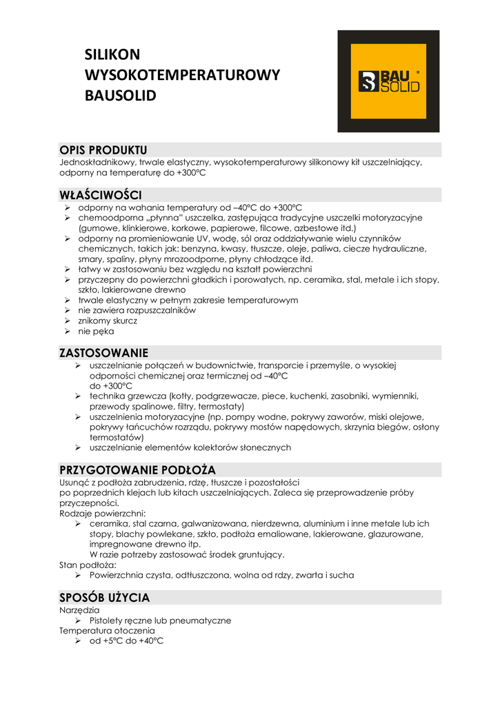 SILIKON WYSOKOTEMPERATUROWY BAUSOLID OPIS PRODUKTU Jednoskładnikowy, trwale elastyczny, wysokotemperaturowy silikonowy kit uszczelniający, odporny na temperaturę do +300°C WŁAŚCIWOŚCI odporny na wahania temperatury od –40°C do +300°C chemoodporna „płynna” uszczelka, zastępująca tradycyjne uszczelki motoryzacyjne (gumowe, klinkierowe, korkowe, papierowe, filcowe, azbestowe itd.) odporny na promieniowanie UV, wodę, sól oraz oddziaływanie wielu czynników chemicznych, takich jak: benzyna, kwasy, tłuszcze, oleje, paliwa, ciecze hydrauliczne, smary, spaliny, płyny mrozoodporne, płyny chłodzące itd. łatwy w zastosowaniu bez względu na kształt powierzchni przyczepny do powierzchni gładkich i porowatych, np. ceramika, stal, metale i ich stopy, szkło, lakierowane drewno trwale elastyczny w pełnym zakresie temperaturowym nie zawiera rozpuszczalników znikomy skurcz nie pęka ZASTOSOWANIE uszczelnianie połączeń w budownictwie, transporcie i przemyśle, o wysokiej odporności chemicznej oraz termicznej od –40°C do +300°C technika grzewcza (kotły, podgrzewacze, piece, kuchenki, zasobniki, wymienniki, przewody spalinowe, filtry, termostaty) uszczelnienia motoryzacyjne (np. pompy wodne, pokrywy zaworów, miski olejowe, pokrywy łańcuchów rozrządu, pokrywy mostów napędowych, skrzynia biegów, osłony termostatów) uszczelnianie elementów kolektorów słonecznych PRZYGOTOWANIE PODŁOŻA Usunąć z podłoża zabrudzenia, rdzę, tłuszcze i pozostałości po poprzednich klejach lub kitach uszczelniających. Zaleca się przeprowadzenie próby przyczepności. Rodzaje powierzchni: ceramika, stal czarna, galwanizowana, nierdzewna, aluminium i inne metale lub ich stopy, blachy powlekane, szkło, podłoża emaliowane, lakierowane, glazurowane, impregnowane drewno itp. W razie potrzeby zastosować środek gruntujący. Stan podłoża: Powierzchnia czysta, odtłuszczona, wolna od rdzy, zwarta i sucha SPOSÓB UŻYCIA Narzędzia Pistolety ręczne lub pneumatyczne Temperatura otoczenia od +5°C do +40°C SILIKON WYSOKOTEMPERATUROWY BAUSOLID Zalecenia Zdjąć nakrętkę, naciąć końcówkę tuby, ponownie nałożyć nakrętkę i naciąć ją pod kątem na szerokości odpowiadającej wielkości spoiny. Fugę wygładzić szpachelką maczaną w wodzie z niewielką domieszką mydła (polecamy płyn do wygładzania fug na mokro) w ciągu 10 minut od nałożenia kitu i złączenia uszczelnianych elementów. Zapewnić dobrą wentylację. Fuga powinna mieć zawsze kształt ułatwiający swobodne ściekanie wody. Czyszczenie Do czyszczenia rąk, narzędzi czy powierzchni zaleca się użyć specjalne ściereczki czyszczące, ewentualnie do mycia narzędzi po zakończeniu pracy można stosować terpentynę, benzynę ekstrakcyjną lub inny podobny. Utwardzony silikon można usunąć przy pomocy specjalnego środka. Ograniczenia Nie stosować do uszczelnień głowic cylindrów i gaźnika. Nie stosować do połączeń z PE, PP, teflonem, podłożami bitumicznymi lub metalami niezabezpieczonymi antykorozyjnie. Unikać kontaktu z rozpuszczalnikami w trakcie utwardzania kitu. Gasket to kit uszczelniający stosowany zwłaszcza z racji jego chemoodporności i odporności na podwyższoną temperaturę. Gasket nie odznacza się wysoką przyczepnością (w zależności od materiału można jego przyczepność charakteryzować jako niską w wypadku powierzchni gładkich, jak np. aluminium anodyzowane, po średnią, jak np. aluminium nieanodyzowane). Gasket stosowany jest zasadniczo jako uszczelka i w tej funkcji zawsze występuje ściśnięty pomiędzy dwoma elementami korpusu, pełniąc właśnie rolę uszczelki. Dlatego w jego wypadku nie wymaga się tak dużej przyczepności jak w wypadku standardowych kitów silikonowych octanowych, bo każda uszczelka z czasem się zużywa i w razie jej wymiany na nową, jeśli Gasket prezentowałby wysoką przyczepność, jej całkowite usunięcie bez uszkodzenia podłoża macierzystego, bez użycia narzędzi mechanicznych byłoby niemożliwe lub mocno utrudnione. DANE TECHNICZNE Kolorystyka Baza Konsystencja Charakter Ciężar właściwy Lepkość Ściekanie Kożuszenie/ czas obróbki Czas utwardzenia Moduł 100% Wydłużenie przy zerwaniu Twardość Shore A (3s) Czerwony silikon octanowy (na bazie polidimetylosiloksanów) gęsta trwale elastyczny 1,03 g/ml ≈ 200.000 cPo (przy 20°C) wg ISO 7390: < 2 mm ≈ 10 min (przy 23°C i 50% wilgotności względnej) ≈ 3 mm dziennie (przy 23°C i 50% wilgotności względnej) wg normy ISO 8339: 0,5 MPa wg normy ISO 8339: 150% wg normy ISO 868: 25° SILIKON WYSOKOTEMPERATUROWY BAUSOLID Wytrzymałość przy zerwaniu Odporność termiczna po utwardzeniu Możliwość malowania wg normy ISO 8339: 0,6 MPa od –40°C do +270°C (krótkookresowo do +300°C) nie 18 miesięcy. Zamknięte opakowanie przechowywać w temperaturze od +5°C do +25°C. Odporny w transporcie do –15°C Okres trwałości Twardość Shore A utwardzonej próbki (czas utwardzania 14 dni przy temp. +23°C i wilgotności względnej 50%, grubość filmu 2 mm) po ekspozycji na temperaturę +250° i +270°C przez okres 500 i 1000 godzin. 500 godzin w temp. +250°C ≈ 22° (DIN 53505) 500 godzin w temp. +270°C ≈ 15° (DIN 53505) 1000 godzin w temp. +250°C ≈ 30° (DIN 53505) 1000 godzin w temp. +270°C ≈ 27° (DIN 53505) ROZMIARY SPOIN Minimalna szerokość: 4 mm Maksymalna szerokość: 25 mm Zalecane proporcje: Szerokość spoiny w mm: 4-8 10-12 14-16 18-20 22-24 Głębokość spoiny w mm: 6 8 10 12 14 W celu uzyskania żądanej głębokości spoiny i nie dopuszczenia do trzy punktowego styku stosować profile dylatacyjne INFORMACJE LOGISTYCZNE Pojemność opakowania jednostkowego Ilość sztuk w opakowaniu zbiorczym Ilość opakowań na palecie 290ml 12 1248 Waga pełnej palety BHP I OSTRZEŻENIA S2 Chronić przed dziećmi. DOPUSZCZENIA, ATESTY, NORMY Karta Charakterystyki Odpowiedzialność: Podane informacje są wynikiem badań i doświadcze