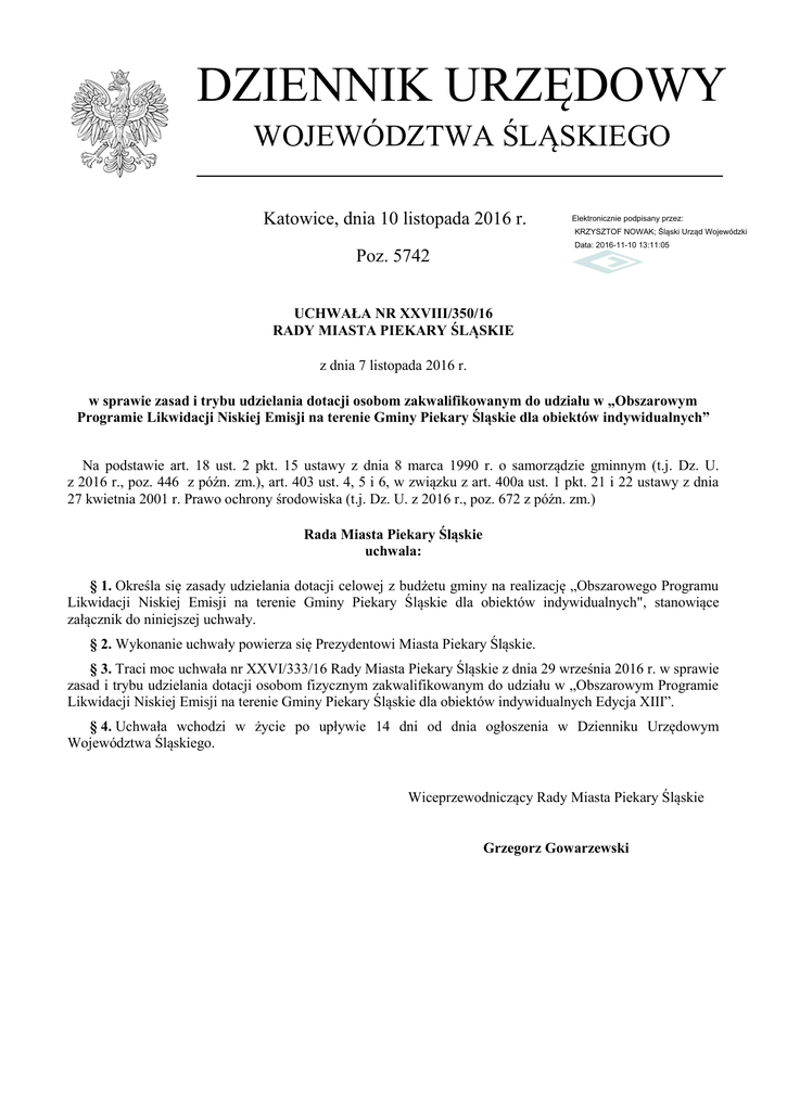 DZIENNIK URZĘDOWY WOJEWÓDZTWA ŚLĄSKIEGO Katowice, dnia 10 listopada 2016 r. Elektronicznie podpisany przez: KRZYSZTOF NOWAK; Śląski Urząd Wojewódzki Data: 2016-11-10 13:11:05 Poz. 5742 UCHWAŁA NR XXVIII/350/16 RADY MIASTA PIEKARY ŚLĄSKIE z dnia 7 listopada 2016 r. w sprawie zasad i trybu udzielania dotacji osobom zakwalifikowanym do udziału w „Obszarowym Programie Likwidacji Niskiej Emisji na terenie Gminy Piekary Śląskie dla obiektów indywidualnych” Na podstawie art. 18 ust. 2 pkt. 15 ustawy z dnia 8 marca 1990 r. o samorządzie gminnym (t.j. Dz. U. z 2016 r., poz. 446 z późn. zm.), art. 403 ust. 4, 5 i 6, w związku z art. 400a ust. 1 pkt. 21 i 22 ustawy z dnia 27 kwietnia 2001 r. Prawo ochrony środowiska (t.j. Dz. U. z 2016 r., poz. 672 z późn. zm.) Rada Miasta Piekary Śląskie uchwala: § 1. Określa się zasady udzielania dotacji celowej z budżetu gminy na realizację „Obszarowego Programu Likwidacji Niskiej Emisji na terenie Gminy Piekary Śląskie dla obiektów indywidualnych", stanowiące załącznik do niniejszej uchwały. § 2. Wykonanie uchwały powierza się Prezydentowi Miasta Piekary Śląskie. § 3. Traci moc uchwała nr XXVI/333/16 Rady Miasta Piekary Śląskie z dnia 29 września 2016 r. w sprawie zasad i trybu udzielania dotacji osobom fizycznym zakwalifikowanym do udziału w „Obszarowym Programie Likwidacji Niskiej Emisji na terenie Gminy Piekary Śląskie dla obiektów indywidualnych Edycja XIII”. § 4. Uchwała wchodzi w życie po upływie 14 dni od dnia ogłoszenia w Dzienniku Urzędowym Województwa Śląskiego. Wiceprzewodniczący Rady Miasta Piekary Śląskie Grzegorz Gowarzewski Dziennik Urzędowy Województwa Śląskiego –2– Poz. 5742 Załącznik do Uchwały Nr XXVIII/350/16 Rady Miasta Piekary Śląskie z dnia 7 listopada 2016 r. Zasady udzielania dotacji celowej z budżetu gminy na realizację „Obszarowego Programu Likwidacji Niskiej Emisji na terenie Gminy Piekary Śląskie dla obiektów indywidualnych” § 1. [Definicje] Ilekroć w niniejszym dokumencie jest mowa o: 1) WFOŚ i GW - rozumie się przez to Wojewódzki Fundusz Ochrony Środowiska i Gospodarki Wodnej w Katowicach, 2) Programie - rozumie się przez to "Obszarowy Program Likwidacji Niskiej emisji na terenie Gminy Piekary Śląskie dla obiektów indywidualnych”, 3) Operatorze Programu - rozumie się przez to podmiot wybrany przez Gminę Piekary Śląskie posiadający upoważnienie Prezydenta Miasta Piekary Śląskie do realizacji Programu, 4) budynku - oznacza to budynek mieszkalny jednorodzinny w rozumieniu art. 3 pkt. 2a ustawy z dnia 7 lipca 1994 r. - Prawo budowlane (t.j. Dz. U. z 2016 r. poz. 290 z późn. zm.), który został oddany do użytkowania zgodnie z art. 54 i kolejnymi tejże ustawy, 5) Inwestorze, Wnioskodawcy - rozumie się przez to osobę posiadająca tytuł prawny do korzystania z nieruchomości zlokalizowanej na terenie Gminy Piekary Śląskie, która złożyła wniosek oraz pozytywnie przeszła etap weryfikacji (wykonanie audytu energetycznego przez Operatora Programu), 6) Wykonawcy - rozumie się przez to podmiot dokonujący: wymiany źródła ciepła, ocieplenia budynków i montażu kolektorów słonecznych zgodnie z zasadami Programu, 7) starym źródle ciepła - rozumie się przez to niskowydajny i nieekologiczny kocioł węglowy (np. kocioł na nieekologiczne paliwa stałe, piec kaflowy), 8) weryfikacji- rozumie się przez to dokonanie oceny zgodności ze stanem faktycznym zadeklarowanym w złożonej ankiecie informacyjnej, przeprowadzonej w budynku Inwestora, 9) nowym źródle ciepła – rozumie się przez to ekologiczne i wysokosprawne urządzenie grzewcze automatyczny kocioł węglowy nowej generacji (retortowy klasy 5 wg normy PN-EN 303-5:2012), kocioł gazowy, pompa ciepła, 10) umowie - rozumie się przez to umowę zawartą pomiędzy Inwestorem, Wykonawcą i Operatorem Programu, określająca warunki współpracy stron związanych z realizacją Programu, 11) kosztorysie- rozumie się przez to kosztorys wykonawczy przygotowany przez Wykonawcę, 12) kosztach kwalifikowanych - rozumie się przez to zakres prac, na podstawie wartości których ustalana jest dotacja do zadań realizowanych w ramach Programu; podstawą opracowania zakresu kosztów kwalifikowanych jest kosztorys wykonawczy, 13) pracach termomodernizacyjnych- rozumie się przez to wymianę starego źródła ciepła na nowe ekologiczne węglowe retortowe lub gazowe, montaż pompy ciepła, ocieplenie budynku, 14) termoizolacji - rozumie się przez to ocieplenie budynku. § 2. [Kryteria wyboru zadania do dofinansowania] Dziennik Urzędowy Województwa Śląskiego –3– Poz. 5742 1. Gmina Piekary Śląskie udziela dofinansowania podmiotom, o których mowa w art. 403 ust. 4 ustawy Prawo ochrony środowiska (t.j. Dz. U. z 2016 r., poz. 672 z późn. zm.), będącymi właścicielami, współwłaścicielami nieruchomości mieszkalnych jednorodzinnych położonych na terenie Gminy Piekary Śląskie, którzy przeprowadzą termomodernizację swoich budynków mieszkalnych polegającą na likwidacji niskowydajnych, nieekologicznych źródeł ciepła i zabudowie ogrzewania ekologicznego, ociepleniu budynku mieszkalnego jednorodzinnego zamontowaniu układu solarnego. W przypadku, gdy własność budynku przysługuje kilku osobom termomodernizacja tego budynku może być wykonana tylko za zgodą wszystkich współwłaścicieli. 2. Cel udzielania dotacji jest zgodny z priorytetami Programu ochrony powietrza dla terenu województwa śląskiego mającego na celu osiągnięcie poziomów dopuszczalnych substancji w powietrzu oraz pułapu stężenia ekspozycji, przyjętego uchwałą Sejmiku Województwa Śląskiego nr IV/57/3/2014 z dnia 17.11.2014 r. oraz „Obszarowego Programu Likwidacji Niskiej Emisji na terenie Gminy Piekary Śląskie dla Obiektów Indywidualnych" na lata 2016-2017, przyjętego Uchwałą nr IV/27/15 Rady Miasta Piekary Śląskie z dnia 29 stycznia 2015 r. 3. Dotacj