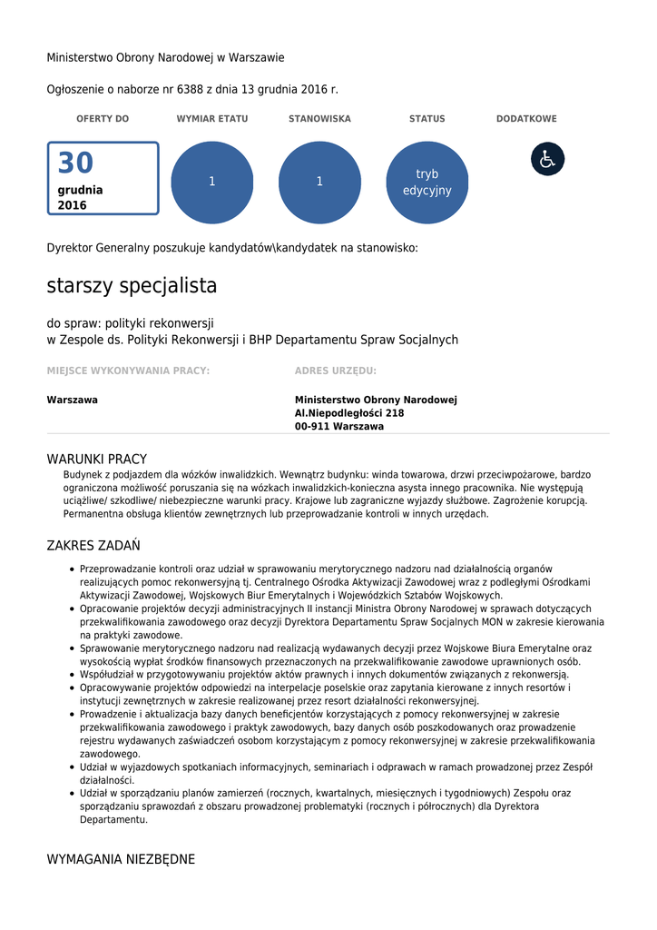 Ministerstwo Obrony Narodowej w Warszawie Ogłoszenie o naborze nr 6388 z dnia 13 grudnia 2016 r. OFERTY DO WYMIAR ETATU STANOWISKA STATUS 1 1 tryb edycyjny 30 grudnia 2016 DODATKOWE Dyrektor Generalny poszukuje kandydatów\kandydatek na stanowisko: starszy specjalista do spraw: polityki rekonwersji w Zespole ds. Polityki Rekonwersji i BHP Departamentu Spraw Socjalnych MIEJSCE WYKONYWANIA PRACY: ADRES URZĘDU: Warszawa Ministerstwo Obrony Narodowej Al.Niepodległości 218 00-911 Warszawa WARUNKI PRACY Budynek z podjazdem dla wózków inwalidzkich. Wewnątrz budynku: winda towarowa, drzwi przeciwpożarowe, bardzo ograniczona możliwość poruszania się na wózkach inwalidzkich-konieczna asysta innego pracownika. Nie występują uciążliwe/ szkodliwe/ niebezpieczne warunki pracy. Krajowe lub zagraniczne wyjazdy służbowe. Zagrożenie korupcją. Permanentna obsługa klientów zewnętrznych lub przeprowadzanie kontroli w innych urzędach. ZAKRES ZADAŃ Przeprowadzanie kontroli oraz udział w sprawowaniu merytorycznego nadzoru nad działalnością organów realizujących pomoc rekonwersyjną tj. Centralnego Ośrodka Aktywizacji Zawodowej wraz z podległymi Ośrodkami Aktywizacji Zawodowej, Wojskowych Biur Emerytalnych i Wojewódzkich Sztabów Wojskowych. Opracowanie projektów decyzji administracyjnych II instancji Ministra Obrony Narodowej w sprawach dotyczących przekwalifikowania zawodowego oraz decyzji Dyrektora Departamentu Spraw Socjalnych MON w zakresie kierowania na praktyki zawodowe. Sprawowanie merytorycznego nadzoru nad realizacją wydawanych decyzji przez Wojskowe Biura Emerytalne oraz wysokością wypłat środków finansowych przeznaczonych na przekwalifikowanie zawodowe uprawnionych osób. Współudział w przygotowywaniu projektów aktów prawnych i innych dokumentów związanych z rekonwersją. Opracowywanie projektów odpowiedzi na interpelacje poselskie oraz zapytania kierowane z innych resortów i instytucji zewnętrznych w zakresie realizowanej przez resort działalności rekonwersyjnej. Prowadzenie i aktualizacja bazy danych beneficjentów korzystających z pomocy rekonwersyjnej w zakresie przekwalifikowania zawodowego i praktyk zawodowych, bazy danych osób poszkodowanych oraz prowadzenie rejestru wydawanych zaświadczeń osobom korzystającym z pomocy rekonwersyjnej w zakresie przekwalifikowania zawodowego. Udział w wyjazdowych spotkaniach informacyjnych, seminariach i odprawach w ramach prowadzonej przez Zespół działalności. Udział w sporządzaniu planów zamierzeń (rocznych, kwartalnych, miesięcznych i tygodniowych) Zespołu oraz sporządzaniu sprawozdań z obszaru prowadzonej problematyki (rocznych i półrocznych) dla Dyrektora Departamentu. WYMAGANIA NIEZBĘDNE Wykształcenie: wyższe Powyżej 1 roku doświadczenia w obszarze rekonwersji lub w obszarze legislacji lub w obszarze kontroli Poświadczenie bezpieczeństwa o klauzuli „poufne” lub zgoda na przeprowadzenie postępowania sprawdzającego w celu uzyskania poświadczenia bezpieczeństwa do klauzuli „poufne” Znajomość: ustawy o promocji zatrudnienia i instytucjach rynku pracy, ustawy o służbie wojskowej żołnierzy zawodowych, ustawy o powszechnym obowiązku obrony Rzeczypospolitej Polskiej, decyzji MON w sprawie organizacji systemu pomocy rodzinom zmarłych żołnierzy i pracowników wojska oraz poszkodowanym żołnierzom i pracownikom wojska, decyzji MON w sprawie organizacji i funkcjonowania systemu pomocy poszkodowanym żołnierzom i pracownikom wojska oraz członkom rodzin zmarłych żołnierzy i pracowników wojska, Kodeksu postępowania administracyjnego, struktury organizacyjnej MON Umiejętności: organizacji pracy własnej, współpracy z innymi, dążenia do rezultatu, poszukiwania rozwiązań, komunikacji, w tym komunikacji pisemnej Posiadanie obywatelstwa polskiego Korzystanie z pełni praw publicznych Nieskazanie prawomocnym wyrokiem za umyślne przestępstwo lub umyśle przestępstwo skarbowe DOKUMENTY I OŚWIADCZENIA NIEZBĘDNE Życiorys/CV i list motywacyjny Kopie dokumentów potwierdzających spełnienie wymagania niezbędnego w zakresie wykształcenia Kopie dokumentów potwierdzających powyżej 1 roku doświadczenia w obszarze rekonwersji lub w obszarze legislacji lub w obszarze kontroli (np. kopie świadectw pracy, zaświadczenie o zatrudnieniu) Kopia poświadczenia bezpieczeństwa uprawniającego do dostępu do informacji niejawnych oznaczonych klauzulą „poufne” lub oświadczenie o wyrażeniu zgody na przeprowadzenie postępowania sprawdzającego zgodnie z ustawą z dnia 5 sierpnia 2010 r. o ochronie informacji niejawnych (Dz. U. Nr 182, poz. 1228 ze zm.) Oświadczenie o posiadaniu obywatelstwa polskiego albo kopia dokumentu potwierdzającego posiadanie polskiego obywatelstwa Oświadczenie o wyrażeniu zgody na przetwarzanie danych osobowych do celów naboru Oświadczenie o korzystaniu z pełni praw publicznych Oświadczenie o nieskazaniu prawomocnym wyrokiem za umyślne przestępstwo lub umyślne przestępstwo skarbowe DOKUMENTY I OŚWIADCZENIA DODATKOWE kopia dokumentu potwierdzającego niepełnosprawność - w przypadku kandydatek/kandydatów, zamierzających skorzystać z pierwszeństwa w zatrudnieniu w przypadku, gdy znajdą się w gronie najlepszych kandydatek/kandydatów TERMINY I MIEJSCE SKŁADANIA DOKUMENTÓW Dokumenty należy złożyć do: 30 grudnia 2016 r. Decyduje data: wpływu oferty do urzędu Miejsce składania dokumentów: Al. Niepodległości 218 00-911 Warszawa Dokumenty można składać osobiście - Punkt podawczy MON, Al. Niepodległości 218 - wejście od ul. Filtrowej (pn-pt, w godz.7.00-18.00.) Na kopercie należy zamieścić nr oferty z BIP KPRM. INNE INFORMACJE: W miesiącu poprzedzającym datę upublicznienia ogłoszenia wskaźnik zatrudnienia osób niepełnosprawnych w urzędzie, w rozumieniu przepisów o rehabilitacji zawodowej i społecznej oraz zatrudnianiu osób niepełnosprawnych, nie wynosi co najmniej 6%. Wynagrodzenie na ww. 