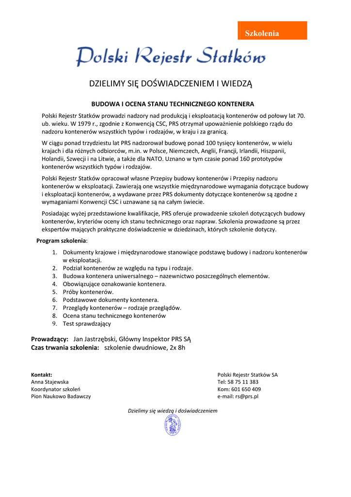 Szkolenia DZIELIMY SIĘ DOŚWIADCZENIEM I WIEDZĄ BUDOWA I OCENA STANU TECHNICZNEGO KONTENERA Polski Rejestr Statków prowadzi nadzory nad produkcją i eksploatacją kontenerów od połowy lat 70. ub. wieku. W 1979 r., zgodnie z Konwencją CSC, PRS otrzymał upoważnienie polskiego rządu do nadzoru kontenerów wszystkich typów i rodzajów, w kraju i za granicą. W ciągu ponad trzydziestu lat PRS nadzorował budowę ponad 100 tysięcy kontenerów, w wielu krajach i dla różnych odbiorców, m.in. w Polsce, Niemczech, Anglii, Francji, Irlandii, Hiszpanii, Holandii, Szwecji i na Litwie, a także dla NATO. Uznano w tym czasie ponad 160 prototypów kontenerów wszystkich typów i rodzajów. Polski Rejestr Statków opracował własne Przepisy budowy kontenerów i Przepisy nadzoru kontenerów w eksploatacji. Zawierają one wszystkie międzynarodowe wymagania dotyczące budowy i eksploatacji kontenerów, a wydawane przez PRS dokumenty dotyczące kontenerów są zgodne z wymaganiami Konwencji CSC i uznawane są na całym świecie. Posiadając wyżej przedstawione kwalifikacje, PRS oferuje prowadzenie szkoleń dotyczących budowy kontenerów, kryteriów oceny ich stanu technicznego oraz napraw. Szkolenia prowadzone są przez ekspertów mających praktyczne doświadczenie w dziedzinach, których szkolenie dotyczy. Program szkolenia: 1. Dokumenty krajowe i międzynarodowe stanowiące podstawę budowy i nadzoru kontenerów w eksploatacji. 2. Podział kontenerów ze względu na typu i rodzaje. 3. Budowa kontenera uniwersalnego – nazewnictwo poszczególnych elementów. 4. Obowiązujące oznakowanie kontenera. 5. Próby kontenerów. 6. Podstawowe dokumenty kontenera. 7. Przeglądy kontenerów – rodzaje przeglądów. 8. Ocena stanu technicznego kontenerów 9. Test sprawdzający Prowadzący: Jan Jastrzębski, Główny Inspektor PRS SĄ Czas trwania szkolenia: szkolenie dwudniowe, 2x 8h Polski Rejestr Statków SA Tel: 58 75 11 383 Kom: 601 650 409 e-mail: [email protected] Kontakt: Anna Stajewska Koordynator szkoleń Pion Naukowo Badawczy Dzielimy się wiedzą i doświadczeniem