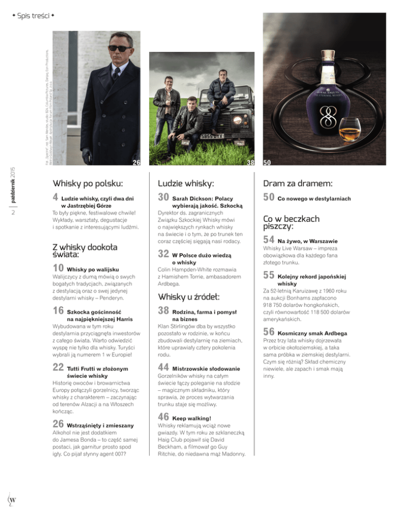 październik 2015 Fot. „Spectre”, reż. Sam Mendes, studio: B24, Columbia Pictures, Danjaq, Eon Productions, Metro-Goldwyn-Mayer, dystrybucja Forum Film Poland Sp. z o.o. Spis treści 2 26 38 50 Whisky po polsku: Ludzie whisky: Dram za dramem: 4 Ludzie whisky, czyli dwa dni 30 S arah Dickson: Polacy 50 Co nowego w destylarniach w Jastrzębiej Górze To były piękne, festiwalowe chwile! Wykłady, warsztaty, degustacje i spotkanie z interesującymi ludźmi. Z whisky dookoła świata: 10 W hisky po walijsku Walijczycy z dumą mówią o swych bogatych tradycjach, związanych z destylacją oraz o swej jedynej destylarni whisky – Penderyn. 16 S zkocka gościnność na najpiękniejszej Harris Wybudowana w tym roku destylarnia przyciągnęła inwestorów z całego świata. Warto odwiedzić wyspę nie tylko dla whisky. Turyści wybrali ją numerem 1 w Europie! 22 Tutti Frutti w złożonym świecie whisky Historię owoców i browarnictwa Europy połączyli gorzelnicy, tworząc whisky z charakterem – zaczynając od terenów Alzacji a na Włoszech kończąc. 26 W strząśnięty i zmieszany Alkohol nie jest dodatkiem do Jamesa Bonda – to część samej postaci, jak garnitur prosto spod igły. Co pijał słynny agent 007? wybierają jakość. Szkocką Dyrektor ds. zagranicznych Związku Szkockiej Whisky mówi o największych rynkach whisky na świecie i o tym, że po trunek ten coraz częściej sięgają nasi rodacy. 32 W Polsce dużo wiedzą o whisky Colin Hampden-White rozmawia z Hamishem Torrie, ambasadorem Ardbega. Whisky u źródeł: 38 R odzina, farma i pomysł na biznes Klan Stirlingów dba by wszystko pozostało w rodzinie, w końcu zbudowali destylarnię na ziemiach, które uprawiały cztery pokolenia rodu. 44 M istrzowskie słodowanie Gorzelników whisky na całym świecie łączy poleganie na słodzie – magicznym składniku, który sprawia, że proces wytwarzania trunku staje się możliwy. 46 K eep walking! Whisky reklamują wciąż nowe gwiazdy. W tym roku ze szklaneczką Haig Club pojawił się David Beckham, a filmował go Guy Ritchie, do niedawna mąż Madonny. Co w beczkach piszczy: 54 N a żywo, w Warszawie Whisky Live Warsaw – impreza obowiązkowa dla każdego fana złotego trunku. 55 K olejny rekord japońskiej whisky Za 52-letnią Karuizawę z 1960 roku na aukcji Bonhams zapłacono 918 750 dolarów hongkońskich, czyli równowartość 118 500 dolarów amerykańskich. 56 K osmiczny smak Ardbega Przez trzy lata whisky dojrzewała w orbicie okołoziemskiej, a taka sama próbka w ziemskiej destylarni. Czym się różnią? Skład chemiczny niewiele, ale zapach i smak mają inny. 58 66 78 Moja whisky: Sfera kipera: Łyk historii: 58 D źwięki Aberlour 66 M iędzy malt a blended 78 Z apomniane destylarnie Joel Harrison i Neil Ridley odkrywają związki między ikonami whisky i muzyki. Łącząc w pary wyjątkowe Aberlour z piosenkami. Czy whisky single malt jest dużo lepsza niż blended? Rzecz gustu. Można lubić obydwa trunki. 69 „Whisky” ocenia whisky Rekomendacje redaktora prowadzącego, Colina Hampden-White’a na październik. Sfera konesera: 62 O szustwa na aukcji, 73 P iękna i... whisky TOP 5 czyli uwaga na fałszywą whisky Boom na aukcjach whisky przyciągnął kryminalny półświatek. I chociaż są już odpowiednie zabezpieczenia i kontrole, bywa, że podejrzane butelki trafiają pod młotek. Specjalnie dla nas rekomenduje Alice Lascelles, dziennikarka i ekspertka od mocnych trunków. 77 W hisky – leksykon Kryzys w latach 80. spowodował, że ponad dwa tuziny szkockich gorzelni ogłosiło upadłość. Przypominamy niektóre z nich. Przepisy z kropelką: 80 K oktajl z... pudełka Wyjątkowe propozycje Mateusza Szuchnika, członka prestiżowej akademii „World Best 50 Bars”, laureata wielu międzynarodowych konkursów barmańskich. smakosza Recenzja pozycji, opisującej whisky słodową w formie katalogu – dla wszystkich kupujących trunek i dla koneserów szukających konkretnych smaków. 69 Top 5 73 październik 2015 Spis treści 3