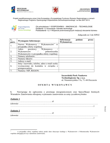 Projekt współfinansowany przez Unię Europejską z Europejskiego Funduszu Rozwoju Regionalnego w ramach Regionalnego Programu Operacyjnego Województwa Zachodniopomorskiego na lata 2007-2013 Oś priorytetowa 1 GOSPODARKA – INNOWACJE – TECHNOLOGIE Działanie 1.2 Innowacje i transfer technologii Poddziałanie 1.2.1 Wsparcie proinnowacyjnych instytucji otoczenia biznesu Załącznik nr 2 do SIWZ L. porz. 1. 2. 3. 4. 5. 6. 7. Wymagane Informacje: Informacje Wykonawcę: podane przez Nazwa Wykonawcy / Wykonawców1 w przypadku oferty wspólnej: Adres pocztowy Wykonawcy / Wykonawców / pełnomocnika Wykonawców w przypadku oferty wspólnej: Numery telefonów: Numery faksów: Adresy e-mail: Imię i nazwisko, telefon, adres e-mail osoby wyznaczonej do kontaktu w związku z postępowaniem: Numery: NIP, REGON: Szczeciński Park Naukowo Technologiczny Sp. z o.o. ul. Niemierzyńska 17a, 71-441Szczecin OFERTA WYKONAWCY I. Nawiązując do ogłoszenia o przetargu nieograniczonym oraz Specyfikacji Istotnych Warunków Zamówienia oferujemy wykonanie zamówienia za cenę ryczałtową brutto: Zadanie 2 ……………………………………………….. zł (słownie: ……………………………..……………………………………………………………… …………………………………………………………………………………………………..) 1 w przypadku oferty wspólnej należy podać dane dotyczące każdego z Wykonawców i Pełnomocnika Wykonawców wspólnie ubiegających się o udzielenie zamówienia. Strona1 Zadanie 1 ……………………………………………….. zł (słownie: ……………………………..……………………………………………………………… …………………………………………………………………………………………………..) Projekt współfinansowany przez Unię Europejską z Europejskiego Funduszu Rozwoju Regionalnego w ramach Regionalnego Programu Operacyjnego Województwa Zachodniopomorskiego na lata 2007-2013 Oś priorytetowa 1 GOSPODARKA – INNOWACJE – TECHNOLOGIE Działanie 1.2 Innowacje i transfer technologii Poddziałanie 1.2.1 Wsparcie proinnowacyjnych instytucji otoczenia biznesu (słownie: ……………………………..……………………………………………………………… …………………………………………………………………………………………………..) W kalkulowanym wynagrodzeniu uwzględniono wszystkie elementy jakie mogą mieć wpływ na jego wysokość, w szczególności elementy przewidziane opisem przedmiotu zamówienia, załączoną do SIWZ dokumentacją - i z uwzględnieniem wszelkich kosztów związanych z realizacją przedmiotu zamówienia i niezbędnych do jego wykonania. Oświadczam(y) ,że przedmiot zamówienia zrealizujemy w terminie określonym w siwz. Oświadczam(y), że jesteśmy związani niniejszą ofertą przez okres 60 dni od upływu terminu składania ofert. Oświadczam(y), że w razie wybrania naszej oferty zobowiązujemy się do podpisania umowy na warunkach zawartych we wzorze umowy dołączonym do siwz oraz w miejscu i terminie określonym przez zamawiającego. Oferujemy udzielenie gwarancji jakości na okres zgodny z siwz. Oświadczamy, że oferta nie zawiera/ zawiera (właściwe podkreślić) informacji stanowiących tajemnicę przedsiębiorstwa w rozumieniu przepisów o zwalczaniu nieuczciwej konkurencji. Informacje takie zawarte są w następujących dokumentach: ................................................................................. ................................................................................. ................................................................................. II. III. IV. V. VI. Ofertę składamy na ................................ kolejno ponumerowanych stronach. Na ofertę składają się : ................................... ................................... ................................... ................................... ................................... .................................. , dnia ...................... Strona1 1. 2. 3. 4. 5. ............................................................................. (podpis osoby upoważnionej do reprezentacji) Projekt współfinansowany przez Unię Europejską z Europejskiego Funduszu Rozwoju Regionalnego w ramach Regionalnego Programu Operacyjnego Województwa Zachodniopomorskiego na lata 2007-2013 Oś priorytetowa 1 GOSPODARKA – INNOWACJE – TECHNOLOGIE Działanie 1.2 Innowacje i transfer technologii Poddziałanie 1.2.1 Wsparcie proinnowacyjnych instytucji otoczenia biznesu Strona1