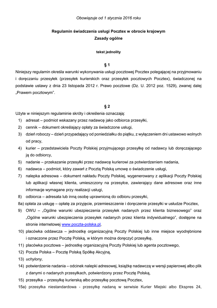 Obowiązuje od 1 stycznia 2016 roku Regulamin świadczenia usługi Pocztex w obrocie krajowym Zasady ogólne tekst jednolity §1 Niniejszy regulamin określa warunki wykonywania usługi pocztowej Pocztex polegającej na przyjmowaniu i doręczaniu przesyłek (przesyłek kurierskich oraz przesyłek pocztowych Pocztex), świadczonej na podstawie ustawy z dnia 23 listopada 2012 r. Prawo pocztowe (Dz. U. 2012 poz. 1529), zwanej dalej „Prawem pocztowym”. §2 Użyte w niniejszym regulaminie skróty i określenia oznaczają: 1) adresat – podmiot wskazany przez nadawcę jako odbiorca przesyłki, 2) cennik – dokument określający opłaty za świadczone usługi, 3) dzień roboczy – dzień przypadający od poniedziałku do piątku, z wyłączeniem dni ustawowo wolnych od pracy, 4) kurier – przedstawiciela Poczty Polskiej przyjmującego przesyłkę od nadawcy lub doręczającego ją do odbiorcy, 5) nadanie – przekazanie przesyłki przez nadawcę kurierowi za potwierdzeniem nadania, 6) nadawca – podmiot, który zawarł z Pocztą Polską umowę o świadczenie usługi, 7) nalepka adresowa – dokument nakładu Poczty Polskiej, wygenerowany z aplikacji Poczty Polskiej lub aplikacji własnej klienta, umieszczony na przesyłce, zawierający dane adresowe oraz inne informacje wymagane przy realizacji usługi, 8) odbiorca – adresata lub inną osobę uprawnioną do odbioru przesyłki, 8a) opłata za usługę – opłatę za przyjęcie, przemieszczenie i doręczenie przesyłki w usłudze Pocztex, 9) OWU – „Ogólne warunki ubezpieczenia przesyłek nadanych przez klienta biznesowego” oraz „Ogólne warunki ubezpieczenia przesyłek nadanych przez klienta indywidualnego”, dostępne na stronie internetowej www.poczta-polska.pl, 10) placówka oddawcza – jednostkę organizacyjną Poczty Polskiej lub inne miejsce wyodrębnione i oznaczone przez Pocztę Polską, w którym można doręczyć przesyłkę, 11) placówka pocztowa – jednostkę organizacyjną Poczty Polskiej lub agenta pocztowego, 12) Poczta Polska – Pocztę Polską Spółkę Akcyjną, 13) uchylony, 14) potwierdzenie nadania – odcinek nalepki adresowej, książkę nadawczą w wersji papierowej albo plik z danymi o nadanych przesyłkach, potwierdzony przez Pocztę Polską, 15) przesyłka – przesyłkę kurierską albo przesyłkę pocztową Pocztex, 15a) przesyłka niestandardowa - przesyłkę nadaną w serwisie Kurier Miejski albo Ekspres 24, spełniającą przynajmniej jedno z poniższych kryteriów: a) wymiary wynoszące 250 cm<(a+b+c)<=300 cm, przy czym dł. maks. = 150 cm, b) wymiary wynoszące (a+b+c)<=250 cm, przy czym dł. maks. = 150 cm, posiadającej: - nieregularne kształty lub - wystające elementy, lub - składającej się z dwóch odrębnych części, połączonych w jedną nieregularną całość (np. za pomocą folii stretch, taśmy); za wyjątkiem przesyłek, których opakowanie stanowi koperta foliowa (zwana inaczej foliopakiem),1 16) przesyłka pocztowa Pocztex – rzecz opatrzoną oznaczeniem adresata i adresem, przyjętą przez Pocztę Polską w celu przemieszczenia i doręczenia adresatowi, o masie powyżej 20 kg, lecz nie przekraczającej 100 kg, zgodnie z załącznikiem nr 1A do regulaminu, z wyłączeniem przesyłek listowych, 16a) punkt odbioru – miejsce odbioru przesyłki z opcją „Odbiór w punkcie”, będące placówką pocztową, 16b) punkt partnerski – miejsce odbioru przesyłki z opcją „Odbiór w punkcie”, niebędące placówką pocztową, 16c) regulamin – Regulamin świadczenia usługi Pocztex w obrocie krajowym, 16d) Rozporządzenie – rozporządzenie Ministra Administracji i Cyfryzacji z dnia 26 listopada 2013 r. w sprawie reklamacji usługi pocztowej (Dz. U. 2013 r., poz. 1468), 16e) usługa pocztowa Pocztex – usługę polegającą na przyjmowaniu, sortowaniu, przemieszczaniu i doręczaniu przesyłek (przesyłek kurierskich oraz przesyłek pocztowych Pocztex), zwaną dalej „usługą Pocztex”, 17) zawiadomienie – informację o podjętej próbie doręczenia przesyłki, pozostawioną albo przekazaną w przypadku stwierdzenia nieobecności odbiorcy lub braku możliwości odbioru przesyłki oraz informację o nadejściu przesyłki. §3 1. Poczta Polska w ramach usługi Pocztex przyjmuje: 1) przesyłki kurierskie jako paczki pocztowe o masie do 20 kg i wymiarach, o których mowa w § 3 ust. 2 i 3 załącznika nr 1A do regulaminu oraz przesyłki listowe o masie i wymiarach, o których mowa w § 3 ust. 1 - 3 załącznika nr 1A do regulaminu, 2) przesyłki pocztowe Pocztex o masie i wymiarach, o których mowa w § 3 ust. 1 pkt 2 – 4, ust. 2 oraz ust. 3 pkt 2 - 4 załącznika nr 1 A do regulaminu. 2. Poczta Polska świadczy usługę Pocztex w gwarantowanych terminach, określonych w załączniku nr 1A do regulaminu, w serwisach: 1) Kurier Miejski, 2) Kurier Krajowy, 3) Ekspres 24, 1 W brzmieniu ustalonym w pkt 1 Załącznika Nr 1 do Decyzji wprowadzającej niniejszy tekst jednolity. 2 4) Kurier 48, 5) Kurier Bezpośredni, na zasadach szczegółowych określonych w tym załączniku. §4 Poczta Polska świadczy usługę Pocztex także z opcją „Odbiór w punkcie” z możliwością odbioru przesyłki: 1) w punkcie odbioru dla przesyłek w serwisie Kurier 48 albo Ekspres 24, 2) w punkcie partnerskim dla przesyłek w serwisie Kurier 48 jako przesyłka Kurier 48 standard albo Ekspres 24, dla adresatów posiadających pocztę elektroniczną albo numer telefonu w sieci telefonii komórkowej operatora krajowego. §5 Przesyłki przyjmowane są w opakowaniu klienta lub opakowaniu nakładu Poczty Polskiej. Wzory i rozmiary oferowanych opakowań dostępne są na stronie internetowej www.pocztex.pl. §6 1. Przyjęcie przesyłki do przemieszczenia i doręczenia nie stanowi potwierdzenia ze strony Poczty Polskiej, że jej zabezpieczenie, zawartość, opakowanie, oznaczenie lub inne parametry są zgodne z umową, regulaminem lub załącznikiem nr 1A do regulaminu. 2. Poczta Polska ma pra
