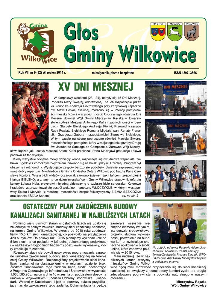 Rok VIII nr 9 (92) Wrzesień 2014 r. miesięcznik, pismo bezpłatne ISSN 1897–3566 XV DNI MESZNEJ W sierpniowy weekend (23 i 24), odbyły się 15 Dni Mesznej. Podczas Mszy Świętej, odprawionej na ich rozpoczęcie przez ks. kanonika Andrzeja Piotrowskiego przy zabytkowej kapliczce pw. Matki Boskiej Siewnej, modlono się w intencji pomyślności mieszkańców i wszystkich gości. Uroczystego otwarcia Dni Mesznej dokonał Wójt Gminy Mieczysław Rączka w towarzystwie sołtysa Mesznej Antoniego Kufla i zacnych gości w osobach: Starosty Bielskiego Andrzeja Płonki, Przewodniczącego Rady Powiatu Bielskiego Romana Migdała, pani Renaty Franasik i Grzegorza Gabora – przedstawicieli Starostwa Bielskiego. W tym czasie na scenę poproszono również Macieja Stworę, meszniańskiego peregrino, który w maju tego roku przebył Drogę św. Jakuba do Santiago de Compostela. Zarówno Wójt Mieczysław Rączka jak i sołtys Mesznej Antoni Kufel przekazali Panu Maciejowi gratulacje i słowa podziwu za ten wyczyn. Kiedy wszystkie oficjalne mowy dobiegły końca, rozpoczęła się dwudniowa wspaniała zabawa. Zgodnie z corocznym zwyczajem bawiono się na boisku przy ul. Szkolnej. Program był obszerny i różnorodny. Występujące zespoły bardzo się podobały. Świetnie zaprezentowała swój dobry repertuar Młodzieżowa Gminna Orkiestra Dęta z Wilkowic pod batutą Pana Czesława Koniora. Wszystkich widzów oczarował, zarówno śpiewem jak i tańcem, zespół pieśni i tańca BIELSKO, a znany na co dzień mieszkańcom Gminy Wilkowice pracownik referatu kultury Łukasz Hola, przyprawił niejedną dziewczynę o szybsze bicie serduszka. Kolorowo i radośnie zaprezentował się zespół wokalno – taneczny WŁÓCZYKIJE, w którym występowały Estera i Marysia z Mesznej, meszniański zespół folklorystyczny ZIEMIA BESKIDZKA cd. na str. 2 oraz kapela EŚTA z Sopotni. ostateczny PLAN ZAKOŃCZENIA budowy KANALIZACJI SANITARNEJ W NAJBLIŻSZYCH LATACH Pomimo wielu usilnych starań w ostatnich latach nie udało się zakończyć, w pełnym zakresie, budowy sieci kanalizacji sanitarnej na terenie Gminy Wilkowice. W okresie od 2010 roku zbudowaliśmy 15,5 km sieci kanalizacyjnej, co pozwoliło na przyłączenie 420 budynków. Do połowy roku 2015 planujemy wykonać kolejne 5 km sieci, na co posiadamy już pełną dokumentację projektową i w najbliższych tygodniach będziemy poszukiwać wykonawcy, który zrealizuje to zadanie. Rozpoczynający się powoli nowy okres programowania zapewne umożliwi zakończenie budowy sieci kanalizacyjnej na terenie całej Gminy Wilkowice. Rozpoczęliśmy projektowanie sieci kanalizacji sanitarnej na obszarze gminy, w rejonach, gdzie jej brak. Źródłem finansowania tego zadania będą środki pochodzące z Programu Operacyjnego Infrastruktura i Środowisko w wysokości 1.036.585,20 zł, na co w dniu 16 września br. podpisałem stosowną umowę w Wojewódzkim Funduszu Ochrony Środowiska i Gospodarki Wodnej w Katowicach. I jest to pierwszy sukces przybliżający nas do zakończenia tego zadania. Dokumentacja ta będzie zawierała wszystkie niezbędne elementy (w tym m. in.: decyzje środowiskowe, projekty, studium wykonalności, pozwolenie na budowę itd.) umożliwiające skuteczne aplikowanie o środki unijne, które zapewne poja- Na zdjęciu od lewej Panowie Adam Liwochowski i Mirosław Szemla pełniący wią się w 2015 roku. funkcję Zastępców Prezesa Zarządu WFOMam nadzieję, że w najŚiGW oraz Wójt Gminy Mieczysław Rączka bliższych latach wszyscy z podpisaną umową. mieszkańcy Gminy Wilkowice będą mieli możliwość przyłączenia się do sieci kanalizacji sanitarnej, co zwiększy z jednej strony komfort życia, a z drugiej zdecydowanie poprawi stan środowiska naturalnego w naszym otoczeniu. Mieczysław Rączka Wójt Gminy Wilkowice cd. ze str. 1 Balsamem dla ucha i ducha były występy GRUPY FURMANA z Bielska-Białej i krakowskiego zespołu WAWELE z Janem Wojdakiem, którego „Biały latawiec” i „Zostań z nami melodio” nucili wszyscy obecni na placu. Dwudniowe święto wsi zakończył krótki, ale niezwykle efektowny pokaz sztucznych ogni. XV Dni Mesznej były wyjątkowe. Bawiono się do późnej nocy, chociaż mogło być inaczej. W sobotni wieczór bardzo wcześnie zaczął, najnormalniej w świecie, lać deszcz. I co? Najpierw wszyscy szukali miejsca pod parasolami, a potem zaczęli tańczyć. I tak w strugach deszczu albo pod ogrodowymi parasolami, tańczyli do dnia następnego. Nikt nie szedł do domu, ciągle nadchodzili nowi amatorzy zabawy. Jak co roku dużym zainteresowaniem cieszyła się loteria fantowa, a główna nagroda powędrowała do naszych sąsiadów. Szczę- LISTA SPONSORÓW 1. Rada i Urząd Gminy w Wilkowicach 2. Rada Sołecka 3. Proboszcz parafii Meszna 4. Stowarzyszenie Rozwoju Mesznej 5. Ochotnicza Straż Pożarna w Mesznej 6. Koło Gospodyń Wiejskich z Mesznej 7. PAGED Meble Jasienica – Fundator Głównej Nagrody 8. Hotel ALPIN Szczyrk 9. Krzysztof Kufel 10. Hurtownia ELBIS – Czesław i Marcin BISKUP 11. Bank Spółdzielczy w Bystrej 12. Józefa Kurowska 13. Firma GRABO – Bogdan Gałuszka i Grażyna Mędrek 14. Firma EKO-WTÓR – Małgorzata i Kazimierz Jakubiec 15. Państwo Halina i Leszek Biegunowie 16. Spółdzielnia BYSTRZANKA 17. Salon Fryzjerski Urszula Solarz - Prochownik 18. Zakład Fryzjerski – Iwona Łopata 19. Anna Maślanka 20. Firma Lenko 21. Firma Wilmark Paulina Rączka śliwcem, który wylosował osiem wyplatanych krzeseł z Fabryki Mebli Giętych z Jasienicy został Łukasz z Bystrej. Były również przyjemności dla ciała: wspaniałe ciasto drożdżowe i kanapki przygotowane przez Panie z KGW. Jak zwykle Dni Mesznej to był czas miłej zabawy. Wszystko to mogło się stać dzięki ludziom o wspaniałych sercach. Dziękujemy bardzo gorąco wszystkim osobom i instytucjom, które wsparły organizację XV DNI MESZNEJ. Dziękujemy za wszystkie produkty żywnościowe, fanty do loterii i za prze