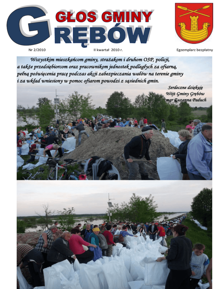 Nr 2/2010 II kwartał 2010 r. Egzemplarz bezpłatny Wszystkim mieszkańcom gminy, strażakom i druhom OSP, policji, a także przedsiębiorcom oraz pracownikom jednostek podległych za ofiarną, pełną poświęcenia pracę podczas akcji zabezpieczania wałów na terenie gminy i za wkład wniesiony w pomoc ofiarom powodzi z sąsiednich gmin. Serdeczne dziękuję Wójt Gminy Grębów mgr Zuzanna Paduch Zarys raportu z powodzi 18 maja 2010r., godz. 14.00 - ogłoszenie alarmu powodziowego dla gminy Grębów, - posiedzenie i podjęcie prac przez Gminny Zespół Zarządzania Kryzysowego w Grębowie zwany dalej GZZK, którego szefem jest wójt Zuzanna Paduch, - wprowadzenie całodobowych dyżurów w Urzędzie Gminy, - przystąpienie do realizacji zadań ujętych w planach operacyjnych ochrony przed powodzią, - utrzymywanie sił i środków w gotowości do użycia, - wyjazdy członków GZZK w teren w celu monitorowania poziomu wód i stanu wałów, - bieżące monitorowanie zbiornika w Wilczej Woli, - napełnianie worków piaskiem i uszczelnianie wałów przez mieszkańców i członków OSP, - ciągły wzrost stanu wód w rzekach, - zdawanie relacji przez sołtysów i wyznaczonych strażaków OSP o poziomie stanu wody w rzekach, - bieżące objazdy Szefa i członków GZZK oraz strażaków po wałach na terenie gminy, - wydawanie worków na wały i dla mieszkańców, - uruchomienie koparek do ładunku piasku i samochodów do transportu, - powiadomienie dyrektorów szkół i przedszkoli, ośrodka zdrowia oraz przygotowanie lokali do ewentualnego przyjęcia ewakuowanej ludności, - uzupełnianie magazynów workami i wydawanie w miarę potrzeb, dowożenie piachu i napełnianie worków, - Wójt wyraża zgodę na pobór piasku dla miasta Tarnobrzeg, 20 maja 2010r., godz.14.00 pojawienie się na wałach w Jamnicy licznych jednostek obcych straży, - dyżurowanie i obserwowanie wałów i poziomu wód także nocą, - dostarczanie żywności (chleba, wody, konserw, lekarstw) dla poszkodowanych mieszkańców gminy Gorzyce od strony Furman i Sokolnik, - przyjmowanie napływających darów od przedsiębiorców, mieszkańców, instytucji charytatywnych i dostarczanie poszkodowanym, - przygotowywanie posiłków dla przyjezdnych strażaków walczących z żywiołem w sąsiedniej gminie, -3- - składanie meldunków do Powiatowego Centrum Zarządzania Kryzysowego w Tarnobrzegu, - powiadomienie mieszkańców o możliwości wystąpienia zagrożenia chorobami zakaźnymi w związku z powodzią, - wyrażenie zgody na zakwaterowanie powodzian z terenu gminy Gorzyce, - ostrzeżenie mieszkańców wsi Żupawa, Zabrnie i Poręby Furmańskie o przygotowaniu się ludności i inwentarza do ewentualnej ewakuacji, - przyjęcie powodzian z sąsiedniej gminy Gorzyce do Szkoły Podstawowej w Wydrzy oraz dowożenie powodzian do Ośrodka Szkolno-Wychowawczego w Grębowie , - przyjęcie przez mieszkańców gminy Grębów ewakuowanej ludności i inwentarza z sąsiedniej gminy Gorzyce, - zorganizowanie śpiworów, kocy i łóżek polowych dla ewakuowanych powodzian, dostarczyła je Jednostka Wojskowa z Nowej Dęby, - dostarczenie przez Zakład Karny w Chmielowie kocy, materacy, poduszek, prześcieradeł, - GOPS Grębów organizuje zbiórkę żywności i inne niezbędne artykuły na terenie gminy Grębów, 21 maja 2010r. - liczny udział mieszkańców w zabezpieczaniu wałów w Jamnicy, Stalach, Krawcach, Żupawie, Zapoledniku, Zabrniu i Porębach Furmańskich (uszczelnianie przepustów ), - wizyta starosty powiatu tarnobrzeskiego Wacława Wróbla - sprawdzenie sytuacji powodziowej na naszym terenie, - podsiąki na wałach zostały opanowane dzięki zaangażowaniu mieszkańców gminy, - czynny udział w dyżurze GZZK wicestarosty Jacka Hynowskiego, - czynny udział policjantów w dostarczaniu worków i kierowaniu ruchem, - dalsze całodobowe dyżury na wałach, dostarczanie worków, piasku i pochodni, - udzielanie pomocy powodzianom i wydawanie darów dla powodzian z sąsiednich gmin, - apelowanie do mieszkańców gminy o niewypompowywanie wody z zalanych piwnic gdyż może to spowodować podmycie i pęknięcie fundamentów budynków w związku z utrzymującym się wysokim stanem wód gruntowych, - czynne włączenie się lokalnych firm w rozładowywanie napływających darów, wody zboża, siana, pasz dla zwierząt, - udostępnienie magazynów na dary dla powodzian przez prezesa GS „SCh” Grębów, - współpraca z Powiatowym Centrum Wolontariatu Stalowa Wola i PCK, - bieżąca współpraca z GOPS Gorzyce - bieżące składanie przez kierownika GOPS zapotrzebowań, organizowanie i udzielanie pomocy dla powodzian 25 maja 2010r. - sytuacja na rzekach zaczyna się stabilizować, - monitorowanie i liczenie poniesionych strat w infrastrukturze w związku z podtopieniami, 27 maja 2010 r., godz.1200 - odwołanie alarmu powodziowego dla gminy Grębów i utrzymanie pogotowia przeciwpowodziowego, - odwołanie całodobowego dyżuru GZZK w Urzędzie Gminy w Grębowie, - dalsze świadczenie pomocy dla powodzian z terenów sąsiednich, 2 czerwca, godz.900 ogłoszenie pogotowia przeciwpowodziowego dla gminy Grębów 4 czerwca, godz.1300 ponowne ogłoszenie alarmu powodziowego dla naszej gminy, liczny udział mieszkańców i straży OSP przy napełnianiu worków piachem i umacnianiu wałów B.Kwiecień 8 czerwca godz. 1200 odwołanie alarmu powodziowego i utrzymanie pogotowia przeciwpowodziowego 15 czerwca 1200 odwołanie pogotowia przeciwpowodziowego 29 lipca o godz. 900 w związku z niekorzystną sytuacją meteorologiczną ogłoszenie pogotowia przeciwpowodziowego 2 sierpnia 2010 r. godz. 1200 odwołanie pogotowia przeciwpowodziowego. Ogółem wydano 80 000 szt. worków do umacniania wałów i 600 szt. pochodni. Rozumiejąc bardzo trudną sytuację gmin sąsiednich, udzieliliśmy pomocy finansowej dla: Gminy Gorzyce – 20 000 zł na remont przedszkola w Trześni, Miasta Tarnobrzeg- 20 000 zł w formie umorzenia podatku Nasi strażacy ochotnicy 