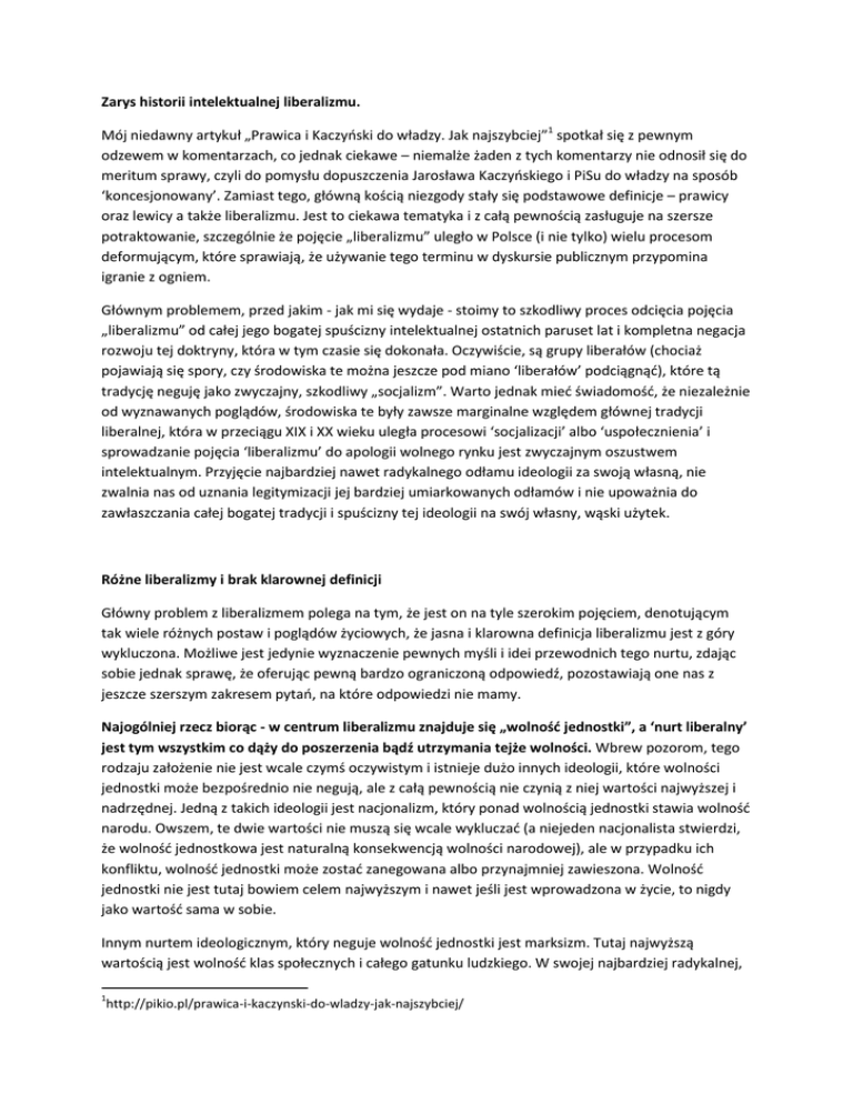 Zarys historii intelektualnej liberalizmu. Mój niedawny artykuł „Prawica i Kaczyoski do władzy. Jak najszybciej”1 spotkał się z pewnym odzewem w komentarzach, co jednak ciekawe – niemalże żaden z tych komentarzy nie odnosił się do meritum sprawy, czyli do pomysłu dopuszczenia Jarosława Kaczyoskiego i PiSu do władzy na sposób ‘koncesjonowany’. Zamiast tego, główną kością niezgody stały się podstawowe definicje – prawicy oraz lewicy a także liberalizmu. Jest to ciekawa tematyka i z całą pewnością zasługuje na szersze potraktowanie, szczególnie że pojęcie „liberalizmu” uległo w Polsce (i nie tylko) wielu procesom deformującym, które sprawiają, że używanie tego terminu w dyskursie publicznym przypomina igranie z ogniem. Głównym problemem, przed jakim - jak mi się wydaje - stoimy to szkodliwy proces odcięcia pojęcia „liberalizmu” od całej jego bogatej spuścizny intelektualnej ostatnich paruset lat i kompletna negacja rozwoju tej doktryny, która w tym czasie się dokonała. Oczywiście, są grupy liberałów (chociaż pojawiają się spory, czy środowiska te można jeszcze pod miano ‘liberałów’ podciągnąd), które tą tradycję neguję jako zwyczajny, szkodliwy „socjalizm”. Warto jednak mied świadomośd, że niezależnie od wyznawanych poglądów, środowiska te były zawsze marginalne względem głównej tradycji liberalnej, która w przeciągu XIX i XX wieku uległa procesowi ‘socjalizacji’ albo ‘uspołecznienia’ i sprowadzanie pojęcia ‘liberalizmu’ do apologii wolnego rynku jest zwyczajnym oszustwem intelektualnym. Przyjęcie najbardziej nawet radykalnego odłamu ideologii za swoją własną, nie zwalnia nas od uznania legitymizacji jej bardziej umiarkowanych odłamów i nie upoważnia do zawłaszczania całej bogatej tradycji i spuścizny tej ideologii na swój własny, wąski użytek. Różne liberalizmy i brak klarownej definicji Główny problem z liberalizmem polega na tym, że jest on na tyle szerokim pojęciem, denotującym tak wiele różnych postaw i poglądów życiowych, że jasna i klarowna definicja liberalizmu jest z góry wykluczona. Możliwe jest jedynie wyznaczenie pewnych myśli i idei przewodnich tego nurtu, zdając sobie jednak sprawę, że oferując pewną bardzo ograniczoną odpowiedź, pozostawiają one nas z jeszcze szerszym zakresem pytao, na które odpowiedzi nie mamy. Najogólniej rzecz biorąc - w centrum liberalizmu znajduje się „wolnośd jednostki”, a ‘nurt liberalny’ jest tym wszystkim co dąży do poszerzenia bądź utrzymania tejże wolności. Wbrew pozorom, tego rodzaju założenie nie jest wcale czymś oczywistym i istnieje dużo innych ideologii, które wolności jednostki może bezpośrednio nie negują, ale z całą pewnością nie czynią z niej wartości najwyższej i nadrzędnej. Jedną z takich ideologii jest nacjonalizm, który ponad wolnością jednostki stawia wolnośd narodu. Owszem, te dwie wartości nie muszą się wcale wykluczad (a niejeden nacjonalista stwierdzi, że wolnośd jednostkowa jest naturalną konsekwencją wolności narodowej), ale w przypadku ich konfliktu, wolnośd jednostki może zostad zanegowana albo przynajmniej zawieszona. Wolnośd jednostki nie jest tutaj bowiem celem najwyższym i nawet jeśli jest wprowadzona w życie, to nigdy jako wartośd sama w sobie. Innym nurtem ideologicznym, który neguje wolnośd jednostki jest marksizm. Tutaj najwyższą wartością jest wolnośd klas społecznych i całego gatunku ludzkiego. W swojej najbardziej radykalnej, 1 http://pikio.pl/prawica-i-kaczynski-do-wladzy-jak-najszybciej/ komunistycznej wersji, wolnośd marksistowska stanowi dokładne zaprzeczenie wolności liberalnej – ‘skok do królestwa wolności’ o którym pisał Engels, ma oznaczad zniesienie jakiejkolwiek indywidualnej przypadkowości i możliwości do samodecydowania pojedynczego człowieka. Wolnością jest tutaj współuczestniczenie w kolektywie, które realizuje uniwersalną ‘naturę gatunkową człowieka’. Wolnośd w rozumieniu liberalnym wykluczał zarówno determinizm historyczny jak i utopia komunizmu. Ponad wolnością liberalną (która była nazywana ‘wolnością burżuazyjną’) stały obiektywne prawa Historii, które w efekcie miały doprowadzid do przejęcia do ludzkości pełnej kontroli nad swoim losem, ale w sensie kolektywistycznym. Skoro wszyscy jesteśmy w gruncie tacy sami (czytaj: mamy taką samą naturę gatunkową), jakiekolwiek różnice w czynionych przez nas decyzjach mogą byd jedynie efektem nie do kooca przezwyciężonej alienacji. Duży problem ze spuścizną marksowską miały środowiska reformistyczne i socjaldemokratyczne. Początkowo także dążyły one do budowy komunizmu/socjalizmu, tyle że na drodze przemian pokojowych i parlamentarnych. Stopniowo jednak teoria ta została zarzucona, a socjaldemokraci zaadoptowali w pełni liberalną koncepcję wolności, tyle że w jej ‘uspołecznionej’ formie (o czym będzie mowa za chwilę). Symboliczną datą tej zmiany był listopad 1959 roku i przyjęcie przez niemieckich socjaldemokratów (SPD) programu godesberskiego, który zerwał w dużej mierze z tradycją marksistowską. Należy też wspomnied o tradycji republikaoskiej, która także stoi w sprzeczności z koncepcją wolności liberalnej. W przypadku republikanów, podmiotem wolności jest wspólnota polityczna obywateli (res publica), która stoi ponad wolnością indywidualną. Pewną formą wolności kolektywistycznej (a więc nie-liberalnej) jest też wolnośd rynku, rynek jest bowiem strukturą ponadosobową, łącząca ze sobą większe grupy osób. Różne są opinie co do relacji między wolnością rynku a pojedynczego człowieka, ale zakładając, że doszłoby tutaj do jakiegoś konfliktu – liberał z zasady powinien stanąd po stronie pojedynczego człowieka (którego wolnośd jest dla niego najważniejsza). Ale relacje te są tematem ciągłej debaty i 