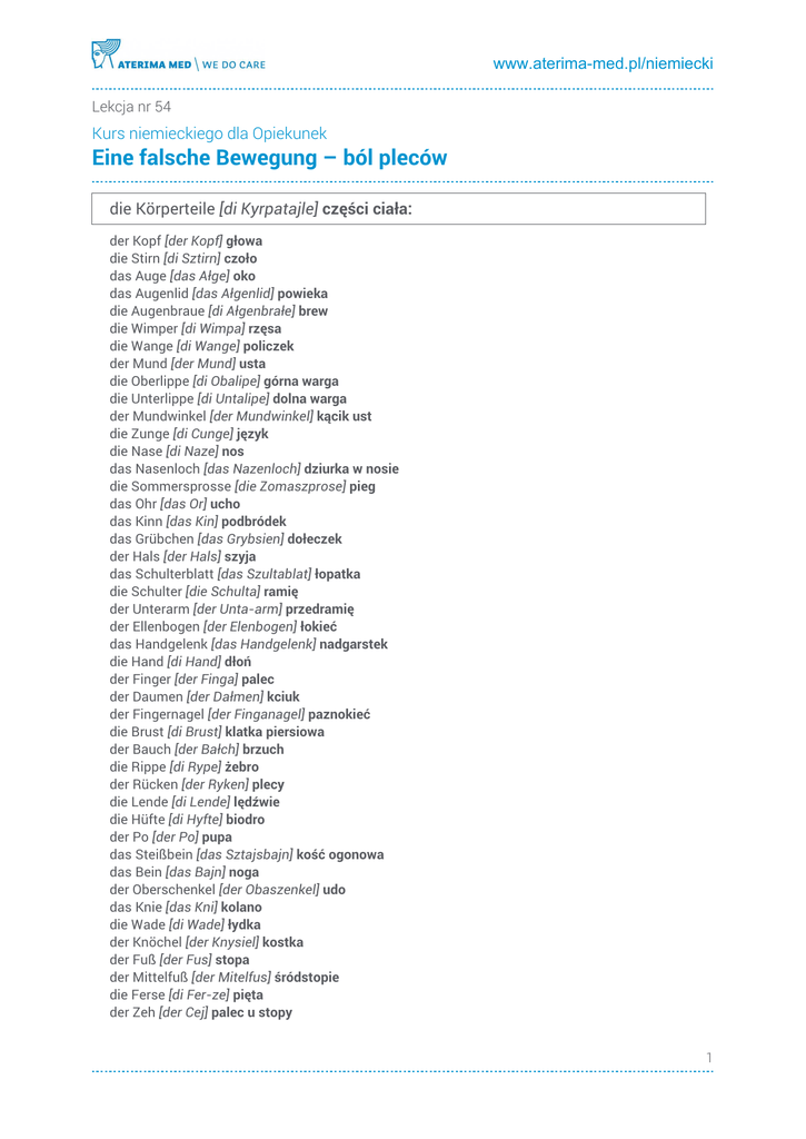 www.aterima-med.pl/niemiecki Lekcja nr 54 Kurs niemieckiego dla Opiekunek Eine falsche Bewegung – ból pleców die Körperteile [di Kyrpatajle] części ciała: der Kopf [der Kopf] głowa die Stirn [di Sztirn] czoło das Auge [das Ałge] oko das Augenlid [das Ałgenlid] powieka die Augenbraue [di Ałgenbrałe] brew die Wimper [di Wimpa] rzęsa die Wange [di Wange] policzek der Mund [der Mund] usta die Oberlippe [di Obalipe] górna warga die Unterlippe [di Untalipe] dolna warga der Mundwinkel [der Mundwinkel] kącik ust die Zunge [di Cunge] język die Nase [di Naze] nos das Nasenloch [das Nazenloch] dziurka w nosie die Sommersprosse [die Zomaszprose] pieg das Ohr [das Or] ucho das Kinn [das Kin] podbródek das Grübchen [das Grybsien] dołeczek der Hals [der Hals] szyja das Schulterblatt [das Szultablat] łopatka die Schulter [die Schulta] ramię der Unterarm [der Unta-arm] przedramię der Ellenbogen [der Elenbogen] łokieć das Handgelenk [das Handgelenk] nadgarstek die Hand [di Hand] dłoń der Finger [der Finga] palec der Daumen [der Dałmen] kciuk der Fingernagel [der Finganagel] paznokieć die Brust [di Brust] klatka piersiowa der Bauch [der Bałch] brzuch die Rippe [di Rype] żebro der Rücken [der Ryken] plecy die Lende [di Lende] lędźwie die Hüfte [di Hyfte] biodro der Po [der Po] pupa das Steißbein [das Sztajsbajn] kość ogonowa das Bein [das Bajn] noga der Oberschenkel [der Obaszenkel] udo das Knie [das Kni] kolano die Wade [di Wade] łydka der Knöchel [der Knysiel] kostka der Fuß [der Fus] stopa der Mittelfuß [der Mitelfus] śródstopie die Ferse [di Fer-ze] pięta der Zeh [der Cej] palec u stopy 1 www.aterima-med.pl/niemiecki die Ausdrücke [di Ałsdryke] wyrażenia: die Quetschung [di Kwetszung] zmiażdżenie gequetschte Stelle [gekwetszte Sztele] zmiażdżone miejsce die Verletzung [di Ferlecung] rana, obrażenie, kontuzja sich eine schwere Verletzung zuziehen [ziś ajne szwere Ferlecung cucijen] doznać groźnej kontuzji das Taubheitsgefühl [das Tałbhajtsgefyl] uczucie zdrętwienia frühzeitige Einnahme der Arzneimittel [fryzajtige Ajnname der Arcnajmytel] wczesne zażycie lekarstw die Wärmekompresse [di Wermekomprese] kompres rozgrzewający die Wärmflasche [di Wermflasze] termofor die Wärmesalbe [di Wermezalbe] maść rozgrzewająca der Wärmepflaster [der Wermepflasta] plaster rozgrzewający das Heizkissen [das Hajckysen] poduszka elektryczna die Vorbeugung [di Forbojgung] zapobieganie, profilaktyka die Vorbeugungsmaßnahme [di Forbojgungsmasname] środek zapobiegawczy die Krankengymnastik [di Krankengymnastik] gimnastyka lecznicza ein brennender Schmerz durchzuckte mich [ajn brenenda Szmerc durścukte miś] piekący ból przeszedł moje ciało abruptes Bücken [abruptes Byken] nagłe schylenie się die Nervenreizung [di Nerwenrajcung] podrażnienie nerwów schnelle Hilfe ist unerlässlich [sznele Hilfe yst unerlesliś] szybka pomoc jest niezbędna rezeptfreie Schmerzmittel [receptfraje Szmercmytel] środki przeciwbólowe dostępne bez recepty strapazierte Muskeln [sztrapacirte Muskeln] nadwyrężone mięśnie Bänder am Kreuz [Benda am Krojc] więzadła kręgosłupa die Röntgenaufnahme, das Röntgenbild [di Ryntgenałfname], [das Ryntgenbild] zdjęcie rentgenowskie die Magnet-Resonan-Tomographie [di Magnet – Rezonanc – Tomografi] rezonans magnetyczny die Computertomographie [di Kompiutatomografi] tomografia komputerowa einen krummen Rücken machen [ajnen krumen Ryken machen] krzywić plecy sich vor Schmerz krümmen [ziś for Szmerc krymen] wić się z bólu qualvoll [kwalfol] bolesny Lenden-Kreuz-Geflecht [Lenden – Krojc – Gefleśt] splot krzyżowy Verkümmerung der Bauch- und Rückenmuskeln [Ferkymerung der Bałch – und Rykenmuskeln] zanik mięśni das Alarmzeichen [das Alarmcajsien] znak, sygnał ostrzegawczy der/die Orthopäde/-in [der/di Ortopede/Ortopedin] ortopeda die Chirotherapie [di Chiroterapi] chiroterapia chirotherapeutische Handgriffe [chiroterapojtisze Handgryfe] chiroterapeutyczne chwyty die Gelenkkapsel [di Gelenkkapsel] torebka stawowa Selbstheilungskräfte des Körpers [Zelbsthajlungskrefte des Kyrpers] zdolność ciała do samoleczenia ganzheitliche Pflege [ganc-hajtlisie Pflege] całościowa opieka nad chorym arbeitsunfähig [arbajtsunfeiś] niezdolny do pracy jemanden arbeitsunfähig schreiben [jemandejn arbajtsunfeiś szrajben] uznać kogoś za niezdolnego do pracy Stöße abfedern [Sztyse abfedern] tłumić uderzenia, upadki Verringerung des Rückfallrisikos [Feringerung des Rykfalrizikos] zmniejszenie ryzyka nawrotu choroby die Therapiemaßnahmen [di Terapimasnamen] działania w obrębie terapii die Behandlungsmöglichkeiten [di Behandlungsmygliśkajten] możliwości leczenia rasche Linderung [rasze Linderung] szybka ulga das Präparat verschafft Linderung [das Preparat verszaft Linderung] ten preparat przyniesie ulgę 2 www.aterima-med.pl/niemiecki Materiał stanowi własność firmy ATERIMA Sp. z o.o. Sp. K. ul. Puszkarska 7f, 30-644 Kraków. Reprodukcja, rozpowszechnianie lub inne wykorzystywanie całości lub części materiału w jakiejkolwiek formie dla celów innych, niż cele niekomercyjne i osobiste jest zakazane. 3 Powered by TCPDF (www.tcpdf.org)