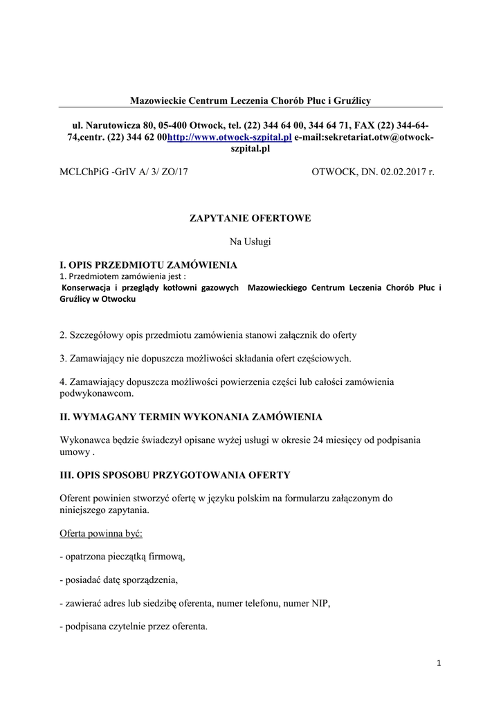Mazowieckie Centrum Leczenia Chorób Płuc i Gruźlicy ul. Narutowicza 80, 05-400 Otwock, tel. (22) 344 64 00, 344 64 71, FAX (22) 344-6474,centr. (22) 344 62 00http://www.otwock-szpital.pl e-mail:[email protected] MCLChPiG -GrIV A/ 3/ ZO/17 OTWOCK, DN. 02.02.2017 r. ZAPYTANIE OFERTOWE Na Usługi I. OPIS PRZEDMIOTU ZAMÓWIENIA 1. Przedmiotem zamówienia jest : Konserwacja i przeglądy kotłowni gazowych Mazowieckiego Centrum Leczenia Chorób Płuc i Gruźlicy w Otwocku 2. Szczegółowy opis przedmiotu zamówienia stanowi załącznik do oferty 3. Zamawiający nie dopuszcza możliwości składania ofert częściowych. 4. Zamawiający dopuszcza możliwości powierzenia części lub całości zamówienia podwykonawcom. II. WYMAGANY TERMIN WYKONANIA ZAMÓWIENIA Wykonawca będzie świadczył opisane wyżej usługi w okresie 24 miesięcy od podpisania umowy . III. OPIS SPOSOBU PRZYGOTOWANIA OFERTY Oferent powinien stworzyć ofertę w języku polskim na formularzu załączonym do niniejszego zapytania. Oferta powinna być: - opatrzona pieczątką firmową, - posiadać datę sporządzenia, - zawierać adres lub siedzibę oferenta, numer telefonu, numer NIP, - podpisana czytelnie przez oferenta. 1 IV. MIEJSCE ORAZ TERMIN SKŁADANIA OFERT 1. Oferta powinna być przesłana za pośrednictwem: poczty, kuriera lub też dostarczona osobiście na adres: Mazowieckie Centrum Leczenia Chorób Płuc i Gruźlicy , 05-400 Otwock, ul. Narutowicza 80 do dnia 13.02.2017r do godz. 14:00 . 2. Ocena ofert zostanie dokonana w terminie 7 dni od składania ofert, wyniki i wybór najkorzystniejszej oferty zostanie ogłoszony w siedzibie Zamawiającego : 05-400 Otwock ul. Narutowicza 80 oraz na stronie internetowej pod adresem www.otwock-szpital.pl 3. Oferty złożone po terminie nie będą rozpatrywane. 4. Oferent może przed upływem terminu składania ofert zmienić lub wycofać swoją ofertę. 5. W toku badania i oceny ofert Zamawiający może żądać od oferentów wyjaśnień dotyczących treści złożonych ofert. 6. Zapytanie ofertowe zamieszczono na stronie internetowej Zamawiającego: www.otwockszpital.pl V. OCENA OFERT Przy wyborze oferty Zamawiający będzie kierował się następującymi kryteriami: Kryterium wyboru Znaczenie . Cena oferty 100,00% ZASADY OCENY OFERT WEDŁUG USTALONYCH KRYTERIÓW Oferty będą oceniane w odniesieniu do najkorzystniejszych warunków przedstawionych przez wykonawców w zakresie każdego w/w kryterium. Oferta wypełniająca w najwyższym stopniu wymagania określonego kryterium, otrzyma maksymalną ilość punktów. Pozostałym ofertom przypisana zostanie odpowiednio mniejsza liczba punktów. Ad. algorytm oceny kryterium cena oferty: Cena najniższa Wp (C) = ------------------------------- x 100%, gdzie: Cena oferty badanej Cena min.– najniższa cena spośród wszystkich ocenianych ofert 2 Oferta, która w sumie uzyska największą ilość punktów zostanie wybrana jako najkorzystniejsza. VI. INFORMACJE DOTYCZĄCE WYBORU NAJKORZYSTNIEJSZEJ OFERTY O wyborze najkorzystniejszej oferty Zamawiający zawiadomi oferentów za pośrednictwem strony internetowej znajdującej się pod adresem www.otwock-szpital.pl VII. DODATKOWE INFORMACJE 1) Oferent może zwrócić się do Zamawiającego z pisemną (lub wysłaną drogą elektroniczną – e-mailem na adres Zamawiającego) prośbą o wyjaśnienie treści zapytania. 2) Zamawiający zastrzega sobie prawo do nieudzielenia odpowiedzi na pytanie wykraczające poza zakres zapytania ofertowego. VIII. ZAŁĄCZNIKI 1. opis przedmiotu zamówienia 2. Wzór formularza ofertowego 3 Załącznik nr 1 Opis przedmiotu zamówienia OPIS PRZEDMIOTU ZAMÓWIENIA Konserwacja i przeglądy kotłowni zlokalizowanych na terenach Mazowieckiego Centrum Leczenia Chorób Płuc i Gruźlicy w Otwocku przy ul. Reymonta 83/91 i ul. Narutowicza 80. Szczegółowy zakres przeglądu i konserwacji: 1) 3) 4) 5) 6) 2. II. III. 3. 2. 3. 4. 5. 3) 4) − − − 6. 7. 8. Przegląd instalacji c.o. oraz c.w. kontrola stanu armatury odcinającej kontrola stanu armatury regulacyjnej kontrola szczelności armatury kontrola ciśnienia wody w zładzie Przegląd kotłów gazowych rewizja zewnętrzna kotłów czyszczenie wewnętrzne kotłów Sprawdzenie kontrola stanu dysz (wymiana w przypadku kotła olejowego) kontrola stanu elektrod zapłonowych czyszczenie palnika regulacja palnika Sprawdzenie działania urządzeń regulacyjno – zabezpieczających Sprawdzenie ciśnienia na instalacjach gaz c.o. c.w. Kontrola pracy automatyki Sprawdzenie szczelności armatury i ścieżki gazowej. Wydruki, arkusze pomiarowe. Liczba kotłów: ul. Narutowicza w budynku pralni-2, hospicjum-3, pawilon J-2, apteka-1, administracja-1 sumie 9 kotłów ul. Reymonta w budynku laboratorium-1, pawilon główny-3, pawilon A-3, pawilon B-2 w w sumie 9 kotłów oraz jedna kotłownia olejowa w budynku administracji na Reymonta - 1 szt 4 (w załączeniu rysunki poglądowe kotłowni i zestawienie urządzeń). Wykonawca przeprowadzać będzie przegląd i czynności konserwacyjne raz w roku polegające na: 1. palniki - przegląd, konserwacja palnika i związanej z nim armatury i automatyki i sprawdzenie połączeń z układami sterowania funkcjonowania, regulacja palnika, pomiar spalin, zgodnie z wymogami instrukcji obsługi technicznej i eksploatacji. 2. kotły - kontrola połączeń elektrycznych, sprawdzenia zabezpieczeń kotła, rewizja zewnętrzna kotła, czyszczenie wewnętrzne kotła, czyszczenie płomieniówek i zawirowywaczy 3. automatyka - kontrola połączeń elektrycznych, sprawdzenia zabezpieczeń kotła (termostat i STB), sprawdzenie i ewentualne korekty nastaw automatyki kotłów o kotłowni 4. usuwanie awarii - na zgłoszenie zleceniodawcy 5. przegląd instalacji co i cw 6. sprawdzenie ciśnienia na instalacjach gaz, co i cw. Wykonawca musi posiadać specjalistyczne uprawnienia do wykonywania przeglądów i czynności konserwacyjnych i dołączyć je do oferty. Wykonawca zobowiązuje się zareagować na zg