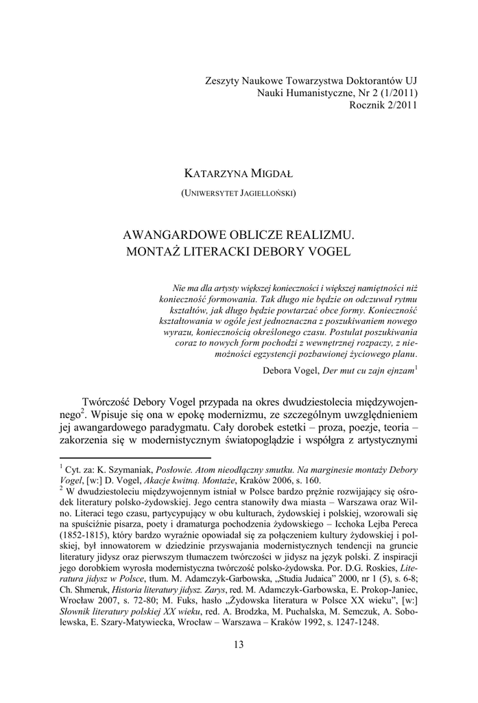 Zeszyty Naukowe Towarzystwa Doktorantów UJ Nauki Humanistyczne, Nr 2 (1/2011) Rocznik 2/2011 KATARZYNA MIGDAŁ (UNIWERSYTET JAGIELLOŃSKI) AWANGARDOWE OBLICZE REALIZMU. MONTAŻ LITERACKI DEBORY VOGEL Nie ma dla artysty większej konieczności i większej namiętności niż konieczność formowania. Tak długo nie będzie on odczuwał rytmu kształtów, jak długo będzie powtarzać obce formy. Konieczność kształtowania w ogóle jest jednoznaczna z poszukiwaniem nowego wyrazu, koniecznością określonego czasu. Postulat poszukiwania coraz to nowych form pochodzi z wewnętrznej rozpaczy, z niemożności egzystencji pozbawionej życiowego planu. Debora Vogel, Der mut cu zajn ejnzam1 Twórczość Debory Vogel przypada na okres dwudziestolecia międzywojennego2. Wpisuje się ona w epokę modernizmu, ze szczególnym uwzględnieniem jej awangardowego paradygmatu. Cały dorobek estetki – proza, poezje, teoria – zakorzenia się w modernistycznym światopoglądzie i współgra z artystycznymi 1 Cyt. za: K. Szymaniak, Posłowie. Atom nieodłączny smutku. Na marginesie montaży Debory Vogel, [w:] D. Vogel, Akacje kwitną. Montaże, Kraków 2006, s. 160. 2 W dwudziestoleciu międzywojennym istniał w Polsce bardzo prężnie rozwijający się ośrodek literatury polsko-żydowskiej. Jego centra stanowiły dwa miasta – Warszawa oraz Wilno. Literaci tego czasu, partycypujący w obu kulturach, żydowskiej i polskiej, wzorowali się na spuściźnie pisarza, poety i dramaturga pochodzenia żydowskiego – Icchoka Lejba Pereca (1852-1815), który bardzo wyraźnie opowiadał się za połączeniem kultury żydowskiej i polskiej, był innowatorem w dziedzinie przyswajania modernistycznych tendencji na gruncie literatury jidysz oraz pierwszym tłumaczem twórczości w jidysz na język polski. Z inspiracji jego dorobkiem wyrosła modernistyczna twórczość polsko-żydowska. Por. D.G. Roskies, Literatura jidysz w Polsce, tłum. M. Adamczyk-Garbowska, „Studia Judaica” 2000, nr 1 (5), s. 6-8; Ch. Shmeruk, Historia literatury jidysz. Zarys, red. M. Adamczyk-Garbowska, E. Prokop-Janiec, Wrocław 2007, s. 72-80; M. Fuks, hasło „Żydowska literatura w Polsce XX wieku”, [w:] Słownik literatury polskiej XX wieku, red. A. Brodzka, M. Puchalska, M. Semczuk, A. Sobolewska, E. Szary-Matywiecka, Wrocław – Warszawa – Kraków 1992, s. 1247-1248. 13 Katarzyna Migdał __________________________________________________________________________________________________________________________________________________________________________________________________________________________________ założeniami awangardy3. Jest on świadectwem śmiałego podążania za „nowością”, wyrazem aprobaty dla cywilizacyjnych przemian oraz dla sztuki, na której odciska się ich piętno4. Pisarka niejednokrotnie poruszała w swych rozprawach teoretyczne zagadnienie modernizmu. Od statusu, jaki nadawała swoim poczynaniom w dziedzinie literatury, zależała jej wizja modernistycznej estetyki. Ponadto, jej rozumienie modernizmu było bliskie rozumieniu wypracowanemu przez nowojorską grupę „Inzich”5. Stworzona przez nią koncepcja wiązała się z „legendą współczesności”, postępującą urbanizacją oraz poszukiwaniem odkrywczej, a zarazem odpowiedniej formy dla – jak się wyrażała – „samego życia”6. Współtworzyła ona modernizm na gruncie literatury polskiej, niemieckiej, jak i jidysz, choć próby te okupywała kondycją pisarki marginesowej i samotnej. Vogel zdawała sobie sprawę z tego, że bycie osobną postacią sceny literackiej wiąże się z dużym wyzwaniem. Organizowała zatem odczyty, publikowała na łamach czasopism w kilku językach – polskim, jidysz, hebrajskim oraz niemieckim – wykładała literaturę jidysz, była autorką licznych jej przekładów na polski. Chętnie angażowała się w polemiki dotyczące kierunku przemian 3 Modernizm jest tu rozumiany jako nurt występujący na gruncie sztuki i jej teorii, którego fundamenty wywodzą się z renesansowej antropologii, a następnie przejawiają się na gruncie idei politycznych, historycznych, społecznych czy kulturowych. Wpisuje się on w ramy nowoczesności – epoki kulturowej, której początek i koniec wyznaczają zdaniem Anny Burzyńskiej lata 1650 i 1966. Nowoczesność oznacza szereg zjawisk o charakterze filozoficzno-światopoglądowym, w odróżnieniu od modernizmu jako zespołu zjawisk artystyczno-estetycznych. Por. A. Burzyńska, Anty-teoria literatury, Kraków 2006, s. 109. Także zdaniem Włodzimierza Boleckiego podstawowe znaczenie terminu modernizm dotyczy praktyk estetyczno-artystycznych, podejmujących problematykę współczesności związaną z szeregiem przemian, które dokonały się w społeczeństwach wysokorozwiniętych w XIX wieku, z konsekwencjami w wieku XX. Należą do nich m.in.: rozwój kapitalizmu, industrializacja, rozwój systemów demokratycznych, nauk społecznych i ścisłych. Zob. W. Bolecki, Modernizm w literaturze polskiej XX wieku (rekonesans), „Teksty Drugie” 2002, nr 4, s. 12. 4 Modernistom szczególnie zależało na przekraczaniu historycznie sankcjonowanych granic gatunkowych i rodzajowych, na niekonwencjonalnym użyciu języka, mieszaniu poetyckości z językiem potocznym, nowatorskim traktowaniu motywów i tematów, na stosowaniu niespotykanych dotąd konstrukcji czasowych i przestrzennych, na eksponowaniu kompozycyjnych komplikacji, eksperymentowaniu z narracją, użyciu nowych technik opowiadania, a także na rezygnacji z klasycznie pojętej mimesis po stronie twórcy i naturalnego zakładania iluzji po stronie odbiorcy. Por. ibidem, s. 22. 5 K. Szymaniak, Być agentem wiecznej idei. Przemiany poglądów estetycznych Debory Vogel, Kraków 2006, s. 208. 6 D. Vogel, List do A. Lejelsa z 16 VII 1937 r., tłum. K. Szymaniak, [w:] K. Szymaniak, Być agentem wiecznej idei..., ed. cit., s. 210. Na temat modernizmu por. także artykuły D. Vogel: Kompozycja przestrzeni