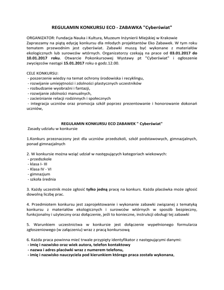 REGULAMIN KONKURSU ECO - ZABAWKA "Cyberświat" ORGANIZATOR: Fundacja Nauka i Kultura, Muzeum Inżynierii Miejskiej w Krakowie Zapraszamy na piątą edycję konkursu dla młodych projektantów Eko Zabawek. W tym roku tematem przewodnim jest cyberświat. Zabawki muszą być wykonane z materiałów ekologicznych lub surowców wtórnych. Organizatorzy czekają na prace od 03.01.2017 do 10.01.2017 roku. Otwarcie Pokonkursowej Wystawy pt "Cyberświat" i ogłoszenie zwycięzców nastąpi 15.01.2017 roku o godz.12.00. CELE KONKURSU: - poszerzenie wiedzy na temat ochrony środowiska i recyklingu, - rozwijanie umiejętności i zdolności plastycznych uczestników - rozbudzanie wyobraźni i fantazji, - rozwijanie zdolności manualnych, - zacieśnianie relacji rodzinnych i społecznych - integracja uczniów oraz promocja szkół poprzez prezentowanie i honorowanie dokonań uczniów, REGULAMIN KONKURSU ECO ZABAWEK " Cyberświat" Zasady udziału w konkursie 1.Konkurs przeznaczony jest dla uczniów przedszkoli, szkół podstawowych, gimnazjalnych, ponad gimnazjalnych 2. W konkursie można wziąć udział w następujących kategoriach wiekowych: - przedszkole - klasa I- III - Klasa IV - VI - gimnazjum - szkoła średnia 3. Każdy uczestnik może zgłosić tylko jedną pracę na konkurs. Każda placówka może zgłosić dowolną liczbę prac. 4. Przedmiotem konkursu jest zaprojektowanie i wykonanie zabawki związanej z tematyką konkursu z materiałów ekologicznych i surowców wtórnych w sposób bezpieczny, funkcjonalny i użyteczny oraz dołączenie, jeśli to konieczne, instrukcji obsługi tej zabawki 5. Warunkiem uczestnictwa w konkursie jest dołączenie wypełnionego formularza zgłoszeniowego (w załączeniu) wraz z pracą konkursową 6. Każda praca powinna mieć trwale przypięty identyfikator z następującymi danymi: - imię i nazwisko oraz wiek autora, telefon kontaktowy - nazwa i adres placówki wraz z numerem telefonu, - imię i nazwisko nauczyciela pod kierunkiem którego praca została wykonana, 7. Prace konkursowe będą ocenione na podstawie następujących kryteriów: - różnorodność wykorzystanego materiału wtórnego lub ekologicznego - tematyka zgłoszonej na konkurs pracy ma być związana z tematem przewodnim konkursu - inwencja i pomysłowość podejścia do tematu, - kreatywność autora, - wrażenie estetyczne, - możliwość wykorzystania przez osoby trzecie czyli pobawienie się zgłoszoną zabawką - staranne, funkcjonalne, trwałe i przemawiające do widzów wykonanie 8. Prace należy przekazywać osobiście lub przesyłać pocztą na adres: Muzeum Inżynierii Miejskiej w Krakowie ul. św. Wawrzyńca 15, Kraków od 03.01-10.01.2017. Terminem ostatecznym odbioru prac konkursowych będzie dzień 10.01.2017. Organizatorzy nie biorą odpowiedzialności za zniszczenia lub uszkodzenia nadesłanych prac. 9. Otwarcie wystawy pokonkursowej i ogłoszenie wyników konkursu nastąpi 15.01.2017 roku o godz. 12.00. 10. Dla dokonania oceny nadesłanych prac konkursowych zostanie powołane specjalne Jury. Decyzje Jury są ostateczne. 11. Dane uczestników konkursu będą przetwarzane przez Organizatora. Są zbierane do celów związanych z organizacją i przeprowadzeniem konkursu, w szczególności w celu publikacji listy laureatów konkursu. 12. Zgłoszenie pracy w konkursie jest równoznaczne z akceptacją klauzuli: Oświadczam, iż wyrażam zgodę na przetwarzanie i wykorzystywanie danych osobowych dla celów niniejszego konkursu, zgodnie z art. 6 ustawy z dnia 29 sierpnia 1997 roku o ochronie danych osobowych ( Dz. U. z 2002 roku nr 101, poz. 926 z późniejszymi zmianami) 13. Dostarczone prace nie podlegają zwrotowi. Nadesłane prace pozostają do dyspozycji Organizatora. Organizator zastrzega sobie prawo do wykorzystania nadesłanych prac oraz ich zdjęć do celów promocyjnych. 14. Nagrody nieodebrane w ciągu 15dni od daty ogłoszenia wyników przechodzą na własność organizatora i zostają zniszczone. 15. Nadesłanie prac na konkurs jest równoznaczne z uznaniem warunków niniejszego Regulaminu.