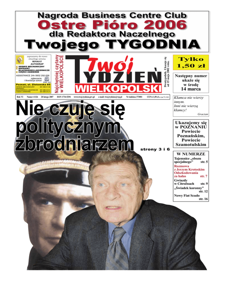 Nagroda Business Centre Club Ostre Pióro 2006 dla Redaktora Naczelnego SERWIS MECHANICZNY NAPRAWY BLACHARSKO-LAKIERNICZE CZĘŚCI ZAMIENNE ASSISTANCE 24h 0602 292-556 zgłaszanie i likwidacja szkód Poznań, ul. Złotowska 85 SERWIS MECHANICZNY NAPRAWY BLACHARSKO-LAKIERNICZE CZĘŚCI ZAMIENNE Rok VI Numer 4/126 061 868 41 09 061 868 44 61 061 868 24 27 28 lutego 2007 ISSN 1734-5294 Dwutygodnik. Ukazuje się od 15 maja 2002 roku. zapraszamy do nowo otwartego serwisu RENAULT AUTODRAP Najchętniej czytany w WIELKOPOLSCE Twojego TYGODNIA Tylko 1,50 zł Następny numer ukaże się w środę 14 marca www.twoj-tydzien.prv.pl e-mail: [email protected] Nr indeksu 373001 Nie czuję czuję si sięę politycznym zbrodniarzem CENA 1,50 zł (w tym 7% VAT) Kłamca nie wierzy innym. Inni nie wierzą kłamcy! Gracian Ukazujemy się w POZNANIU Powiecie Poznańskim, Powiecie Szamotulskim strony 3 i 6 W NUMERZE Tajemnice „obozu specjalnego” str. 5 Rozmowa z Jerzym Krotoskim Odszkodowania za hałas str. 7 Gwiazdy w Citroënach str. 9 „Świadek koronny” str. 12 Nowy Fiat Scudo str. 16 2 środa 28 lutego 2007 Bank Spółdzielczy Duszniki Nr 2/20 LUTY 2007 www.bs.duszniki.sgb.pl Bank Spółdzielczy Filia w... Poznaniu Duszniki Bank Spółdzielczy Duszniki zaprasza Klientów do swojej Filii w Poznaniu przy ulicy Wichrowej. W Poznaniu Bank z Dusznik ma jeszcze Punkty Kasowe przy Urzędzie Skarbowym Poznań-Nowe Miasto oraz przy Urzędzie Skarbowym Poznań-Winogrady. ZAWIADAMIA że w dniach od 01.03.2007r. do 05.03.2007r. odbędą się Zebrania Grup Członkowskich Tarnow o Podg órne według porządku obrad: 1. 2. 3. 4. 5. 6. 7. 8. 9. Otwarcie Zebrania oraz wybór przewodniczącego i sekretarza. Przyjęcie regulaminu Zebrania i porządku obrad. Sprawozdanie Zarządu z działalności Banku za rok 2006. Sprawozdanie z wykonania uchwał Zebrania Przedstawicieli z roku 2006. Przedstawienie programu zamierzeń Banku na rok 2007. Sprawozdanie z działalności Rady Nadzorczej Banku za rok 2006. Dyskusja, zgłoszenie wniosków i podjęcie uchwał. Wolne wnioski i pytania uczestników. Zamknięcie Zebrania. Poznań zgodnie z następującym harmonogramem: Lp. Data 1. 01.03.2007 2. 01.03.2007 3. 02.03.2007 4. 02.03.2007 5. 05.03.2007 6. 05.03.2007 Grupa Miejscowości wchodzące w skład Grupy Członkowskiej Kuślin Chraplewo, Dąbrowa, Głuponie, Kuślin, Michorzewko, Michorzewo, Śliwno, Trzcianka, Turkowo, Wąsowo Duszniki Brzoza, Ceradz Dolny, Chełminko, Duszniki, Grodziszczko, Grzebienisko, Kunowo, Mieściska, Młynkowo, Niewierz, Podrzewie, Sarbia, Sędzinko, Sędziny, Sękowo, Wierzeja, Wilczyna, Wilkowo, Zakrzewko, Zalesie oraz miejscowości, które nie należą do wymienionych Grup Członkowskich Ostroróg Bielejewo, Binino, Bobulczyn, Dobrojewo, Kluczewo, Ostroróg, Piaskowo, Rudki, Szczepankowo, Wielonek, Zapust Pniewy Białokosz, Chełmno, Chorzewo, Jakubowo, Kaczlin, Kikowo, Konin, Koninek, Koszanowo, Lubocześnica, Lubosina, Lwówek, Łowyń, Nojewo, Orliczko, Psarskie, Pniewy, Podborowo, Podpniewki, Przystanki, Psarce, Rudka, Turowo, Zajączkowo, Zamorze, Zębowo Kaźmierz Bytyń, Dolne Pole, Gaj Wielki, Gorgoszewo, Gorszewice, Kaźmierz, Kiączyn, Komorowo, Kopanina, Pólko, Radzyny, Sokolniki Małe, Wierzchaczewo, Witkowice Szamotuły Baborowo, Baborówko, Brodziszewo, Czyściec, Emilianowo, Gałowo, Gąsawy, Jastrowo, Kąsinowo, Kępa, Koźle, Krzeszkowice, Lipnica, Lulinek, Nowy Folwark, Obrzycko, Ostrolesie, Otorowo, Pamiątkowo, Piaskowo, Piotrkówko, Przecław, Przyborowo, Rudnik, Szamotuły, Szczuczyn, Śmiłowo, Twardowo, Witoldzin, Wronki Członkowska Miejsce zebrania Godzina Restauracja „Bratek” w Kuślinie Sala GCK w Dusznikach 1000 13 00 Restauracja „Dana” w Ostrorogu 1000 Restauracja „Zacisze” w Pniewach 1300 Sala GOK w Kaźmierzu 1000 Restauracja „Maryna” w Szamotułach 1300 Osoba do kontaktu: Donata Dybizbańska, tel. nr (061) 29 29 848 - 1 kwietnia 2006 roku mówi Aldona Derak, kierownik nowo otwartej Filii w Poznaniu Banku Spółdzielczego Duszniki – nasz Bank przejął obsługę klientów Urzędu Celnego w Poznaniu przy ulicy Wichrowej 4. Było to bardzo skromne, niewielkie pomieszczenie bez okien. Zarząd naszego Banku podjął decyzję o wyremontowaniu tego pomieszczenia i o powiększeniu lokalu. 1 stycznia Punkt kasowy przy Urzędzie Celnym w Poznaniu przekształcił się w Filię. Filia oferuje klientom wszystko, co oferuje Bank Spółdzielczy Duszniki. Jest szeroka gama produktów depozytowych również w walutach obcych, sporo atrakcyjnie oprocentowanych kredytów, korzystnie oprocentowane lokaty, prowadzone są rozliczenia elektroniczne, jest skup i sprzedaż waluty. Atu- tem tej poznańskiej Filii, tak przynajmniej twierdzą klienci, są korzystne opłaty za prowadzenie rachunków oszczędnościowo-rozliczeniowych i rozliczeniowych, dostęp do rachunków przez telefon stacjonarny i komórkowy, a także Internet, karty płatnicze, niskie prowizje i opłaty. W budynku Urzędu Celnego stoi bankomat Banku Spółdzielczego Duszniki i jest to bankomat kopertowy. - Bankomat kopertowy tłumaczy Justyna Jedwabna - nie tylko wypłaca pieniądze, ale także je przyjmuje. Można więc pod koniec dnia włożyć cały utarg do koperty i bankomat ją przyjmie. W tej poznańskiej filii nie ma tradycyjnych kas, takich oszklonych boksów. Są natomiast dwa stanowiska kasowe i jedno stanowisko dysponenckie. Najprawdopodobniej niebawem otwarte zostanie jeszcze jedno stanowisko kasowe. W lutym 2007 roku w Filii przy ulicy Wichrowej pracowały dwie panie: Aldona Derak – kierownik i Justyna Jedwabna na stanowisku kasjerki. Filia w Poznaniu Banku Spółdzielczego Duszniki czynna jest od poniedziałku do piątku, od godziny 7.30 do 15.30. TEMAT NUMERU środa 28 lutego 2007 3 Nie czuję się politycznym zbrodniarzem Rozmowa ze STANISŁAWEM MIKULSKIM, aktorem teatralnym i filmowym, odtwórcą roli Hansa Klossa w serialu wszech czasów „Stawka większa niż życie” Stanisław Mi