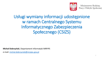 Usługi wymiany informacji udostępnione w ramach Centralnego Systemu Informatycznego Zabezpieczenia Społecznego (CSIZS) Michał Dobrzyński, Departament Informatyki MRPiPS e-mail: [email protected] 1 Usługa ePodatki (Ministerstwo Finansów) Usługa umożliwia integrację SD (Systemu Dziedzinowego) z zasobami Ministerstwa Finansów umożliwiając weryfikację informacji o dochodach podatnika. Usługa dostępna jest dla obszarów: • Fundusz Alimentacyjny (FA); • Świadczenia Rodzinne (SR); • Świadczenia Wychowawcze (SW); Usługa niedostępna dla obszaru: • Pomoc Społeczna (PS). 2 Usługa ePodatki (MF) W przypadku świadczeń uzależnionych od dochodu należy sprawdzać za pomocą usługi ePodatki wszystkie osoby (również niepełnoletnie), które wystąpiły we wniosku w składzie rodziny. Przed skorzystaniem z usługi ePodatki należy zweryfikować osoby w rejestrze PESEL. Weryfikacja taka pozwoli wyeliminować ewentualne błędy literowe lub inne w danych osób, których zapytanie dotyczy. • gdy weryfikacja w PESEL okaże się negatywna (zostaną stwierdzone nieścisłości w danych osoby weryfikowanej) powinno się wyjaśnić stan faktyczny z wnioskodawcą, jeżeli nieścisłości są np. tzw. oczywistą pomyłka pisarską, mogą zostać skorygowane. Po poprawieniu danych zalecamy ponowną weryfikacją w PESEL, aby pozyskać jak najwyższą pewność, że dane nie zawierają błędów; • w przypadku, gdy weryfikacja w PESEL da wynik pozytywny, należy przystąpić do weryfikacji danych o dochodach poprzez usługę wymiany danych z Ministerstwem Finansów. 3 Usługa ePodatki (MF) Aby zweryfikować osobę poprzez usługę ePodatki musimy mieć uzupełniony przynajmniej: • numer PESEL, imię, nazwisko; • rok podatkowy. Opcjonalnie możemy podać dane osoby (PESEL, imię, nazwisko) rozliczającej się wspólnie lub/i zaznaczyć „zapytanie specjalne” – uzyskamy wtedy informacje o dochodach powyżej progu. 4 Usługa ePodatki (MF) Przy spełnieniu warunków poprawności dane zostaną udostępnione w poniższych przypadkach: • gdy zapytanie jest indywidualne i wszystkie deklaracje są złożone jako indywidualne; • gdy zapytanie jest indywidualne i wśród złożonych deklaracji występuje deklaracja złożona wspólnie z małżonkiem; • gdy zapytanie jest o dwóch podatników i przynajmniej jedna z deklaracji jest złożona wspólnie z małżonkiem (oba podmioty występują w zapytaniu). 5 Usługa ePodatki (MF) Dane zwracane przez usługę ePodatki: Rodzaj deklaracji PIT-36 PIT-36L PIT-37 PIT-38 PIT-39 PIT-40 PIT-40A 88 i/lub 135 15 i/lub 20 66 i/lub 97 26 23 55 33 137 i/lub 138 - - - - - - 145 i/lub 146 24 99 i/lub 100 - - 57 - 192 44 126 34 29 71 42 Dochód Dochód małoletnich dzieci Składki na ubezpieczenia społeczne Podatek należny 6 Usługa ePodatki (MF) v4 Od 2017 roku została udostępniona nowa wersja usługi ePodatki (v4): • udostępniająca informacje o dochodach zagranicznych; • zwracająca nowy status w przypadku wystosowania zapytania indywidulanegow stosunku do podatnika, który faktycznie rozliczył się wspólnie z małżonkiem. 7 Usługa ePodatki (MF) v4 Obie wersje usługi (v3 i v4) będą działać równolegle jedynie do 14 lutego 2017 roku. Wszyscy Dostawcy Systemów Dziedzinowych udostępnili wersje swoich systemów obsługujących obszary FA, SR i SW, w których zaimplementowana jest nowa wersja usług ePodatki. Brak aktualizacji systemu dziedzinowego spowoduje brak możliwości korzystania z usługi ePodatki od 15 lutego 2017 roku. 8 Usługa ePodatki (MF) • 0 – zidentyfikowano osoby i udostępniono dane Powyższy status oznacza, że zostały spełnione wszystkie warunki umożliwiające przekazanie poprawnych danych, a wszystkie przekazane wartości należą wyłącznie do podatnika/podatników wskazanych w zapytaniu. • 1 – nie znaleziono osób Powyższy status oznacza, że nie została zidentyfikowana przynajmniej jedna z osób, których dotyczy zapytanie. Jeżeli zapytanie dotyczyło osób, które były pełnoletnie w roku kalendarzowym poprzedzającym okres na który ustalane jest prawo do świadczenia uzależnionego od dochodu. Należy wystąpić do Urzędu Skarbowego z pytaniem o dochody tej osoby. Zalecamy jednak, aby w przekazywanym do Urzędu Skarbowego zapytaniu podawać, że w bazie Ministerstwa Finansów nie znaleziono danych osoby, której zapytanie dotyczy. 9 Usługa ePodatki (MF) • 1 – nie znaleziono osób c.d. Zapytanie dotyczyło osób, które były niepełnoletnie w roku kalendarzowym poprzedzającym okres na który ustalane jest prawo do świadczenia uzależnionego od dochodu, a jednocześnie nie posiadają Państwo informacji z innych źródeł, że dziecko mogło mieć dochody, to należy taką odpowiedź traktować jako potwierdzającą fakt, że dziecko nie posiada dochodów. W przypadku, gdy osoba - w tym przypadku ww. dziecko - nie jest podatnikiem podatku dochodowego (w rozumieniu zakresu danych pozyskiwanych usługą wymiany danych z Ministerstwem Finansów), to tym samym osoba ta nie występuje w bazie Ministerstwa Finansów. Tym samym, w sytuacji takiej, nie ma żadnej przesłanki do wysyłania w trybie tradycyjnym zapytania do Urzędu Skarbowego. Jeżeli mają Państwo uzasadnione przesłanki pozwalające podejrzewać, że ww. dziecko jednak ma dochody, to uzasadnione jest wystąpienie do Urzędu Skarbowego z pytaniem o dochody tego dziecka. Zalecamy jednak, aby w przekazywanym do Urzędu Skarbowego zapytaniu wskazywać te przesłanki i jednocześnie podawać, że w bazie Ministerstwa Finansów nie znaleziono danych osoby, której zapytanie dotyczy. 10 Usługa ePodatki (MF) • 2 – niezgodność sposobu rozliczenia (wspólne/indywidualne) Należy pamiętać, że z uwagi na specyfikę usługi, powyższy status może wystąpić jedynie w przypadku wystosowania zapytania o dochód małżonków rozliczających się wspólnie. Status ten pojawi się w sytuacji, gdy małżonkowie wskazani w zap