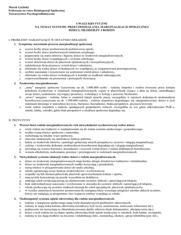 Marek Liciński Federacja na rzecz Reintegracji Społecznej Towarzystwo Psychoprofilaktyczne UWAGI KRYTYCZNE NA TEMAT SYSTEMU PRZECIWDZIAŁANIA MARGINALIZACJI SPOŁECZNEJ DZIECI, MŁODZIEŻY I RODZIN I. PROBLEMY NARASTAJĄCE W OSTATNIEJ DEKADZIE 1. Symptomy narastania procesu marginalizacji społecznej a. b. c. d. e. f. g. h. i. j. 2. wzrost liczby dzieci pozbawionych podstawowej opieki, wzrost liczby dzieci pozbawionych minimum socjalnego, pogarszanie się stanu zdrowia i higieny dzieci ze środowisk marginalizowanych, wzrost liczby dzieci wypadających z systemu szkolnego, wzrost skierowań dzieci do placówek opiekuńczych i resocjalizacyjnych, radykalizacja form przemocy wśród dzieci i młodzieży, obniżanie się wieku dzieci wchodzących we współpracę ze zorganizowaną przestępczością, szybkie narastanie i rozszerzanie się uzależnień wśród dzieci i młodzieży, obniżanie się wieku dzieci wchodzących w kontakt ze środkami odurzającymi, rozpowszechnianie się prostytucji i pornografii dziecięcej. Środowiska marginalizowane a. „stary” margines społeczny (szacowany na ok. 1.000.000 osób) – rodziny niepełne i rozbite tworzone przez kolejne pokolenia wychowane w rodzinach zmarginalizowanych, często w placówkach (żyjący z dnia na dzień, zaniedbujący swoje dzieci, uzależnieni, używający przemocy, wchodzący w kolizję z prawem, bezdomni) b. „nowy” margines - rodziny, które w ostatnich latach utraciły pracę, szczególnie w rejonach dotkniętych strukturalnym bezrobociem (szacowane na ok. 1.500.000 rodzin) – rodziny stopniowo degradujące się, marginalizowane, dzieci w tych rodzinach dorastaja w atmosferze kryzysu, bierności, bezradności, braku perspektyw, poczucia krzywdy. c. wiele rodzin wiejskich z małych, upadających gospodarstw rolnych, szczególnie ze wsi gdzie zlikwidowano PGR-y, szkoły, kluby, ośrodki, gdzie brak perspektyw a struktura społeczna degraduje się. II. PRZYCZYNY 1. Wzrost ilości rodzin marginalizowanych i ich niewydolności wychowawczej wobec dzieci. a. wiele rodzin ma trudności w zaadoptowaniu się do zmian systemu społecznego i gospodarczego, b. szybko rosną różnice społeczne i materialne, c. rozluźniają się lokalne więzi społeczne, d. znacznie zmniejszyły się opiekuńcze funkcje państwa, e. ludzie ze środowisk ubóstwa i patologii społecznej utracili perspektywy życiowe i ulegają marginalizacji, f. rodziny i środowiska dotknięte strukturalnym bezrobociem degradują się i ulegają marginalizacji, g. utrwalają się wzorce bierności, bezradności i roszczeń wśród dzieci z rodzin dotkniętych bezrobociem, h. wzrasta alkoholizm, narkomania, przemoc i przestępczość w rodzinach marginalizowanych. 2. Niewydolność systemu edukacji wobec dzieci z rodzin marginalizowanych. a. dzieci ze środowisk zmarginalizowanych mają bardzo ubogie dziedzictwo kulturowe i intelektualne, b. dzieci ze środowisk marginalizowanych rzadko korzystają z przedszkoli, c. rosną różnice w przygotowaniu dzieci do nauki szkolnej, d. szkoły ograniczają swoje funkcje środowiskowe i wychowawcze, e. rozpadły się lub skomercjalizowały placówki upowszechniania kultury i sportu, f. nauczyciele koncentrują się przede wszystkim na dydaktyce, g. rankingi szkół zwiększają presję na eliminowanie uczniów słabych i sprawiających kłopoty, h. brak indywidualizacji nauczania i wychowania w stosunku do uczniów słabych i sprawiających kłopoty, i. szkoły pozbywają się uczniów trudnych (kierują do szkół specjalnych, placówek opiekuńczych), j. w wyniku zaniżonych kryteriów promowania do następnej klasy wzrastają zaległości szkolne słabych uczniów, którzy nie nadążają za programem i bez wsparcia rodziny wypadają ze szkoły. 3. Niedostępność systemu opieki zdrowotnej dla rodzin marginalizowanych. a. rodziny z marginesu społecznego mają wiele dramatycznych problemów zdrowotnych, b. rodziny te mają niską kulturę zdrowotną (niezdrowy tryb życia, uzależnienia, nieleczone schorzenia itd.), c. praktycznie nie korzystają ze zbiurokratyzowanej służby zdrowia (brak dokumentów, ubezpieczenia itp.), d. dzieci z tych rodzin nie są objęte opieką zdrowotną (brak opieki medycznej w szkołach, brak badań, szczepień), e. rodziny te nie mają środków na leczenie i rehabilitację (leki, stomatolog, okulary, sprzęt rehabilitacyjny itd.). -24. Niewydolność systemu pomocy społecznej wobec rodzin marginalizowanych. a. znaczne ograniczenie świadczeń pozaobligatoryjnych, b. przewaga biernych form pomocy społecznej, brak środowiskowej pracy socjalnej, c. brak praktycznych umiejętności motywowania rodzin dysfunkcyjnych do zmiany, d. brak praktycznych umiejętności pracy socjalnej z rodzinami dysfunkcyjnymi, e. znaczna arbitralność, dyrektywność, częsta arogancja w kontakcie z rodzinami marginalizowanymi, f. kierowanie dzieci do stacjonarnych placówek opiekuńczych z powodu biedy w rodzinie naturalnej, g. kierowanie dzieci sprawiających problemy wychowawcze do stacjonarnych placówek opiekuńczych przed dostatecznym wykorzystaniem możliwości wsparcia rodziny dysfunkcyjnej w środowisku, h. niedostatki pracy Centrów Pomocy Rodzinie: - częste obsadzanie stanowisk z klucza politycznego, - niskie kwalifikacje zawodowe i małe doświadczenie praktyczne pracowników, - zbytnie zbiurokratyzowanie, ignorancja i arogancja urzędników, - częste konflikty, arbitralność, brak partnerstwa i współpracy ze środowiskiem zawodowym, - rozbudowywanie „własnego” sektora publicznego i dyskryminowanie organizacji pozarządowych, - zbiurokratyzowanie systemu kierowania dzieci do placówek i rodzin zastępczych, - narzucenie systemu oceny i kontroli, który kreuje fikcyjną statystykę, - brak zróżnicowanych kryteriów oceny i finansowania placówek środowiskowych (fikcyjna statystyka), - nastawienie na ilość a nie jakość usług, brak oceny efektywności. 5. Ograniczenia pracy Sąd
