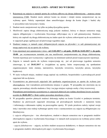 REGULAMIN - SPORT DO WYBORU 1. Rejestracja na zajęcia w ramach sportu do wyboru odbywa się drogą elektroniczną – poprzez stronę internetową CSiR. Student może założyć konto na stronie i dzięki niemu zarejestrować się na wybrany sport. Należy zapamiętać dane umożliwiające dostęp do konta (login i hasło) aby w przyszłości móc korzystać z konta. 2. Student może zarejestrować się tylko na jedną dyscyplinę sportu. 3. Możliwość zapisu drogą elektroniczną mają jedynie studenci, którzy w danym semestrze mają zajęcia obligatoryjne z wychowania fizycznego odbywające się w sali gimnastycznej. Studenci, którzy nie zapisali się drogą elektroniczną na żaden sport do wyboru zobowiązani są do uczestnictwa w zajęciach grupy ogólnej już od pierwszego tygodnia zajęć. 4. Studenci mający w ramach zajęć obligatoryjnych zajęcia na pływalni i w sali gimnastycznej nie mogą zapisywać się na sporty do wyboru. 5. Czas rejestracji jest ograniczony i trwa - od 13.02.2017 r. od godz. 10:00 do 24.02.2017 r. do godz. 10:00 po wyznaczonym terminie nie ma możliwości zarejestrowania się drogą elektroniczną. Termin rejestracji jest wyznaczony i ogłoszony na minimum tydzień przed rozpoczęciem rejestracji. 6. Zajęcia w ramach sportu do wyboru rozpoczynają się już od pierwszego tygodnia semestru zimowego, tj. od 20.02.2017 r. (wyjątkiem są sporty, które rozpoczynają się spotkaniem organizacyjnym: tenis ziemny, narciarstwo, turystyka rowerowa, turystyka piesza, turystyka kajakowa). 7. W razie wolnych miejsc, studenci mogą zapisać się osobiście, bezpośrednio u prowadzących przed zajęciami lub na dyżurze. 8. Uczestnictwo na pierwszych zajęciach lub spotkaniu organizacyjnym ze sportu do wyboru jest obowiązkowe. Jest warunkiem potwierdzenia miejsca w grupie. W przypadku nie stawienia się na zajęcia, prowadzący skreśla studenta z listy i na jego miejsce wpisuje osoby z listy rezerwowej. Warunkiem potwierdzenia uczestnictwa w zajęciach płatnych jest wpłata określonej kwoty na konto uczelni do 28.02.2017 r. Brak wpłaty powoduje skreślenie z listy. 9. W przypadku sportów płatnych studenci dokonują wpłaty na konto Uczelni w podanym terminie. Studenci na pierwszych zajęciach otrzymują od prowadzących karteczki z numerem konta i informacją o dokonaniu wpłaty na poszczególne sporty. W tytule przelewu należy wpisać swoje imię i nazwisko oraz rodzaj wybranego sportu wraz z zaznaczeniem czy zajęcia są obligatoryjne czy fakultatywne. (- zajęcia obligatoryjne – tzn. obowiązkowe, student w danym semestrze ma w programie studiów obowiązkowe zajęcia z wychowania fizycznego i w ramach nich uczęszcza na wybrany przez siebie sport do wyboru. - zajęcia fakultatywne – zajęcia, na które student uczęszcza dodatkowo, w danym semestrze nie ma w programie studiów obowiązkowych zajęć z wychowania fizycznego). 10. Listy rezerwowe tworzy nauczyciel prowadzący, studenci mogą wpisywać się na dyżurze prowadzącego lub bezpośrednio przed zajęciami. 11. Student może zrezygnować z wybranego przez siebie sportu i przepisać się na inny – w przypadku wolnych miejsc - po odbyciu pierwszych zajęć, lub wrócić do swojej grupy ogólnej z zajęć wychowania fizycznego. Po upływie 2 tygodni nie ma możliwości zmiany grup. 12. W przypadku nieuzasadnionej rezygnacji z wybranych zajęć płatnych koszty poniesione przez studentów nie będą zwracane. 13. Nieobecności na zajęciach ze sportu do wyboru studenci mogą odrabiać w grupach ogólnych wychowania fizycznego. Nie ma możliwości odrabiania zajęć na innych zajęciach w ramach sportu do wyboru. 14. W przypadku sportu do wyboru – pływanie oraz aqua aerobik - konieczne jest uczestnictw w 7 zajęciach w sali gimnastycznej z grupą ogólną, do której przypisany jest student (7 x 1,5 godz.).