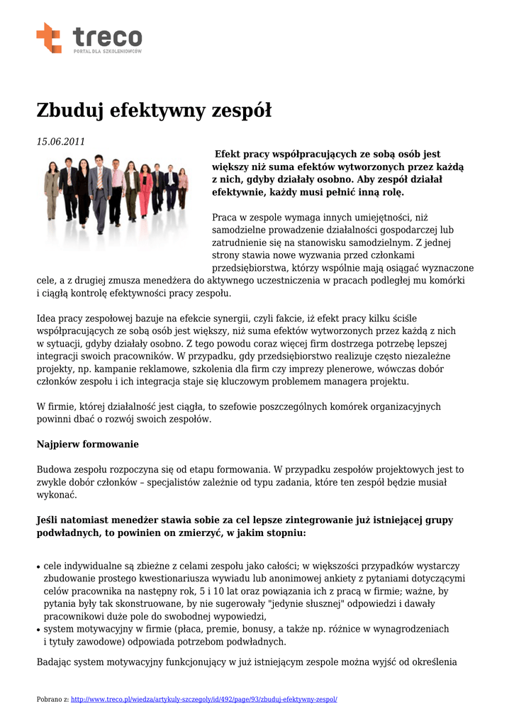 Zbuduj efektywny zespół 15.06.2011 Efekt pracy współpracujących ze sobą osób jest większy niż suma efektów wytworzonych przez każdą z nich, gdyby działały osobno. Aby zespół działał efektywnie, każdy musi pełnić inną rolę. Praca w zespole wymaga innych umiejętności, niż samodzielne prowadzenie działalności gospodarczej lub zatrudnienie się na stanowisku samodzielnym. Z jednej strony stawia nowe wyzwania przed członkami przedsiębiorstwa, którzy wspólnie mają osiągać wyznaczone cele, a z drugiej zmusza menedżera do aktywnego uczestniczenia w pracach podległej mu komórki i ciągłą kontrolę efektywności pracy zespołu. Idea pracy zespołowej bazuje na efekcie synergii, czyli fakcie, iż efekt pracy kilku ściśle współpracujących ze sobą osób jest większy, niż suma efektów wytworzonych przez każdą z nich w sytuacji, gdyby działały osobno. Z tego powodu coraz więcej firm dostrzega potrzebę lepszej integracji swoich pracowników. W przypadku, gdy przedsiębiorstwo realizuje często niezależne projekty, np. kampanie reklamowe, szkolenia dla firm czy imprezy plenerowe, wówczas dobór członków zespołu i ich integracja staje się kluczowym problemem managera projektu. W firmie, której działalność jest ciągła, to szefowie poszczególnych komórek organizacyjnych powinni dbać o rozwój swoich zespołów. Najpierw formowanie Budowa zespołu rozpoczyna się od etapu formowania. W przypadku zespołów projektowych jest to zwykle dobór członków – specjalistów zależnie od typu zadania, które ten zespół będzie musiał wykonać. Jeśli natomiast menedżer stawia sobie za cel lepsze zintegrowanie już istniejącej grupy podwładnych, to powinien on zmierzyć, w jakim stopniu: ● ● cele indywidualne są zbieżne z celami zespołu jako całości; w większości przypadków wystarczy zbudowanie prostego kwestionariusza wywiadu lub anonimowej ankiety z pytaniami dotyczącymi celów pracownika na następny rok, 5 i 10 lat oraz powiązania ich z pracą w firmie; ważne, by pytania były tak skonstruowane, by nie sugerowały "jedynie słusznej" odpowiedzi i dawały pracownikowi duże pole do swobodnej wypowiedzi, system motywacyjny w firmie (płaca, premie, bonusy, a także np. różnice w wynagrodzeniach i tytuły zawodowe) odpowiada potrzebom podwładnych. Badając system motywacyjny funkcjonujący w już istniejącym zespole można wyjść od określenia Pobrano z: http://www.treco.pl/wiedza/artykuly-szczegoly/id/492/page/93/zbuduj-efektywny-zespol/ poziomu zaspokojenia poszczególnych potrzeb w hierarchii Maslowa (fizjologicznych, bezpieczeństwa, przynależności i przyjaźni, szacunku oraz samorealizacji). Następnie warto zapytać o konkretne elementy wynagrodzenia za wykonaną pracę, szanse awansu i rozwoju, a w końcu o to, jak pracownicy oceniają możliwość zaspokojenia swoich potrzeb poprzez pracę w firmie. Wysokość wynagrodzenia w danym momencie nie zawsze musi być dla pracownika najważniejszym bodźcem do efektywnej pracy. Na etapie formowania zespołu, menedżer powinien wiedzieć, że aby jego zespół sprawnie radził sobie z zadaniami, musi się składać z osób pełniących różne role zespołowe Będzie tam na pewno pomysłodawca. Taka osoba opiera się głównie na wyobraźni i niestandardowemu podejściu do problemu. To ona wysuwa nowe, czasami zupełnie nierealne pomysły, lubi pracować indywidualnie i niezbyt liczy się ze zdaniem co bardziej praktycznych członków zespołu. Nie wolno mu jednak zabronić tworzyć, bo choć nigdy nie doprowadza pomysłu do końca, jest efektywnym generatorem nowych pomysłów. Bez niego nie miałaby zajęcia osoba zajmująca się rozwijanie pozornie trudnych do wykonania idei projektant. To drugi członek zespołu, prawie zawsze chętnie poszukiwany przez managerów. Analizuje problem, proponuje usprawnienia, szuka nowych dróg do celu. Ważny kontroler Z pomysłodawcą i projektantem ściśle współpracuje kontroler. Choć te osoby często różnią się poglądami, kontroler jest po to, by zespół nie zaczął wdrażać idei mających duże niedociągnięcia. Kontroler często nie jest lubiany przez managera, ponieważ wszystkim wydaje się, że swoimi krytycznymi uwagami i wynajdowaniem problemów rzuca zespołowi kłody pod nogi. Ale jeśli czwarty członek zespołu – praktyczny realizator – ma zacząć działać, uwagi kontrolera są niezbędne. Praktyczny realizator to świetny wykonawca, ale sam nie wiele wnosi od siebie. Jeśli zadanie jest trudne, manager powinien zadbać, by praktycznych realizatorów było w zespole jak najwięcej. To oni ciągną robotę do przodu, bez narzekania i zbędnych dygresji. Piąta rola zespołowa to perfekcjonista – jeśli praktycznym realizatorom nie starcza sil na szczegóły, on jest niezastąpiony. Potrafi wyszukać najmniejszy błąd w kodzie programu komputerowego albo zadbać o trudno dostępne informacje o klientach. Szósta osoba to dusza zespołu (towarzystwa). Bez niej zespół byłby tylko dobrze skonstruowaną maszyną, której części nie mogą się poruszać. Dusza zespołu powoduje, że jego członkowie spotykają się poza miejscem pracy, wspólnie obchodzą imieniny i się bawią. Jej rola to także łagodzenie konfliktów i zapewnienie pozytywnej atmosfery w czasie pracy. Po etapie formowania zespół wchodzi zwykle w fazę burzliwego ustalania norm postępowania, procedur, celów na następne miesiące i planów, by je zrealizować. Na tym etapie głównym zadaniem menedżera zespołu jest złagodzenie konfliktów na tle odpowiedzialności za efekty pracy i podjęte decyzje. Musi on również dbać o motywację członków zespołu. Jeśli nie mają oni przymusu wzajemnej współpracy, np. zakładają nowe przedsiębiorstwo, część z nich może szybko stracić Pobrano z: http://www.treco.pl/wiedza/artykuly-szczegoly/id/492/page/93/zbuduj-efektywny-zespol/ motywację i tak jak w przypadku nauki j