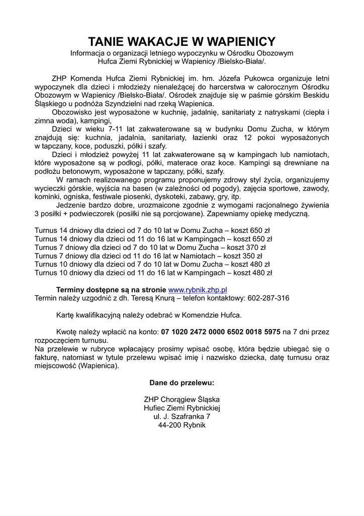 TANIE WAKACJE W WAPIENICY Informacja o organizacji letniego wypoczynku w Ośrodku Obozowym Hufca Ziemi Rybnickiej w Wapienicy /Bielsko-Biała/. ZHP Komenda Hufca Ziemi Rybnickiej im. hm. Józefa Pukowca organizuje letni wypoczynek dla dzieci i młodzieży nienależącej do harcerstwa w całorocznym Ośrodku Obozowym w Wapienicy /Bielsko-Biała/. Ośrodek znajduje się w paśmie górskim Beskidu Śląskiego u podnóża Szyndzielni nad rzeką Wapienica. Obozowisko jest wyposażone w kuchnię, jadalnię, sanitariaty z natryskami (ciepła i zimna woda), kampingi, Dzieci w wieku 7-11 lat zakwaterowane są w budynku Domu Zucha, w którym znajdują się: kuchnia, jadalnia, sanitariaty, łazienki oraz 12 pokoi wyposażonych w tapczany, koce, poduszki, półki i szafy. Dzieci i młodzież powyżej 11 lat zakwaterowane są w kampingach lub namiotach, które wyposażone są w podłogi, półki, materace oraz koce. Kampingi są drewniane na podłożu betonowym, wyposażone w tapczany, półki, szafy. W ramach realizowanego programu proponujemy zdrowy styl życia, organizujemy wycieczki górskie, wyjścia na basen (w zależności od pogody), zajęcia sportowe, zawody, kominki, ogniska, festiwale piosenki, dyskoteki, zabawy, gry, itp. Jedzenie bardzo dobre, urozmaicone zgodnie z wymogami racjonalnego żywienia 3 posiłki + podwieczorek (posiłki nie są porcjowane). Zapewniamy opiekę medyczną. Turnus 14 dniowy dla dzieci od 7 do 10 lat w Domu Zucha – koszt 650 zł Turnus 14 dniowy dla dzieci od 11 do 16 lat w Kampingach – koszt 650 zł Turnus 7 dniowy dla dzieci od 7 do 10 lat w Domu Zucha – koszt 370 zł Turnus 7 dniowy dla dzieci od 11 do 16 lat w Namiotach – koszt 350 zł Turnus 10 dniowy dla dzieci od 7 do 10 lat w Domu Zucha – koszt 480 zł Turnus 10 dniowy dla dzieci od 11 do 16 lat w Kampingach – koszt 480 zł Terminy dostępne są na stronie www.rybnik.zhp.pl Termin należy uzgodnić z dh. Teresą Knurą – telefon kontaktowy: 602-287-316 Kartę kwalifikacyjną należy odebrać w Komendzie Hufca. Kwotę należy wpłacić na konto: 07 1020 2472 0000 6502 0018 5975 na 7 dni przez rozpoczęciem turnusu. Na przelewie w rubryce wpłacający prosimy wpisać osobę, która będzie ubiegać się o fakturę, natomiast w tytule przelewu wpisać imię i nazwisko dziecka, datę turnusu oraz miejscowość (Wapienica). Dane do przelewu: ZHP Chorągiew Śląska Hufiec Ziemi Rybnickiej ul. J. Szafranka 7 44-200 Rybnik