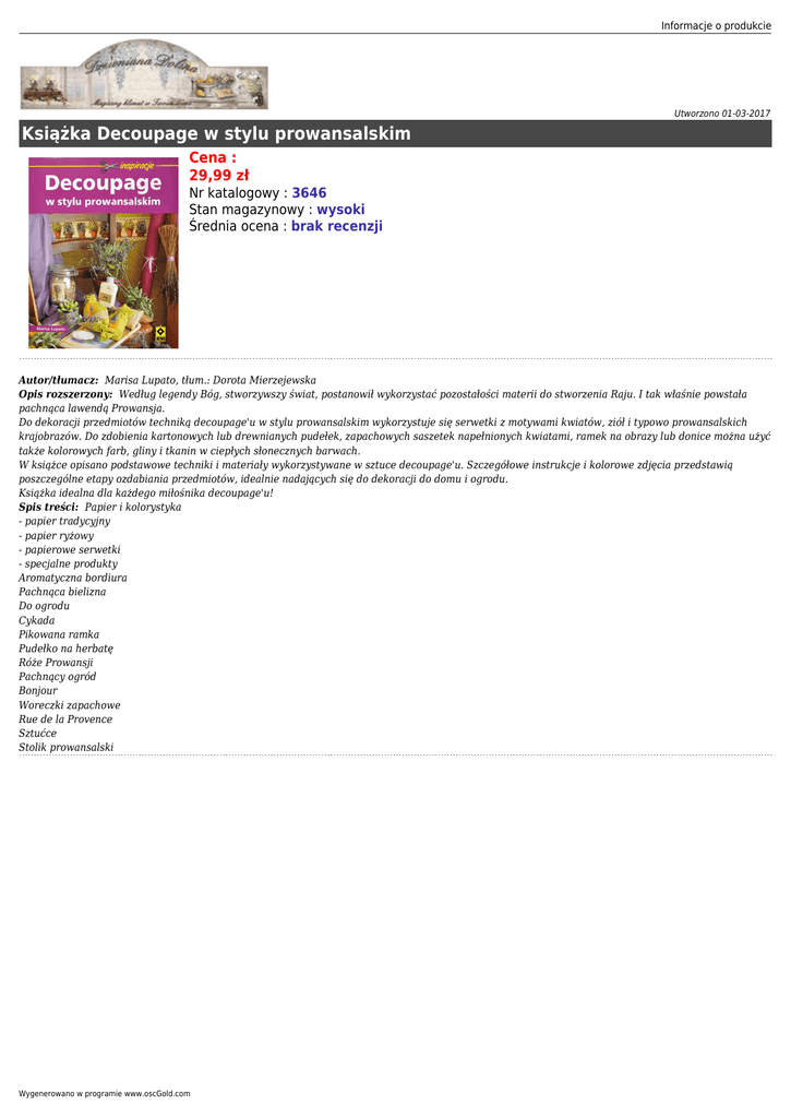 Informacje o produkcie Utworzono 01-03-2017 Książka Decoupage w stylu prowansalskim Cena : 29,99 zł Nr katalogowy : 3646 Stan magazynowy : wysoki Średnia ocena : brak recenzji Autor/tłumacz: Marisa Lupato, tłum.: Dorota Mierzejewska Opis rozszerzony: Według legendy Bóg, stworzywszy świat, postanowił wykorzystać pozostałości materii do stworzenia Raju. I tak właśnie powstała pachnąca lawendą Prowansja. Do dekoracji przedmiotów techniką decoupage'u w stylu prowansalskim wykorzystuje się serwetki z motywami kwiatów, ziół i typowo prowansalskich krajobrazów. Do zdobienia kartonowych lub drewnianych pudełek, zapachowych saszetek napełnionych kwiatami, ramek na obrazy lub donice można użyć także kolorowych farb, gliny i tkanin w ciepłych słonecznych barwach. W książce opisano podstawowe techniki i materiały wykorzystywane w sztuce decoupage'u. Szczegółowe instrukcje i kolorowe zdjęcia przedstawią poszczególne etapy ozdabiania przedmiotów, idealnie nadających się do dekoracji do domu i ogrodu. Książka idealna dla każdego miłośnika decoupage'u! Spis treści: Papier i kolorystyka - papier tradycyjny - papier ryżowy - papierowe serwetki - specjalne produkty Aromatyczna bordiura Pachnąca bielizna Do ogrodu Cykada Pikowana ramka Pudełko na herbatę Róże Prowansji Pachnący ogród Bonjour Woreczki zapachowe Rue de la Provence Sztućce Stolik prowansalski Wygenerowano w programie www.oscGold.com