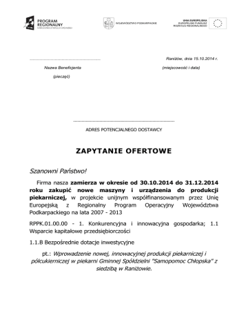 UNIA EUROPEJSKA EUROPEJSKI FUNDUSZ ROZWOJU REGIONALNEGO WOJEWÓDZTWO PODKARPACKIE …………………………………………… Nazwa Beneficjenta Raniżów, dnia 15.10.2014 r. (miejscowość i data) (pieczęć) ......................................................................... ADRES POTENCJALNEGO DOSTAWCY ZAPYTANIE OFERTOWE Szanowni Państwo! Firma nasza zamierza w okresie od 30.10.2014 do 31.12.2014 roku zakupić nowe maszyny i urządzenia do produkcji piekarniczej, w projekcie unijnym współfinansowanym przez Unię Europejską z Regionalny Program Operacyjny Województwa Podkarpackiego na lata 2007 - 2013 RPPK.01.00.00 - 1. Konkurencyjna i innowacyjna gospodarka; 1.1 Wsparcie kapitałowe przedsiębiorczości 1.1.B Bezpośrednie dotacje inwestycyjne pt.: Wprowadzenie nowej, innowacyjnej produkcji piekarniczej i półcukierniczej w piekarni Gminnej Spółdzielni "Samopomoc Chłopska" z siedzibą w Raniżowie. Jeżeli chcą Państwo przedstawić nam swoją ofertę handlową w odpowiedzi na niniejsze zapytanie ofertowe prosimy podać w niej, jak następuje: Czy jesteście Państwo w stanie dostarczyć nam określone poniżej maszyny i urządzenia w okresie realizacji naszego projektu ? 1. Podać ceny netto wyspecyfikowanych poniżej maszyn i urządzeń. Preferowane będą urządzenia, których cena będzie najniższa najbardziej konkurencyjna. 2. Podać specyfikację techniczną oferowanych maszyn i urządzeń. Preferowane będą urządzenia, jak najbardziej adekwatne do niżej podanych parametrów technicznych maszyn i urządzeń, które ustalono w relacji do potrzeb procesu produkcyjnego oraz stosowanej technologii produkcji w naszej piekarni. Załączenie dodatkowych dokumentów uwierzytelniających poziom jakości oferowanych maszyn, jak: deklaracje zgodności z dyrektywami UE, patenty, certyfikaty jakości (dotyczące wyłącznie oferowanych maszyn i urządzeń) będą dodatkowym atutem. 3. Podać świadczenia serwisowe, które Państwo zapewniacie względem wyspecyfikowanych maszyn i urządzeń (w tym: w okresie gwarancyjnym, jak i pogwarancyjnym). Preferowane będą urządzenia dla których dostawca (producent) zapewnia najdłuższy okres gwarancyjny i bogate świadczenia serwisowe. 4. Uwiarygodnić istnienie firmy na rynku, jej solidność i zaufanie wśród klientów, załączając: opinie i referencje klientów, certyfikaty jakości wystawione na Państwa firmę, podając datę założenia firmy i jej istnienia na rynku. 2 Należy zapewnić okres ważności Państwa oferty, zwłaszcza cen, do końca procesu inwestycyjnego, tj. co najmniej do 31-12-2014 roku. Złożyć czytelny i opatrzony imienną pieczęcią podpis kompetentnej osoby. W miarę możliwości prosimy załączyć ofertę handlową (katalogi, cenniki). Na Państwa pisemną ofertę oczekujemy do dnia 29.10.2014 rok. W załączeniu opis techniczny zakupywanych maszyn i urządzeń. Z poważaniem: ............................................................................... podpis i pieczęć imienna współwłaściciela ...................................................................... pieczęć firmowa 3 Planujemy zakupić nowe maszyny i urządzenia, na rynku krajowym: 1) Miesiarka spiralna o pojemności dzież 300 litr (z jedną dzieżą w komplecie) 1 szt. Dwie prędkości obrotów spirali, zmiana od niskich do wysokich prędkości odbywa się automatycznie. Automatyczny panel sterujący z wyświetlaczem LCD pozwala programować cykle pracy (czas i intensywność miesienia). Hydrauliczna głowica ze spiralą podnoszona jest i opuszczana w dowolnym czasie. Jest to nowoczesne urządzenie, przeznaczone do mieszania różnych rodzajów ciast, w którym technologia mieszania łączy się z podnoszeniem ciasta przez spiralne miesidło, co napowietrza ciasto (czego nie zapewni żadna miesiarka widelcowa). Spulchnienie i dobre napowietrzenie ciasta jest szczególnie istotne w nowej produkcji, aby ciasto dobrze sfermentowało w komorze garowniczej przed procesem formowania i wypieku. Obecnie nie posiadamy takiego urządzenia. 2) Dzieże wyjezdne, współpracujące z miesiarka spiralną o pojemności 300 litr 3 szt. Rozwiązania konstrukcyjne dzież powodują, że mogą one współpracować jedynie z miesiarka określonego typu. Spiralne miesidło miesza ciasto, nawet przy niewielkim zapełnieniu dzieży (minimum 5%), a ich niski profil nie powoduje przegrzania ciasta (brak konieczności przerywania cyklu mieszania). Dodatkowe dzieże są konieczne dla prowadzenia produkcji zróżnicowanego asortymentu, w tym samym czasie. 3) Mikser spiralny z wyjmowalną dzieżą o pojemności dzieży 50 litrów 1 szt. Mały mikser spiralny konieczny jest do miesienia krótkich partii produkcji dla wymieszania ciast, zaczynów, które w małej ilości nie mogłyby być miesione przez dużą mieszarkę o pojemności dzieży 300 litrów. Dane techniczne: prędkość obrotowa do 100 obr./min., moc 2 kW, zasilanie 400 V. Obecnie nie posiadamy takiego urządzenia. 4) Rogalikarka 1 szt. Przeznaczona do walcowania i zawijania dowolnego rodzaju ciasta. Cechuje się dużą niezawodnością i łatwością w obsłudze. Zaletą tych maszyn jest możliwość zastosowania ich do produkcji szerokiej gamy wyrobów, w zakresie wagowym kęsa ciasta od 20 do 450 gram. Grubość formowanych kęsów oraz ilość zwojów regulowana jest bezstopniowo. Pozwoli nam wyprodukować: standardowe rogale z różnych ciast, zwijane bułeczki o różnych kształtach, nadziewane po wypieku słodkimi masami, bagietki itp. Obecnie nie posiadamy takiego urządzenia. 5) Dzielarko - zaokrąglarka do bułek, automat 1szt. Przeznaczona do dzielenia i kształtowania ciasta bułkowego oraz drobnych ciast półcukierniczych, gdzie obróbka ciasta musi dokonywać się szybko, automatycznie i precyzyjnie. 4 Zakres wagowy kęsów od 40 do 135 gram. W kilka sekund dzieli ciasto i zaokrągla drobne kęsy na 30 równych, nie da się zastąpić pracą ręczną w przypadku