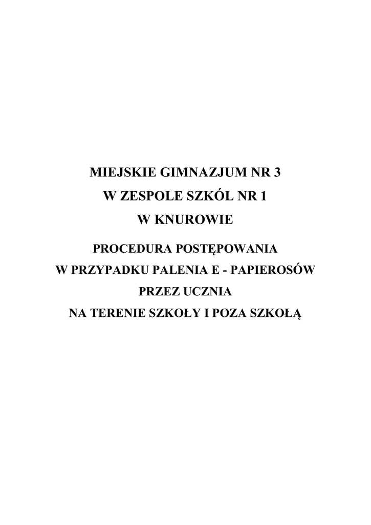 MIEJSKIE GIMNAZJUM NR 3 W ZESPOLE SZKÓL NR 1 W KNUROWIE PROCEDURA POSTĘPOWANIA W PRZYPADKU PALENIA E - PAPIEROSÓW PRZEZ UCZNIA NA TERENIE SZKOŁY I POZA SZKOŁĄ E-papieros prowadzi do uzależniania na różnych poziomach – fizycznym, psychicznym i społecznym (załącznik do Procedury) 1. W przypadku stwierdzenia przez nauczyciela lub innego pracownika szkoły faktu palenia e-papierosów przez ucznia, należy: a) powiadomić wychowawcę klasy, b) wpisać uwagę o wyżej wymienionym fakcie w dzienniku lekcyjnym, c) powiadomić rodziców/prawnych opiekunów o zaistniałej sytuacji, d) zatrzymać e-papierosa do osobistego odbioru przez rodziców/prawnych opiekunów. 2. W przypadku ponownego łamania zasad - udzielenie pisemnej nagany wychowawcy i zawiadomienie o niej rodziców. 3. Kolejne wykroczenie ucznia dotyczące palenia e-papierosów skutkuje naganą dyrektora szkoły i obniżeniem semestralnej/rocznej oceny z zachowania. 4. Jeśli kary ujęte w punktach 1 – 3 nie przyniosą rezultatu, wówczas uczeń może być decyzją Rady Pedagogicznej przeniesiony do innego oddziału. Procedura obowiązuje od roku szkolnego 2014/15 Załącznik E-papierosy Francuscy naukowcy wzięli pod lupę 10 różnych rodzajów e-papierosów. Badania przeprowadzane były pod kątem zawartości toksycznych substancji, dla samego palacza, jak i dla osób w jego otoczeniu. Wyniki okazały się zaskakujące. Z dziesięciu testowanych urządzeń, co najmniej trzy z nich były tak samo rakotwórcze jak ich tradycyjni – tytoniowi odpowiednicy – znaleziono w nich m.in. formaldehyd – substancje silnie trującą. Co ważne, bierni palacze e-papierosów, tak samo są narażeni na szkodliwość ich działania – jak w przypadku normalnych papierosów. Dlatego, naukowcy apelują o wprowadzenie zakazu palenia elektronicznych urządzeń w miejscach publicznych. Naukowcy zwracają uwagę na jeszcze jedno zagrożenie, idące za e-papierosem. Elektroniczny zamiennik ma w sobie płynną nikotynę, która jest szalenie niebezpieczna w kontakcie ze skórą, czy przełykiem. Dlatego nawołują wszystkich użytkowników tego urządzenia, aby płynną nikotynę, przetrzymywali w miejscach niedostępnych dla dzieci. Mit nr 1: E-papieros pomaga zerwać z nikotynowym nałogiem Koronnym argumentem wielbicieli puszczania "elektronicznego dymka" jest to, że to po prostu świetna terapia pozwalająca wyzwolić się z nałogu. Prawda jest trochę inna. Elektroniczne papierosy mogą zawierać dwukrotnie większą dawkę nikotyny niż np. popularny w terapii antynikotynowej inhalator. Nawet w tych reklamowanych jako "beznikotynowe" albo "mentolowe" znajdują się spore dawki szkodliwej nikotyny. Mit nr 2: E-papieros nie uzależnia To, że paląc e-papierosa możemy się obejść od tej klasycznej wersji nie oznacza, że nie jesteśmy uzależnieni od nikotyny. "Dymiące długopisy" zawierające nikotynę silnie uzależniają. Mit nr 3: E-papieros nie powoduje problemu biernego palenia Przy spalaniu tytoniu powstaje silnie rakotwórcza substancja nitrozoamina, której szkodliwość jest bezsprzeczna. Niektórzy producenci e-papierosów dodają do wkładów podobną esencję, która potem wydychana jest przez użytkownika w postaci pary wodnej. Ryzyko zachorowania biernych palaczy jest mniejsze niż w przypadku papierosów, ale większe niż gdyby w ogóle pary z e-papierosa nie wdychali. Mitr nr 4: E-papieros nie szkodzi zdrowiu palacza Zawiera nikotynę więc szkodzi. Lista możliwych dolegliwości jest długa, począwszy od zawrotów głowy i bólu mięśni, przez arytmię serca i nadciśnienie, skończywszy na trwałych uszkodzeniach mózgu i ataku serca.