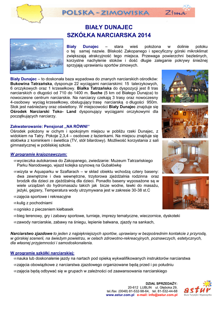 BIAŁY DUNAJEC SZKÓŁKA NARCIARSKA 2014 Biały Dunajec – stara wieś położona w dolinie potoku o tej samej nazwie. Bliskość Zakopanego i specyficzny górski mikroklimat zwiększają atrakcyjność tego miejsca. Przewaga powierzchni bezleśnych, korzystne nachylenie stoków i dość długie zaleganie pokrywy śnieżnej sprzyjają uprawianiu sportów zimowych. Biały Dunajec – to doskonała baza wypadowa do znanych narciarskich ośrodków: Bukowina Tatrzańska, dysponuje 22 wyciągami narciarskimi: 15 talerzykowych, 6 orczykowych oraz 1 krzesełkowy. Białka Tatrzańska do dyspozycji jest 8 tras narciarskich o długości od 710 do 1400 m. Suche (5 km od Białego Dunajca) to nowoczesne centrum narciarskie. Na narciarzy czekają 3 trasy oraz nowoczesny 4-osobowy wyciąg krzesełkowy, obsługujący trasę narciarską o długości 950m. Stok jest naśnieżany oraz oświetlony. W miejscowości Biały Dunajec znajduje się Ośrodek Narciarski Toko- Land dysponujący wyciągami orczykowymi dla początkujących narciarzy. Zakwaterowanie: Pensjonat ,,NA RÓWNI’’ Ośrodek położony w cichym i spokojnym miejscu w pobliżu rzeki Dunajec, z widokiem na Tatry. Pokoje 2,3,4 – osobowe z łazienkami. Na miejscu znajduje się stołówka z kominkiem i świetlica (TV, stół bilardowy). Możliwość korzystania z sali gimnastycznej w pobliskiej szkole. W programie krajoznawczym: • wycieczka autokarowa do Zakopanego, zwiedzanie: Muzeum Tatrzańskiego Parku Narodowego, wjazd kolejka szynową na Gubałówkę • wizyta w Aquaparku w Szaflarach – w skład obiektu wchodzą cztery baseny: dwa zewnętrzne i dwa wewnętrzne, trzytorowa zjeżdżalnia rodzinna oraz brodzik dla dzieci ze zjeżdżalnią dla dzieci. Ponadto baseny wyposażone są w wiele urządzeń do hydromasażu takich jak bicze wodne, ławki do masażu, jeżyki, gejzery, Temperatura wody utrzymywana jest w zakresie 30-38 st.C • zajęcia sportowe i rekreacyjne • kulig z pochodniami • ognisko z pieczeniem kiełbasek • bieg terenowy, gry i zabawy sportowe, turnieje, imprezy tematyczne, wieczornice, dyskoteki • zawody narciarskie, zabawy na śniegu, lepienie bałwana, zjazdy na sankach, Narciarstwo zjazdowe to jeden z najpiękniejszych sportów, uprawiany w bezpośrednim kontakcie z przyrodą, w górskiej scenerii, na świeżym powietrzu, w celach zdrowotno-rekreacyjnych, poznawczych, estetycznych, dla własnej przyjemności i samodoskonalenia. W programie szkółki narciarskiej: • nauka lub doskonalenie jazdy na nartach pod opieką wykwalifikowanych instruktorów narciarstwa • zajęcia obowiązkowe z narciarstwa zjazdowego organizowane będą przed i po południu • zajęcia będą odbywać się w grupach w zależności od zaawansowania narciarskiego DZIAŁ SPRZEDAŻY: 20-612 LUBLIN ul. Głęboka 29, tel./fax (0048) 81-532-98-64, tel. 81-532-44-68 www.astur.com.pl e-mail: [email protected] Cele szkółki narciarskiej: • poznanie zasad doboru sprzętu i ekwipunku narciarskiego • zdobycie umiejętności jazdy na nartach w stopniu średnim • poznanie zasad bezpiecznego poruszania się na stoku • poznanie osobliwości przyrody, relaksu i autentycznego odpoczynku psychicznego • integracja grupy, poprawianie stosunków interpersonalnych w grupie TERMIN: CENA: 18.01-25.01.2014 1 050 zł W cenie: ♦ transport autokarem Lux ♦ zakwaterowanie: 7 noclegów ♦ wyżywienie: 4 posiłki dziennie + prowiant na drogę ♦ ubezpieczenie NNW, ubezpieczenie OC na stoku ♦ realizacja programu ♦ opieka pedagogiczna, ♦ opieka medyczna na miejscu ♦ instruktor narciarski Co zabrać ze sobą: − narty, buty narciarskie, kijki, kask (obowiązkowy na stoku) − strój kąpielowy − legitymacja szkolna − spodnie i bluzy sportowe (ubiór narciarski) − ciepłe ubranie zimowe − obuwie sportowe ISTNIEJE MOŻLIWOŚĆ WYJAZDU RODZICÓW WRAZ Z DZIEĆMI. UWAGA: Wyciągi narciarskie oraz wypożyczenie sprzętu narciarskiego płatne dodatkowo: ο cena karnetu narciarskiego od 150 zł do 250 zł za pobyt (w zależności od stopnia zaawansowania) ο cena wypożyczenia sprzętu narciarskiego (narty + buty + kijki + kask) = ok. 30 zł/ dzień DZIAŁ SPRZEDAŻY: 20-612 LUBLIN ul. Głęboka 29, tel./fax (0048) 81-532-98-64, tel. 81-532-44-68 www.astur.com.pl e-mail: [email protected]