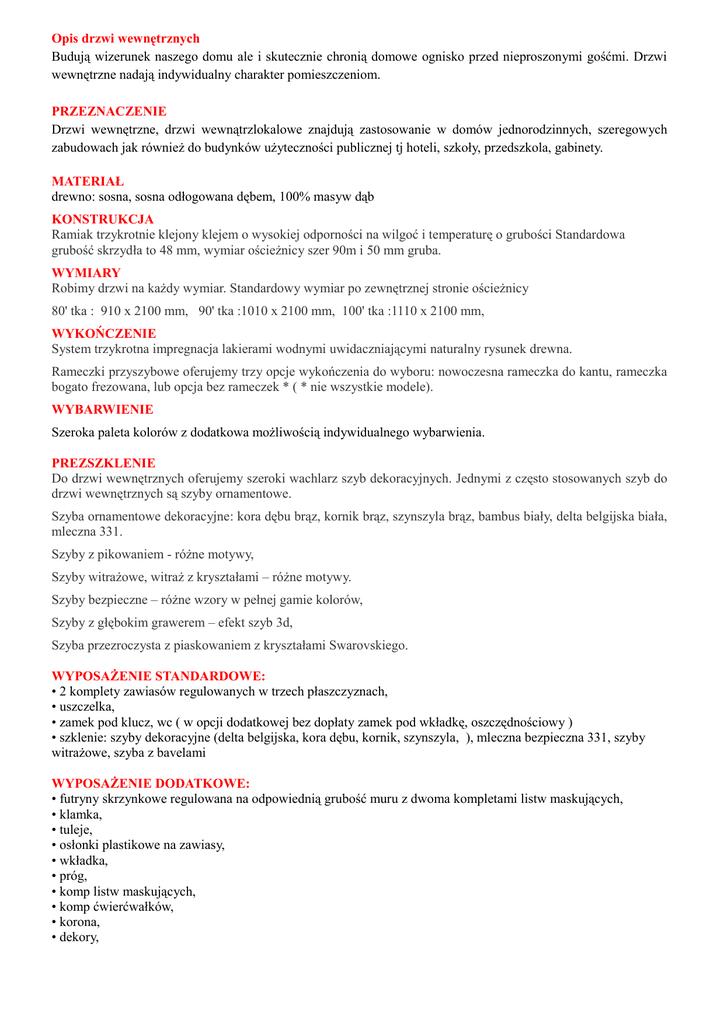 Opis drzwi wewnętrznych Budują wizerunek naszego domu ale i skutecznie chronią domowe ognisko przed nieproszonymi gośćmi. Drzwi wewnętrzne nadają indywidualny charakter pomieszczeniom. PRZEZNACZENIE Drzwi wewnętrzne, drzwi wewnątrzlokalowe znajdują zastosowanie w domów jednorodzinnych, szeregowych zabudowach jak również do budynków użyteczności publicznej tj hoteli, szkoły, przedszkola, gabinety. MATERIAŁ drewno: sosna, sosna odłogowana dębem, 100% masyw dąb KONSTRUKCJA Ramiak trzykrotnie klejony klejem o wysokiej odporności na wilgoć i temperaturę o grubości Standardowa grubość skrzydła to 48 mm, wymiar ościeżnicy szer 90m i 50 mm gruba. WYMIARY Robimy drzwi na każdy wymiar. Standardowy wymiar po zewnętrznej stronie ościeżnicy 80' tka : 910 x 2100 mm, 90' tka :1010 x 2100 mm, 100' tka :1110 x 2100 mm, WYKOŃCZENIE System trzykrotna impregnacja lakierami wodnymi uwidaczniającymi naturalny rysunek drewna. Rameczki przyszybowe oferujemy trzy opcje wykończenia do wyboru: nowoczesna rameczka do kantu, rameczka bogato frezowana, lub opcja bez rameczek * ( * nie wszystkie modele). WYBARWIENIE Szeroka paleta kolorów z dodatkowa możliwością indywidualnego wybarwienia. PREZSZKLENIE Do drzwi wewnętrznych oferujemy szeroki wachlarz szyb dekoracyjnych. Jednymi z często stosowanych szyb do drzwi wewnętrznych są szyby ornamentowe. Szyba ornamentowe dekoracyjne: kora dębu brąz, kornik brąz, szynszyla brąz, bambus biały, delta belgijska biała, mleczna 331. Szyby z pikowaniem - różne motywy, Szyby witrażowe, witraż z kryształami – różne motywy. Szyby bezpieczne – różne wzory w pełnej gamie kolorów, Szyby z głębokim grawerem – efekt szyb 3d, Szyba przezroczysta z piaskowaniem z kryształami Swarovskiego. WYPOSAŻENIE STANDARDOWE: • 2 komplety zawiasów regulowanych w trzech płaszczyznach, • uszczelka, • zamek pod klucz, wc ( w opcji dodatkowej bez dopłaty zamek pod wkładkę, oszczędnościowy ) • szklenie: szyby dekoracyjne (delta belgijska, kora dębu, kornik, szynszyla, ), mleczna bezpieczna 331, szyby witrażowe, szyba z bavelami WYPOSAŻENIE DODATKOWE: • futryny skrzynkowe regulowana na odpowiednią grubość muru z dwoma kompletami listw maskujących, • klamka, • tuleje, • osłonki plastikowe na zawiasy, • wkładka, • próg, • komp listw maskujących, • komp ćwierćwałków, • korona, • dekory, DRZWI PRZESUWNE Każdy model drzwi wewnętrznych może być wykonany jako przesuwne. • prowadnica do drzwi przesuwnych • metalowe rolki, • maskownica, • dolny bolec stabilizujący, • pochwyt jedno, lub dwustronny. Dopłaty: • z pełnego masywu dębowego + 100% • nietypowy wymiar + 15% (drzwi krótsze o nie więcej niż 4cm bez dopłaty ) • szyby fazowane Możliwości wykonania drzwi: - z naświetleniem górnym (na prosto, w łuku), - z dostawką boczną (stałą, lub ruchomą), - z dwoma dostawkami bocznymi, - otwierane do wewnątrz lub na zewnątrz, - w wersji z futryną skrzynkową, - przesuwne po zewnętrznej stronie ściany oraz przesuwne chowane w ścianę- każdy model. - drzwi wewnętrzne wahadłowe („kowbojskie”) - każdy model. Dokumentacja: Aprobata Techniczna ITB AT-15-6912/2012 Atest Higieniczny MK/B/0687/01/2003. Deklaracja zgodności INFORMACJE DODATKOWE Wykonujemy usługę montażu drzwi GWARANCJA: 2 lata dla osób prywatnych, 1 rok dla firm.